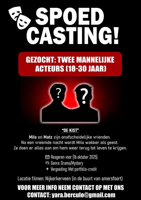 Vena Kok en Yara Berculo, tweedejaars studenten Audiovisueel aan het GLU in Utrecht, zijn voor een opdracht op zoek naar twee mannen tussen de 18 en 30 jaar, liefst met enige acteer- of toneelervaring die op korte termijn willen acteren in een shortfilm. Het gaat om één draaidag. De opnamen vinden plaats in Nijkerkerveen. De datum gaat in overleg. Heb je interesse, neem dan voor 16 oktober contact op via: Yara.berculo@gmail.com