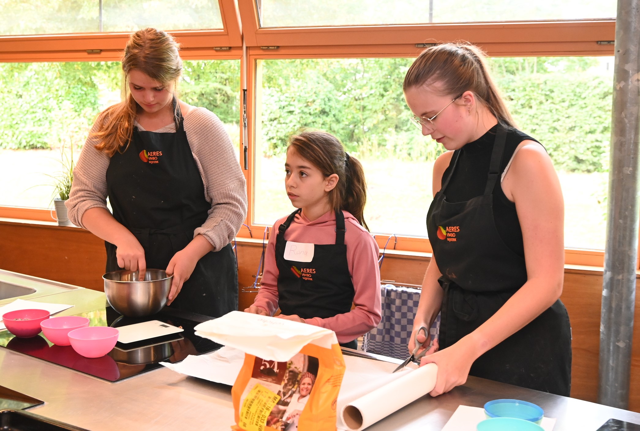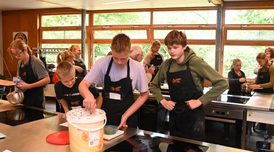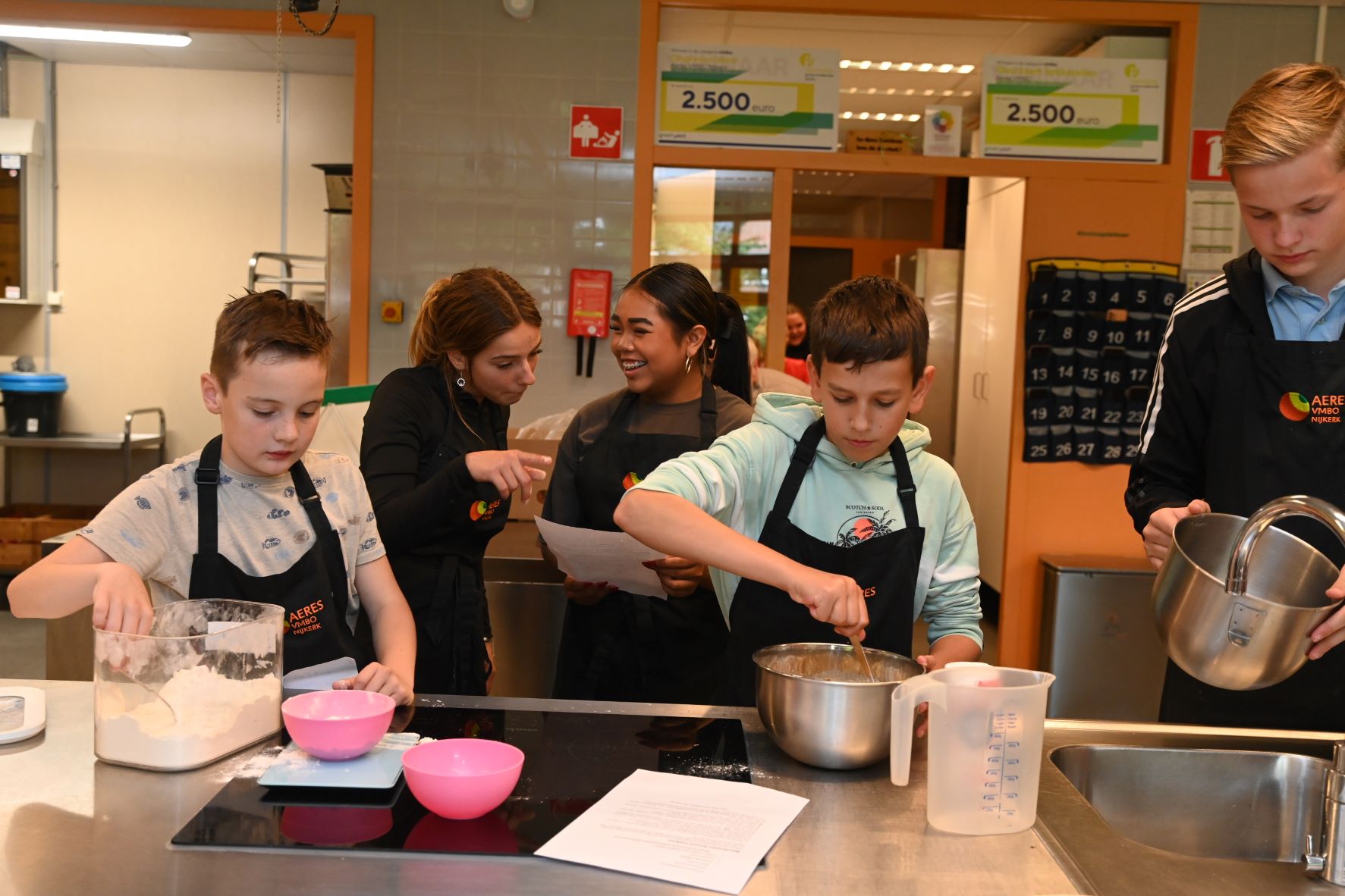 Vrijdagmiddag 6 oktober gingen vier groepen leerlingen, allen vierdejaars met keuzevak Voeding, een product ontwikkelen van bierborstel. Dit restproduct van bier dat boordevol eiwitten en vezels zit was samen met oud fruit de basis om circulair aan de slag te gaan. Zij deden dit in het kader van de Dutch Food Week die plaatsvindt van 7-14 oktober. Het is dus een mooie uitdaging om van deze lokale restproducten mooie producten te maken. De leerlingen gingen hun kennis delen met leerlingen van groep 8 van de Rehobothschool uit Nijkerk. Door het samen bakken en koken gebruikten ze de kennis gelijk om praktisch aan de gang te gaan. Op deze manier wordt weer een nieuwe generatie geleerd om duurzaam te leven. Het bierborstel kwam van Burg Bieren Bierwinkel uit Ermelo en het oude fruit van Fruithal Smits uit Zeewolde. Foto Kees van den Heuvel