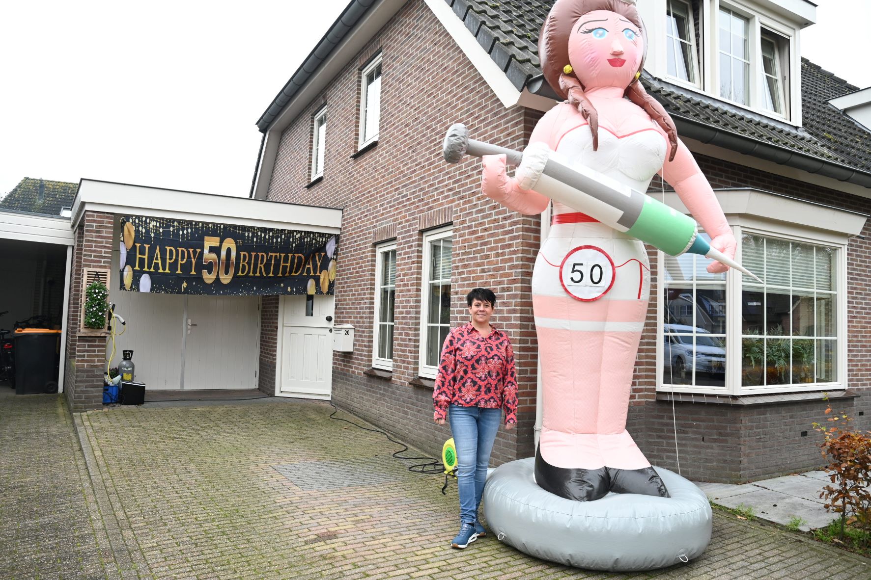 Anja Kroon heeft afgelopen week Sarah gezien, maar viert het feest op zaterdag 8 november. Naast haar woning staat een grote pop waarop een zuster is te zien met een grote spuit. Anja werkt namelijk als verpleegkundige op verzorgingscentrum De Pol in Nijkerk en dus is de gelijkenis treffend. Foto Kees van den Heuvel