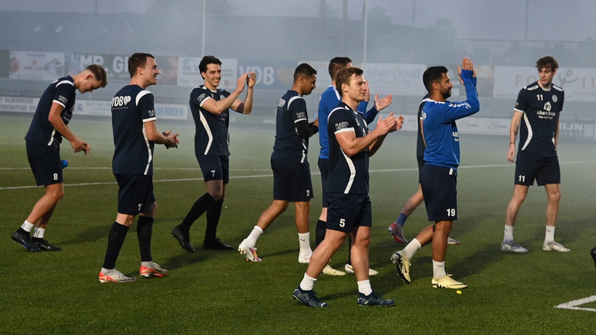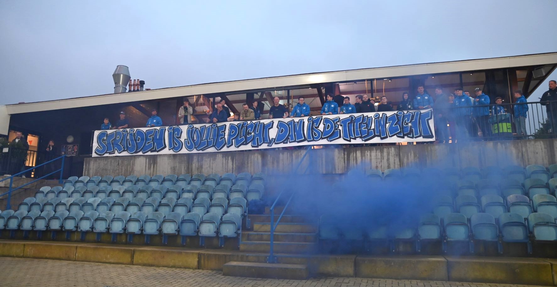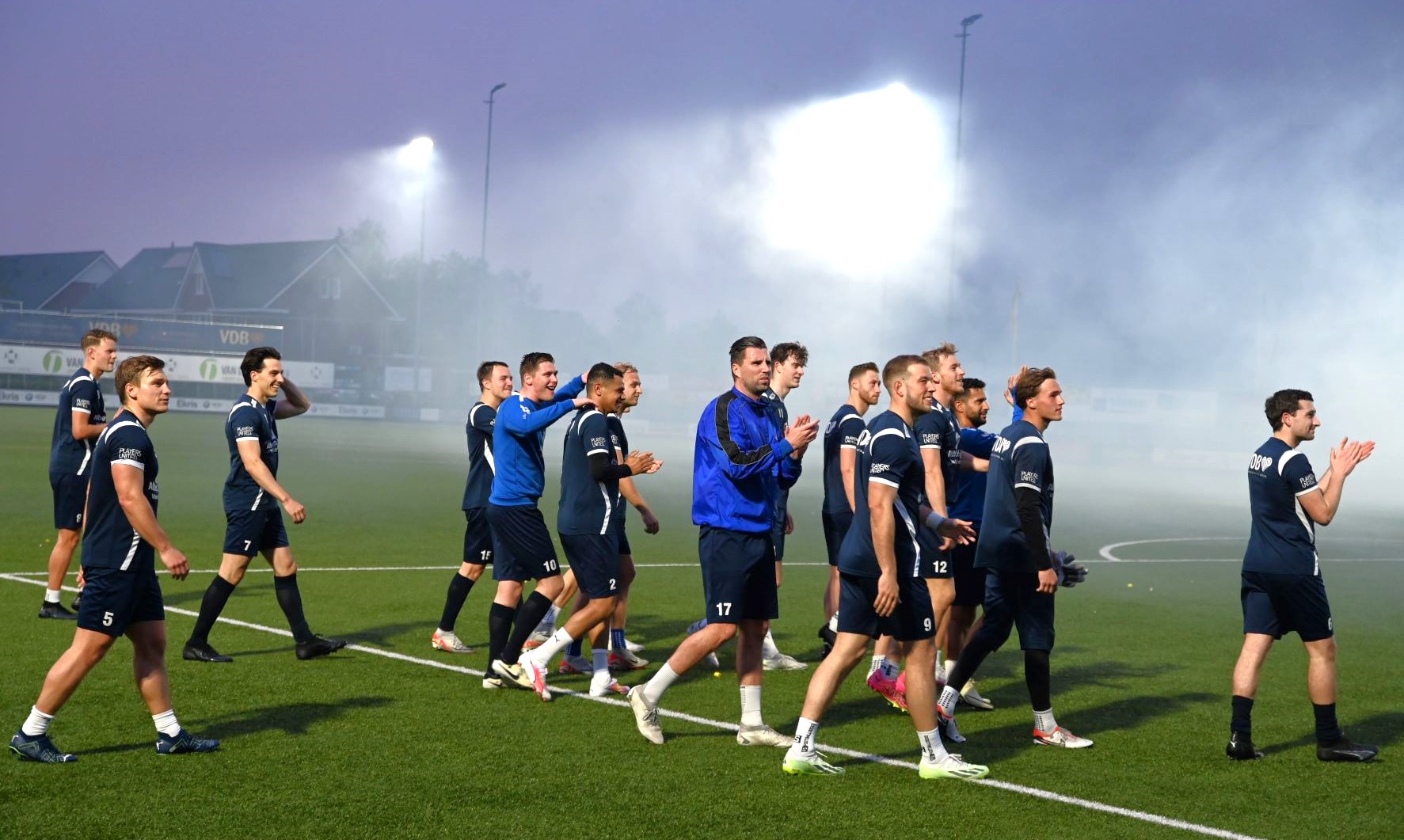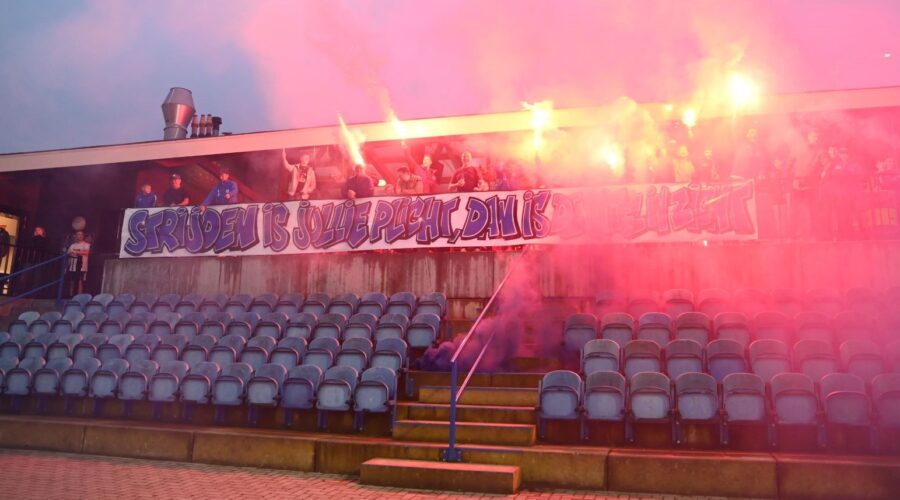 Veensche Boys maakt zich op voor de topper tegen VRC, aanstaande zaterdag 4 mei op het complex van de club uit Nijkerkerveen. Het is de nummer 1 tegen de nummer 2. De laatste training voor de wedstrijd van het jaar was donderdagavond 2 mei het uitgelezen moment voor de supporters om de spelers nog eens te laten blijken hoe belangrijk de wedstrijd is. Met het uitrollen van een spandoek, waarop stond ‘Strijden is jullie plicht, dan is de titel in zicht’ en het afsteken van veel vuurwerk en fakkels werd massaal een bemoediging gegeven aan de spelers van Veensche Boys. Dat werd enorm gewaardeerd door de spelers en zij gaven door de vuurwerkwolken heen een welgemeend applaus. Foto Kees van den Heuvel