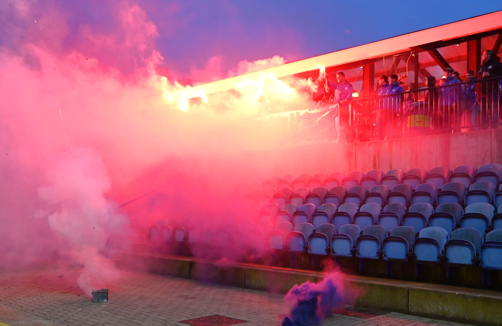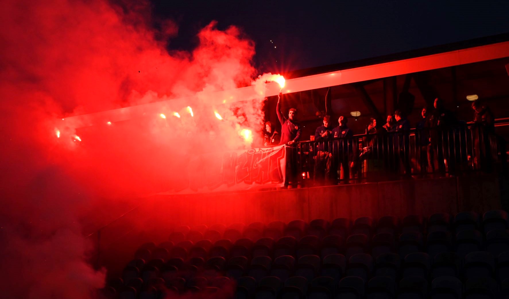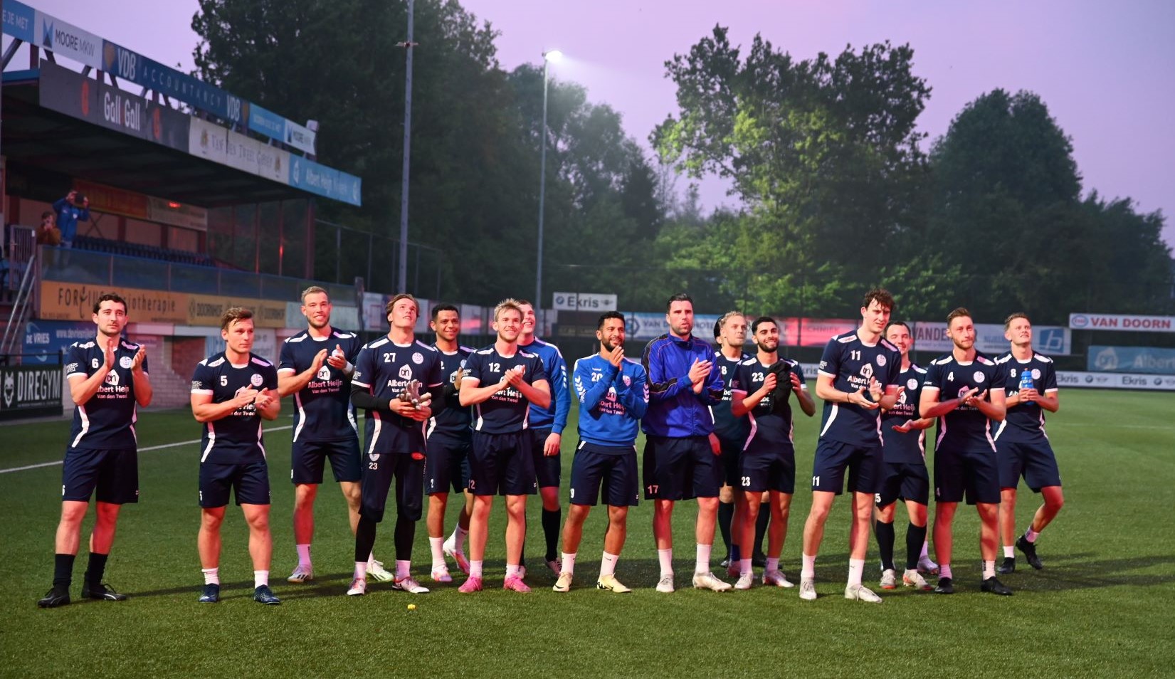 Veensche Boys maakt zich op voor de topper tegen VRC, aanstaande zaterdag 4 mei op het complex van de club uit Nijkerkerveen. Het is de nummer 1 tegen de nummer 2. De laatste training voor de wedstrijd van het jaar was donderdagavond 2 mei het uitgelezen moment voor de supporters om de spelers nog eens te laten blijken hoe belangrijk de wedstrijd is. Met het uitrollen van een spandoek, waarop stond ‘Strijden is jullie plicht, dan is de titel in zicht’ en het afsteken van veel vuurwerk en fakkels werd massaal een bemoediging gegeven aan de spelers van Veensche Boys. Dat werd enorm gewaardeerd door de spelers en zij gaven door de vuurwerkwolken heen een welgemeend applaus. Foto Kees van den Heuvel