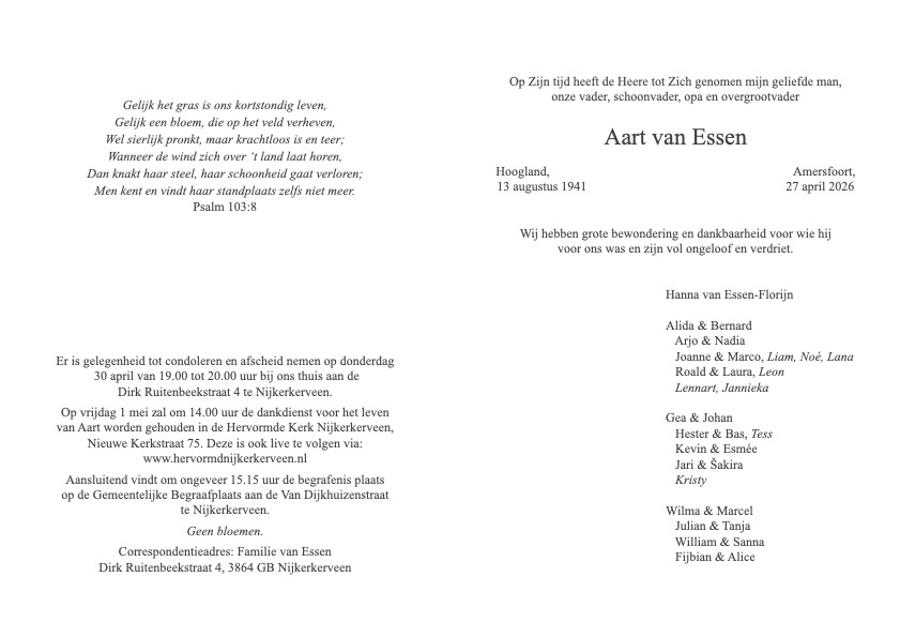 Er is gelegenheid tot condoleren en afscheid nemen en afscheid nemen op donderdag 30 april van 19.00 uur tot 20.00 uur bij de familie van Essen thuis aan de Dirk Ruitenbeekstraat 4 in Nijkerkerveen.