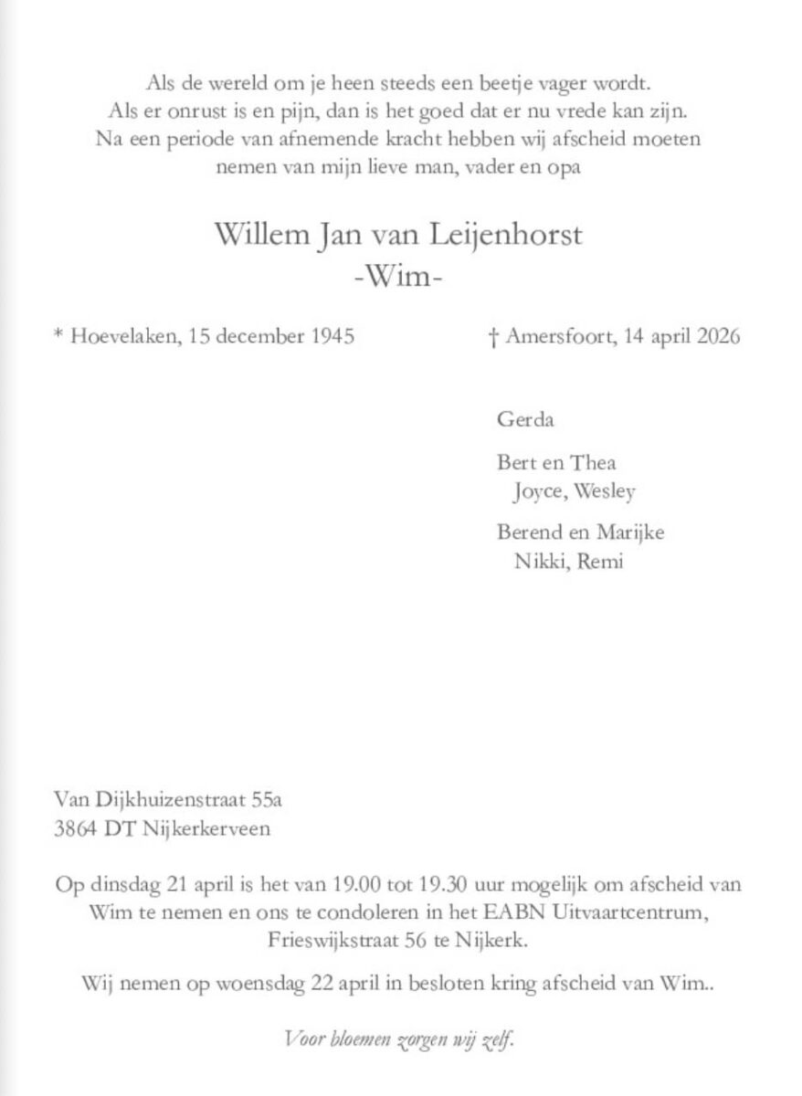 Op dinsdag 21 april is er van 19.00 tot 19.30 uur gelegenheid om afscheid van Wim te nemen en de familie te condoleren in het EABN Uitvaartcentrum, Frieswijkstraat 56 te Nijkerk.