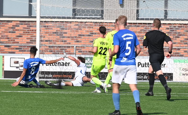 Op het hete kunstgras van sportpark Puttereng dreigde aanvankelijk een complete afgang voor SDC Putten. Veensche Boys kwam binnen een half uur op een comfortabele 0-3 voorsprong, mede doordat de verdediging van Putten door het pressievoetbal van de Blauwe Helden helemaal murw werd gespeeld. De eerste goal werd namens de Boys gemaakt door Julian Buitenhuis die een simpel zijwaarts geleverd schot in de goal zag hobbelen. Doelman Theodorie Velanas had de bal zeker kunnen tegenhouden, maar leek helemaal gedesorienteerd. De tweede goal was een kopbal van Levi Haringsma na een voorzet van Nico van den Brom. Meestal is Levi altijd al een lachebek, ook al staat Veensche Boys met 0-7 achter, maar toen hij een goal maakte was hij helemaal in zijn nopjes getuige de vreugde-explosie op het veld. Even later werd het zelfs 0-3: Julian Buitenhuis zette de bal voor richting Nico van den Brom en die had vrij spel voor de keeper. Ondertussen had Corné Parol ook nog kunnen scoren, maar de bal belandde dusdanig keihard op de keeper, dat hij er zaterdagavond nog last van zal hebben. Wessel Bosman, de invalkeeper van Veensche Boys, had eigenlijk weinig te doen. Hij werkte een bal van Putten nog wel katachtig uit zijn goalgebied. Wat er daarna in de rust is gebeurd, is alleen maar gissen. SDC Putten kwam als herboren uit de kleedkamers en overrompelde Veensche Boys en binnen een kwartier tijd was de stand weer terug gebracht naar 3-3. De eerste goal viel al in de eerste minuut van de tweede helft: Roelf Oosterhoff scoort uit een voorzet van Saber Charif. Twee minuten kon Sabir Akachaou Achefay vrij inschieten, maar de bal kreeg hij niet onder controle en hij schoot hoog over. Nog geen minuut daarna werkte Achefay de bal alsnog binnen. Nog in de zestigste minuut maakte Buter de 3-3 in de korte hoek. Het was wachten op de volgende goal van Putten en die kwam er ook via Saber Charif. Julian Buitenhuis maakte in de tweede helft ook nog een goal maar die werd wegens buitenspel afgekeurd. Volgende week is de laatste bekerwedstrijd tegen FC Horst. Foto Kees van den Heuvel