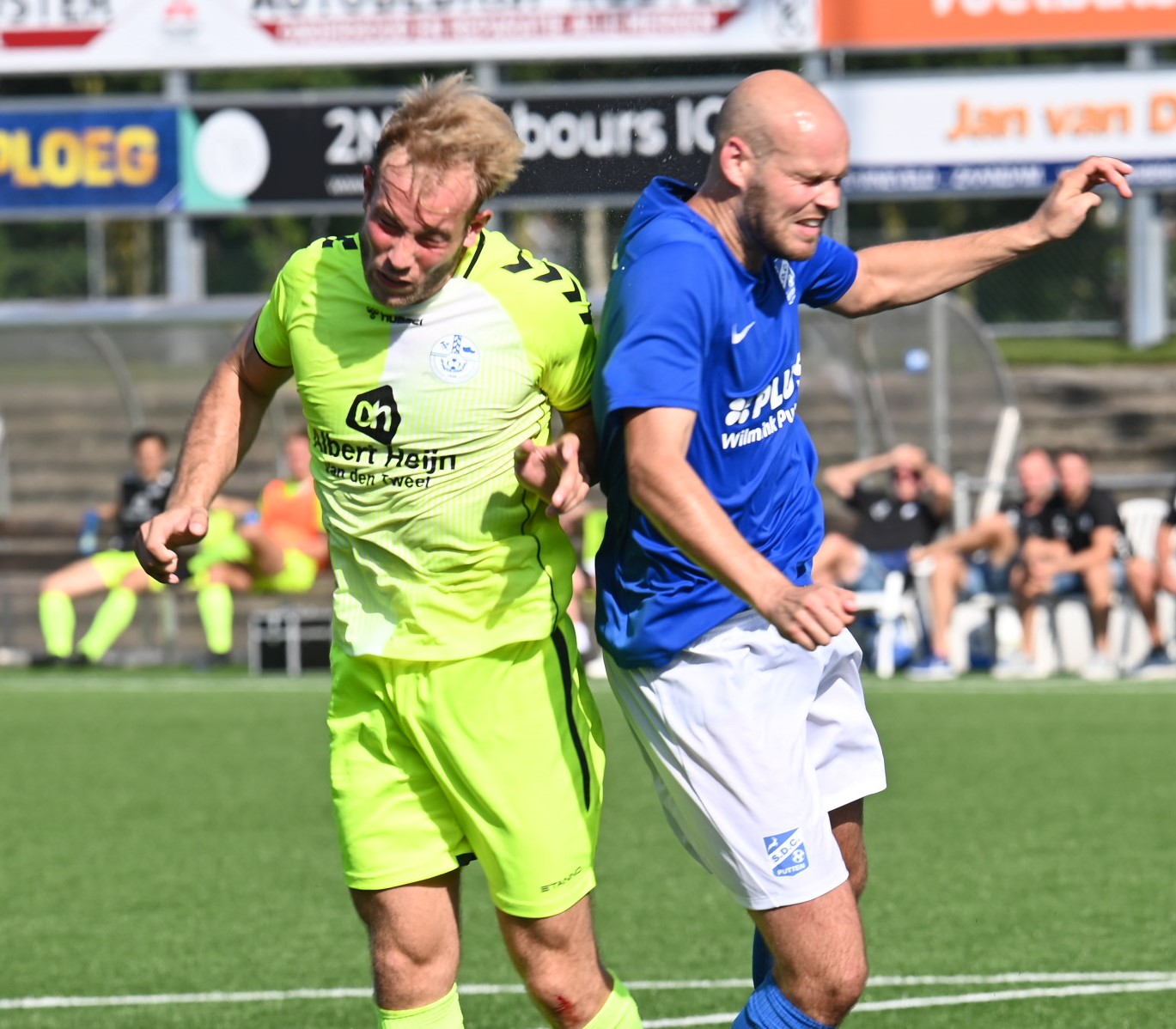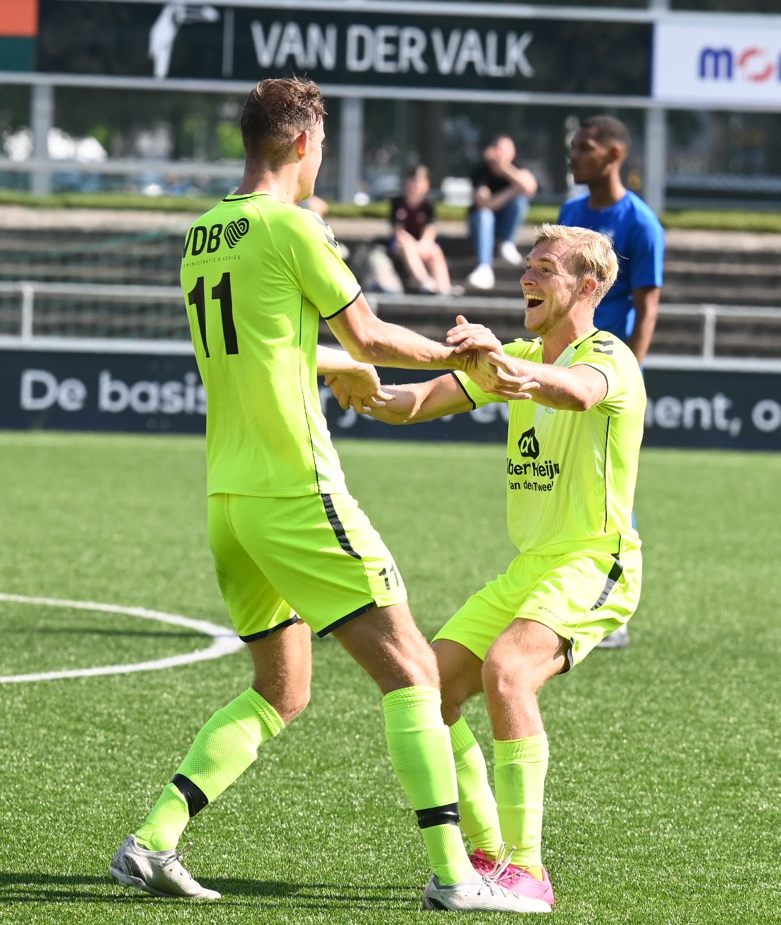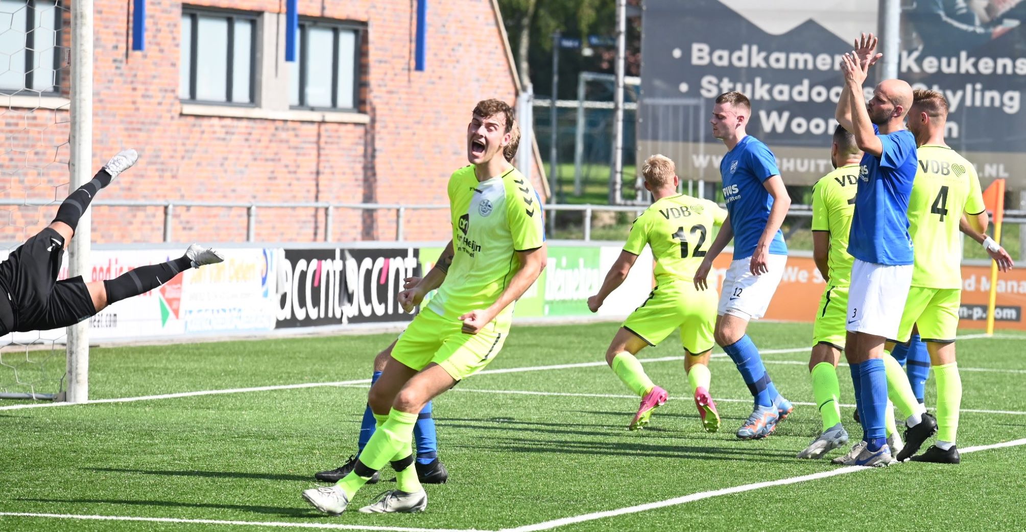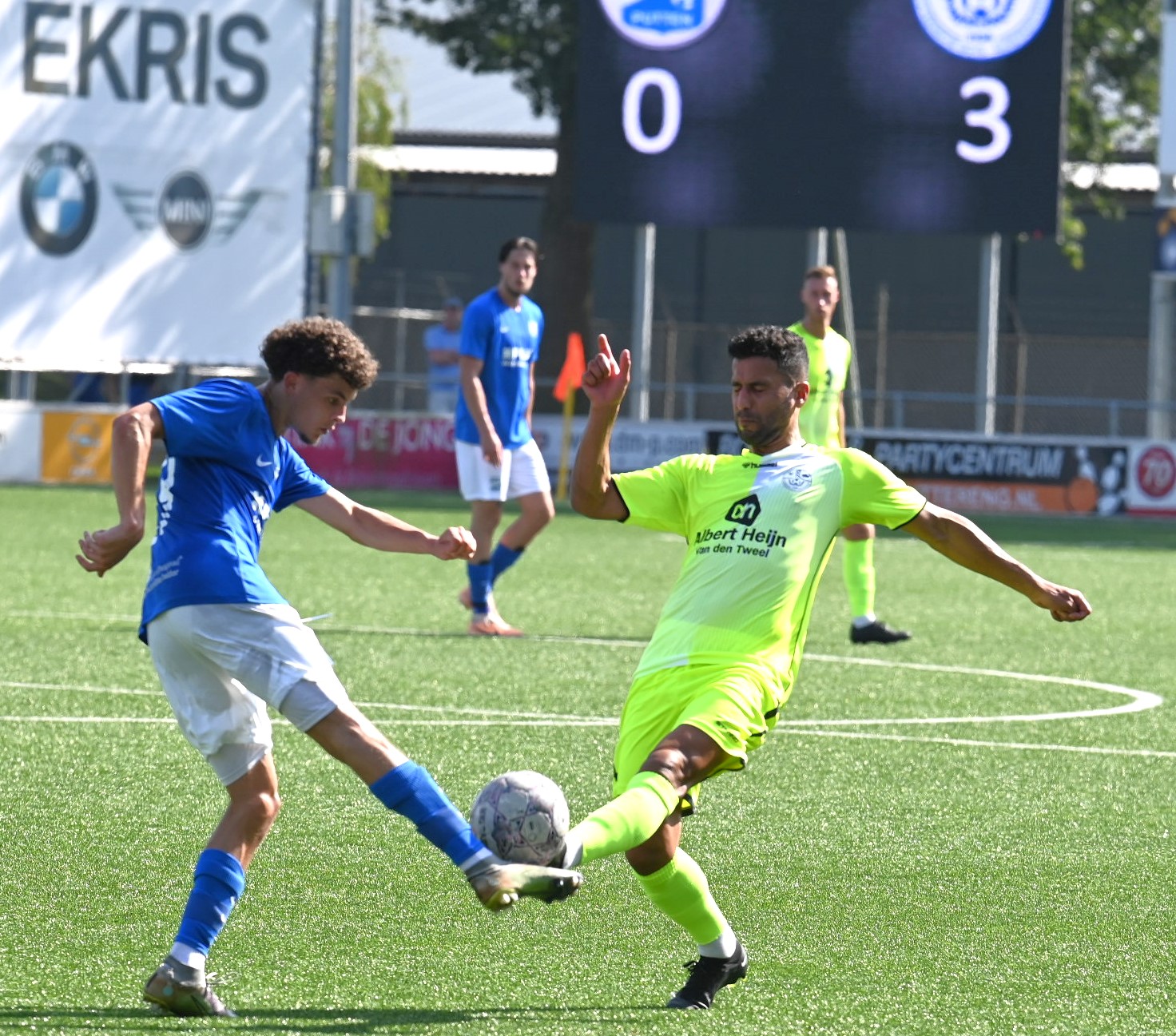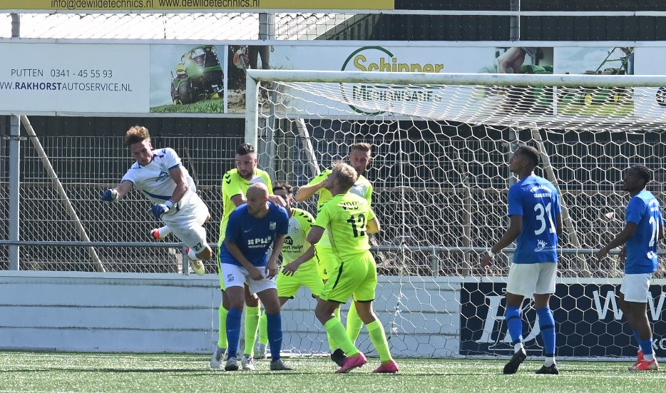 Op het hete kunstgras van sportpark Puttereng dreigde aanvankelijk een complete afgang voor SDC Putten. Veensche Boys kwam binnen een half uur op een comfortabele 0-3 voorsprong, mede doordat de verdediging van Putten door het pressievoetbal van de Blauwe Helden helemaal murw werd gespeeld. De eerste goal werd namens de Boys gemaakt door Julian Buitenhuis die een simpel zijwaarts geleverd schot in de goal zag hobbelen. Doelman Theodorie Velanas had de bal zeker kunnen tegenhouden, maar leek helemaal gedesorienteerd. De tweede goal was een kopbal van Levi Haringsma na een voorzet van Nico van den Brom. Meestal is Levi altijd al een lachebek, ook al staat Veensche Boys met 0-7 achter, maar toen hij een goal maakte was hij helemaal in zijn nopjes getuige de vreugde-explosie op het veld. Even later werd het zelfs 0-3: Julian Buitenhuis zette de bal voor richting Nico van den Brom en die had vrij spel voor de keeper. Ondertussen had Corné Parol ook nog kunnen scoren, maar de bal belandde dusdanig keihard op de keeper, dat hij er zaterdagavond nog last van zal hebben. Wessel Bosman, de invalkeeper van Veensche Boys, had eigenlijk weinig te doen. Hij werkte een bal van Putten nog wel katachtig uit zijn goalgebied. Wat er daarna in de rust is gebeurd, is alleen maar gissen. SDC Putten kwam als herboren uit de kleedkamers en overrompelde Veensche Boys en binnen een kwartier tijd was de stand weer terug gebracht naar 3-3. De eerste goal viel al in de eerste minuut van de tweede helft: Roelf Oosterhoff scoort uit een voorzet van Saber Charif. Twee minuten kon Sabir Akachaou Achefay vrij inschieten, maar de bal kreeg hij niet onder controle en hij schoot hoog over. Nog geen minuut daarna werkte Achefay de bal alsnog binnen. Nog in de zestigste minuut maakte Buter de 3-3 in de korte hoek. Het was wachten op de volgende goal van Putten en die kwam er ook via Saber Charif. Julian Buitenhuis maakte in de tweede helft ook nog een goal maar die werd wegens buitenspel afgekeurd. Volgende week is de laatste bekerwedstrijd tegen FC Horst. Foto Kees van den Heuvel