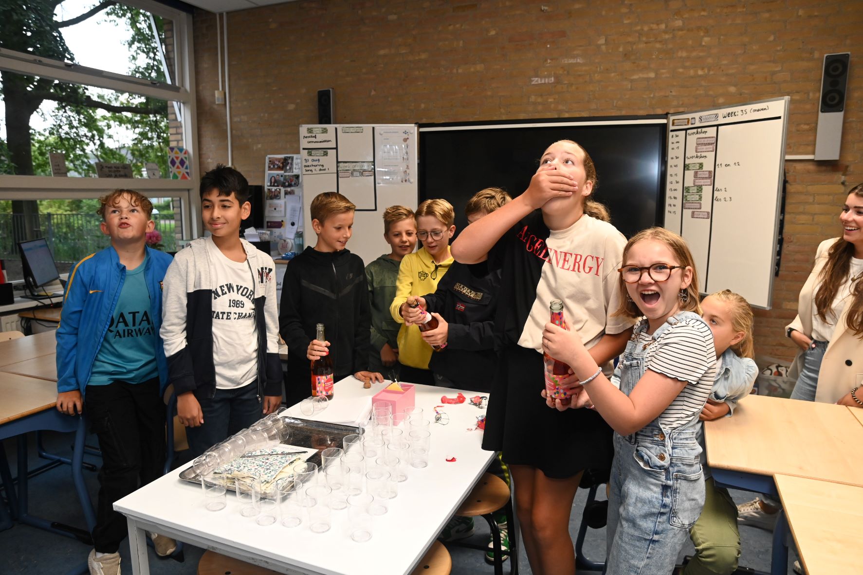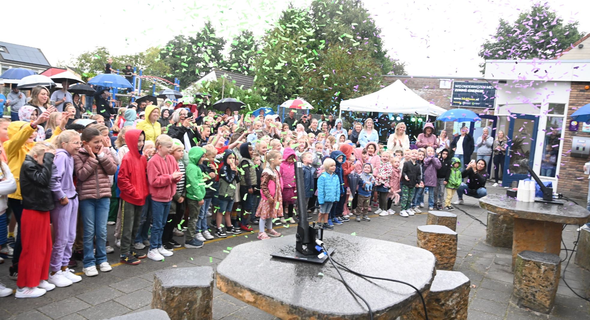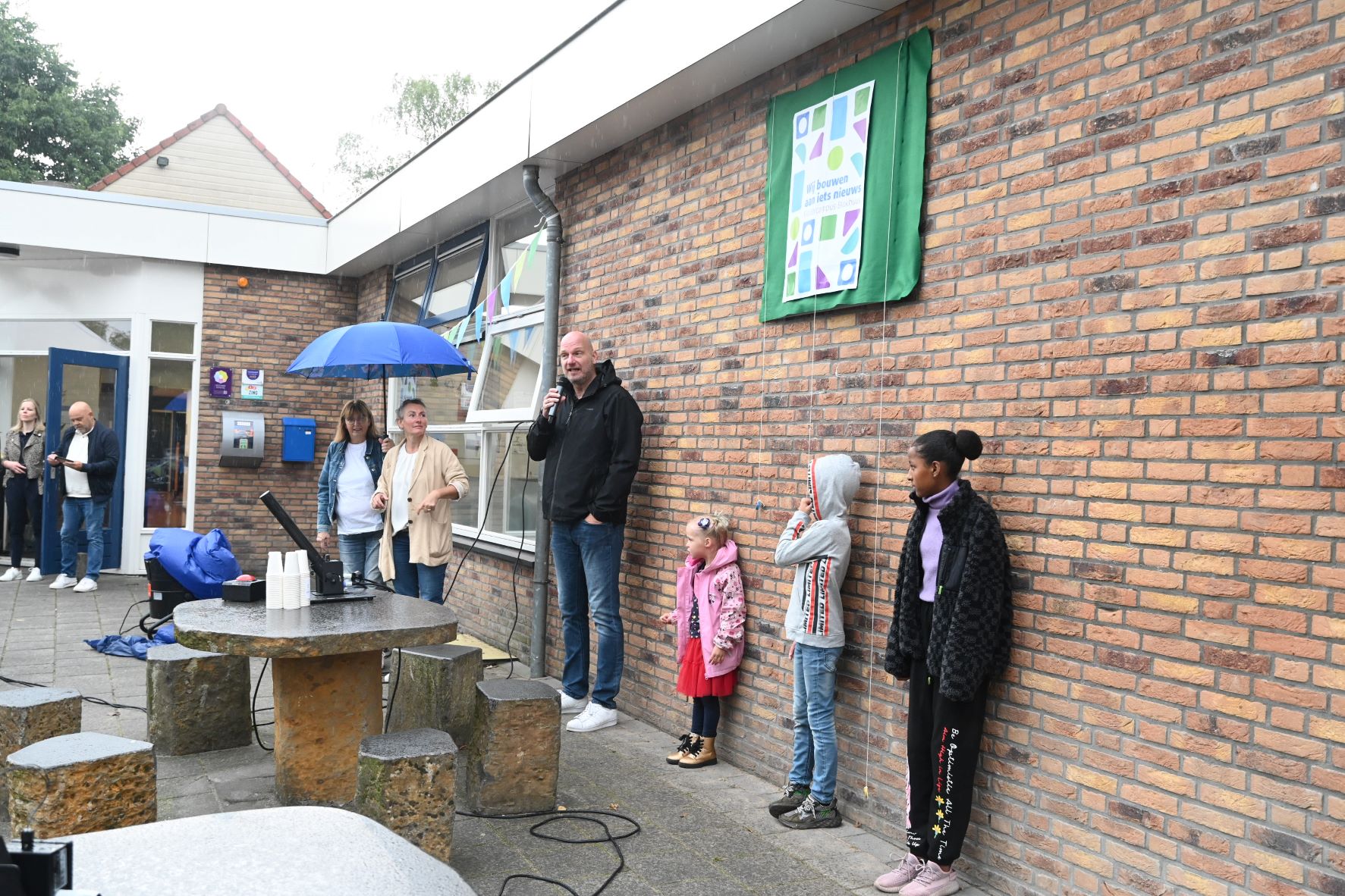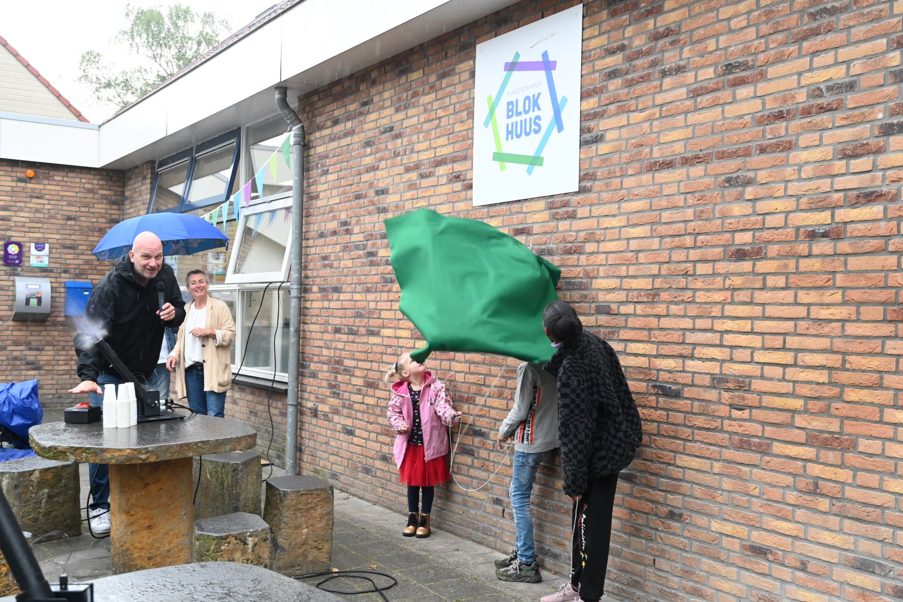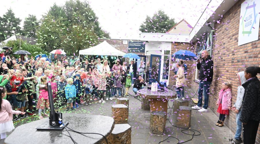 Met een confettiregen is woensdagmorgen 30 augustus de nieuwe naam en logo onthuld van het Blokhuus in Hoevelaken. Het is voortaan niet meer basisschool ’t Blokhuus maar Kindercampus Blokhuus. Het logo heeft een zeshoekige vorm gekregen. Drie leerlingen onthulden het logo door een doek te verwijderen. Het motto is ‘Samen bouwen aan de toekomst’. Daarmee wordt niet alleen gewezen op de samenwerking met HumanKind, maar ook op de toekomstige nieuwbouw. Kindercampus Blokhuus verhuist namelijk niet naar de nieuwe Hoevelakense woonwijk Klaarwater, maar opteert voor nieuwbouw op de huidige locatie. Directeur Dennis Peek zegt stellig: ,,We geven hiermee richting aan de innovatie en de ambitie van de school.” Omdat het buiten regende vonden de festiviteiten in de school zelf plaats. Onder meer werd kinderchampagne ontkurkt en taart uitgedeeld met uiteraard het nieuwe logo. Foto Kees van den Heuvel