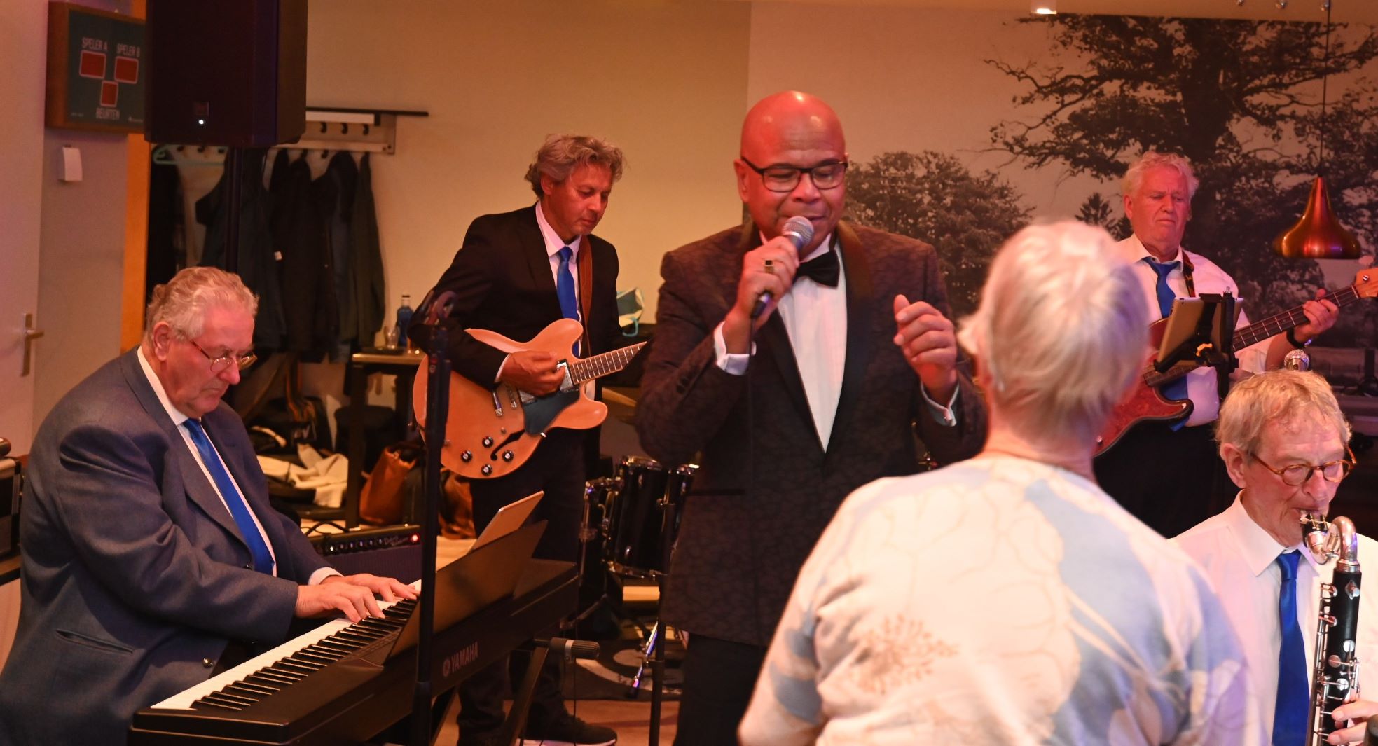 Liefhebbers van bigbandmuziek kwamen 28 november aan hun trekken toen de Blue Basement Bigband uit Hoevelaken een swingend optreden verzorgde in de grote zaal van de Kopperhof in Hoevelaken. De Blue Basement Bigband is een bigband uit Hoevelaken, bestaande uit twintig muzikanten, waaronder blazers (trompetten, trombones, saxofoons), een ritmesectie (contrabas, gitaar, piano, slagwerk) en een basklarinet. De band is ontstaan uit de Fanfare Te Hoevelaken die in 1928 werd opgericht en speelt een repertoire van zowel oude als moderne bigbandmuziek, waaronder nummers van artiesten als Duke Ellington en Count Basie, maar ook muziek in de stijlen bebop, latin, pop, rock en funk. Foto Kees van den Heuvel
