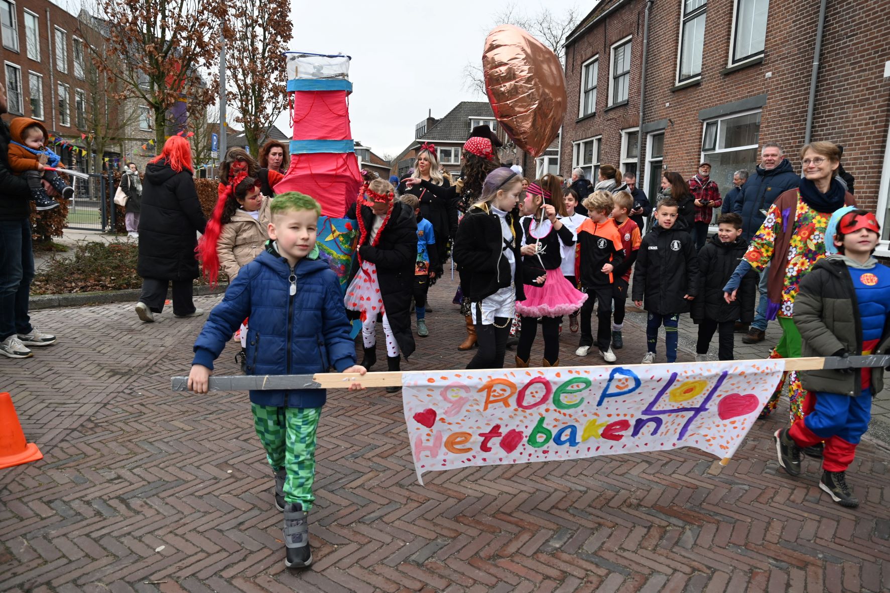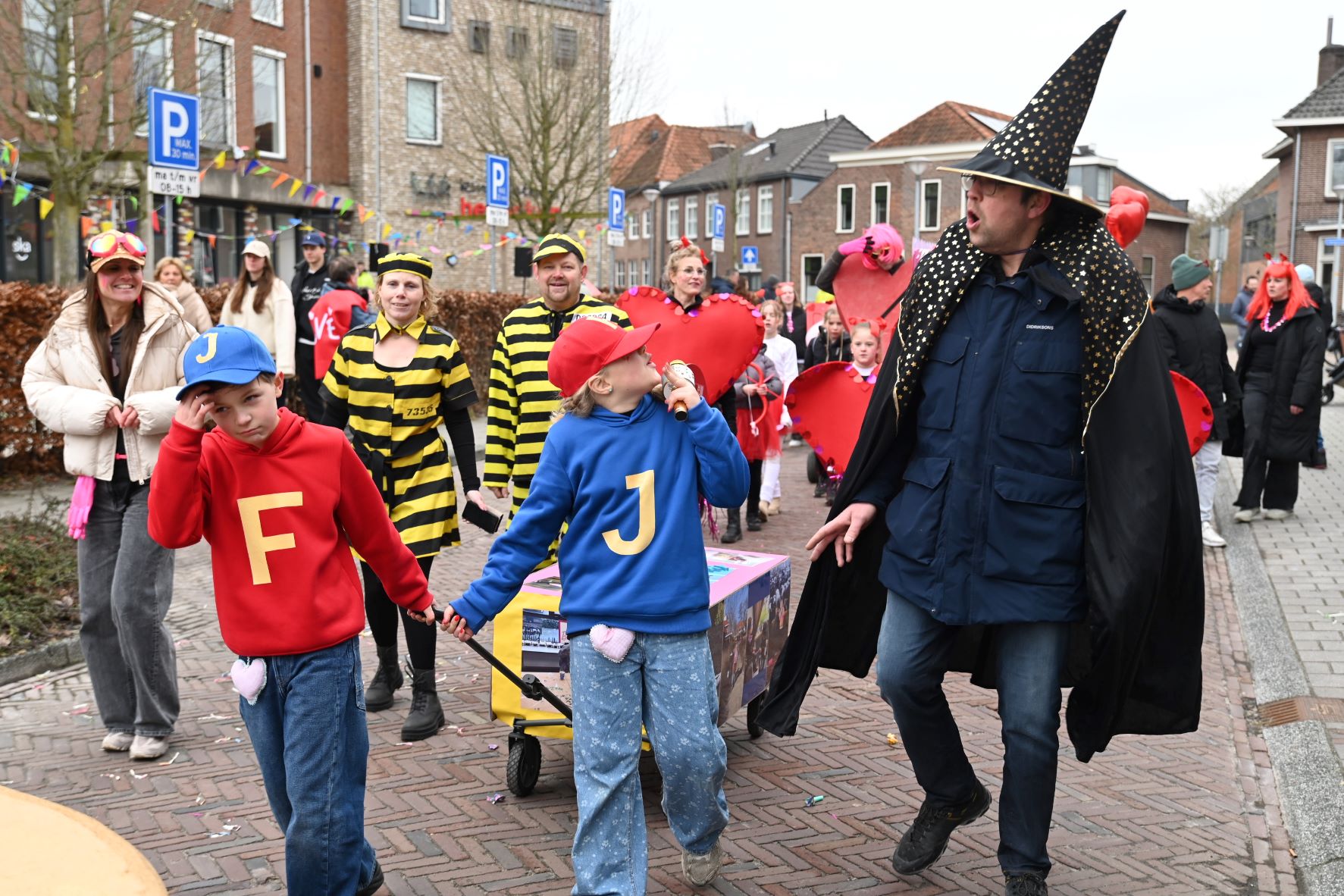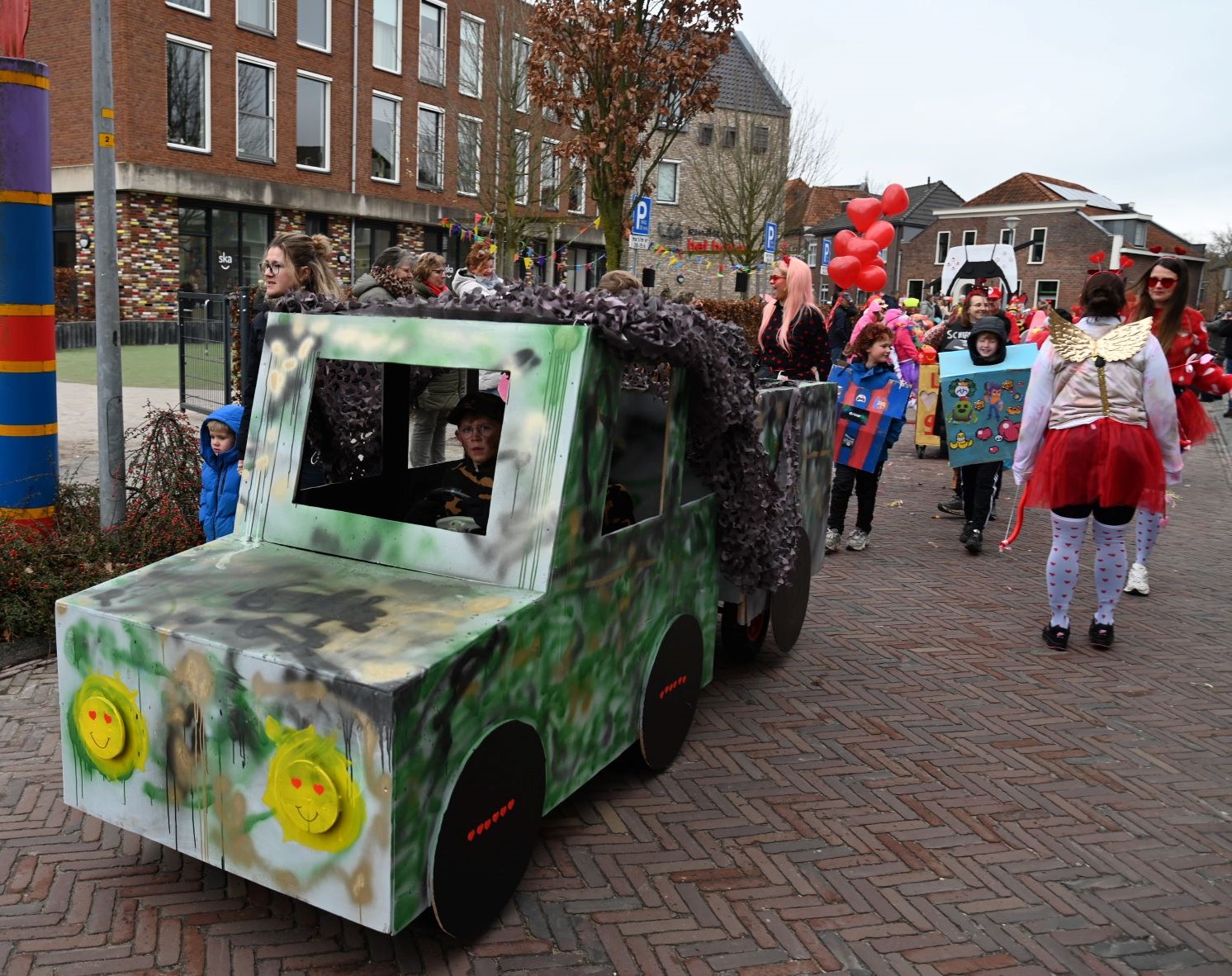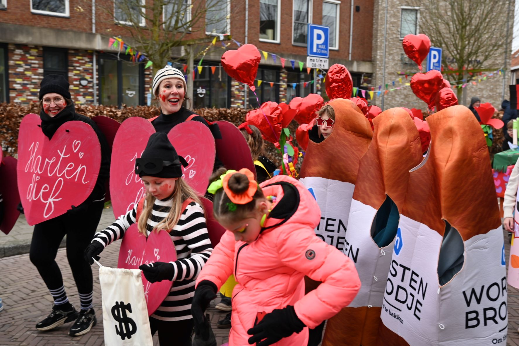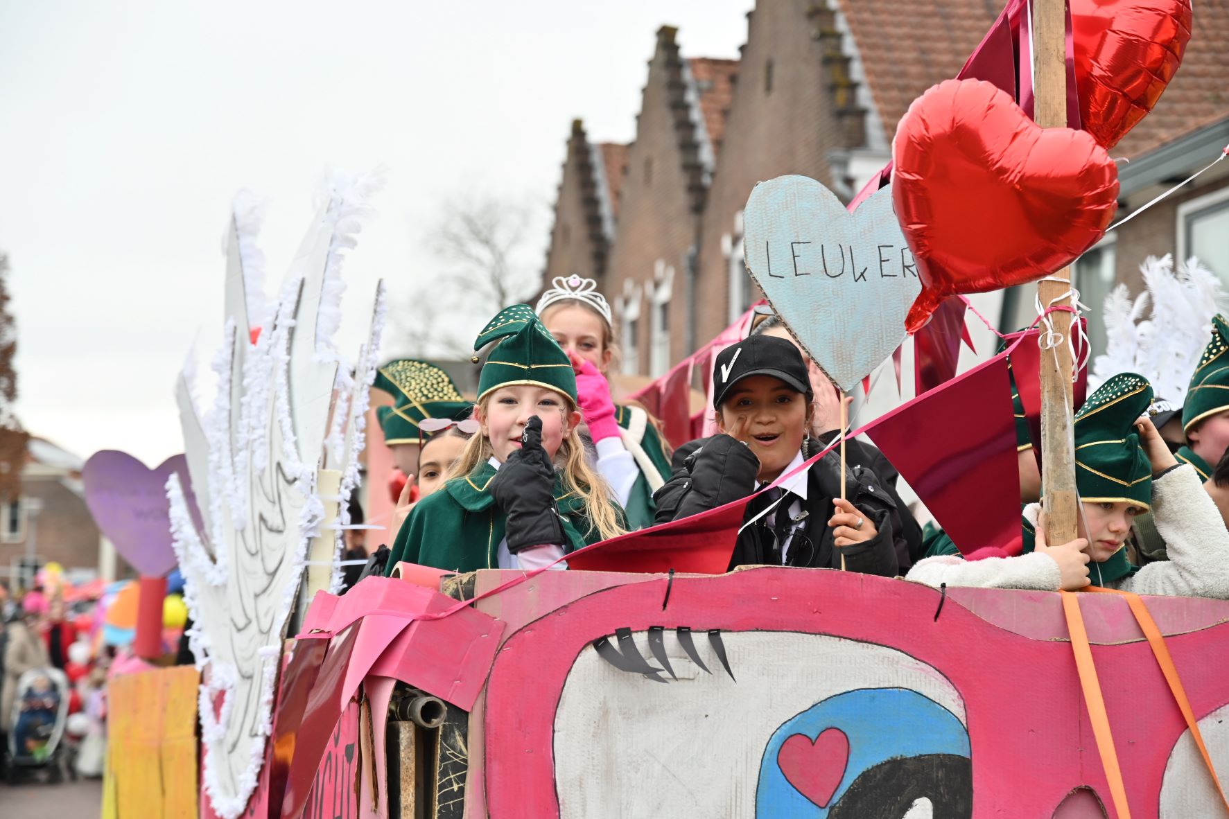 Basisschool Het Baken vierd vrijdag 13 februari carnaval. Het thema dit jaar ws: ‘Carnaval op Het Baken, is liefde op het eerste gezicht!’ Veel kinderen waren verkleed als de kleur van de liefde. De leerlingen hadden de afgelopen weken hard gewerkt aan mooie carnavalswagens. Zo was er een brandweerwagen, maar ook een legervoertuig en drie worstenbroodjes. De kinderen begonnen de dag feestelijk in de klas, waarna alle klassen zich gingen opstellen in de Groenestraat voor de optocht door de stad. De stoet werd vergezeld door de Nijkerkse carnavalsvereniging De Doordouwers. Zij hadden een wagen met een rat aan het spit. Er werd alvast een klein voorproefje gegund van de wagen die aan de grote carnavalsoptocht in Hoogland gaat meedoen. Foto Kees van den Heuvel / Dayn van de Pol