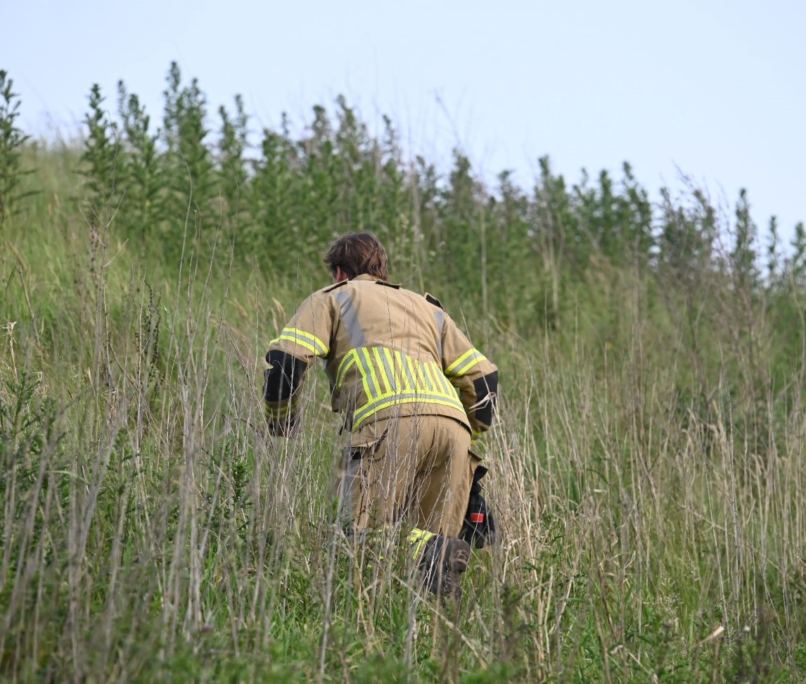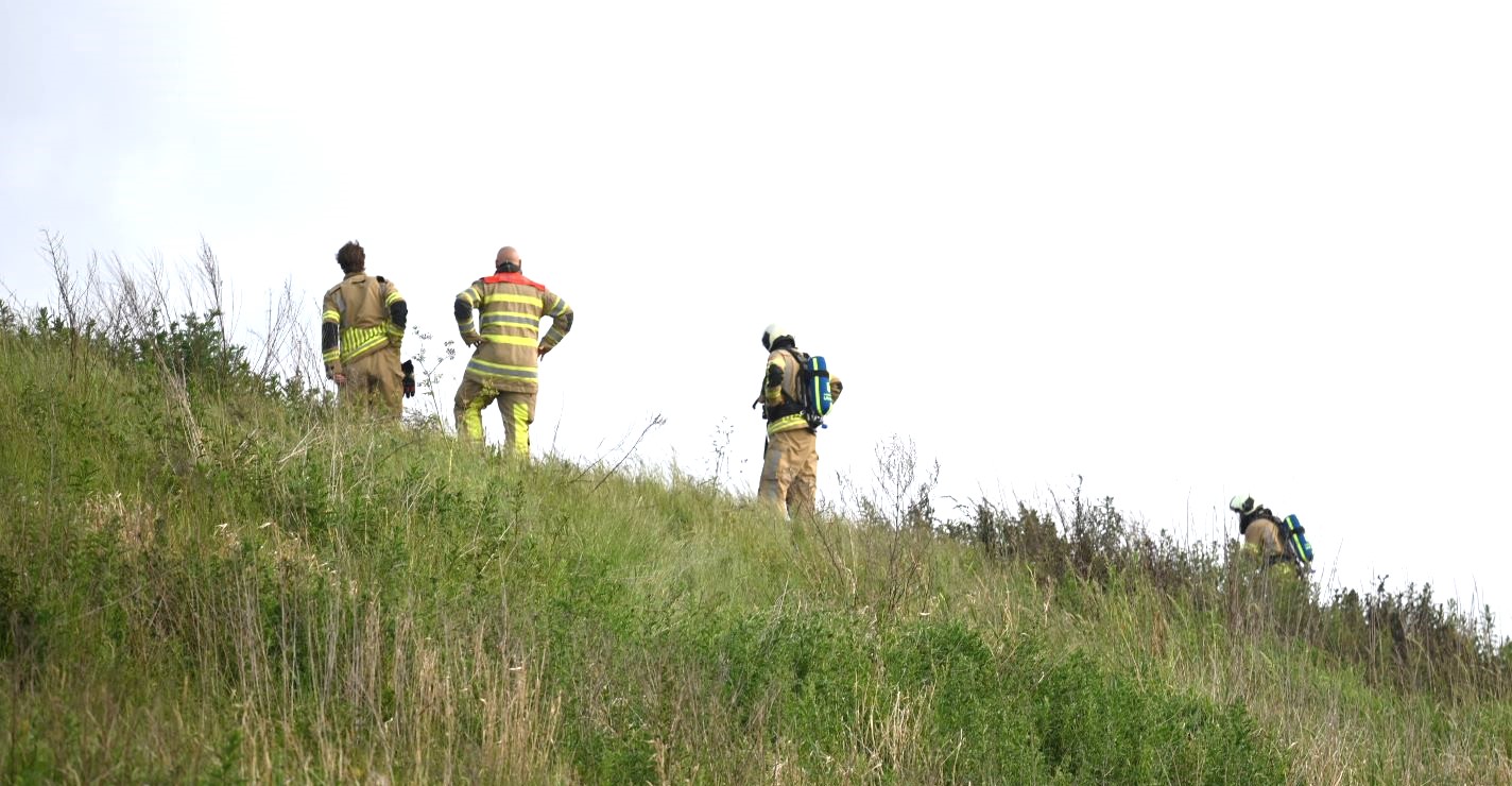 Op het talud tussen Hooglanderveen en de Nijkerkerstraat is zondagavond 1 juni een brand uitgebroken. De brandweer kon de brandhaard moeilijk bereiken, aangezien het aan de binnenkant van het talud was, langs de zijde van de snelweg A28. Uiteindelijk kon de brand alsnog worden geblust. Het is onbekend hoe het talud in de brand kon worden gestoken. Foto Kees van den Heuvel