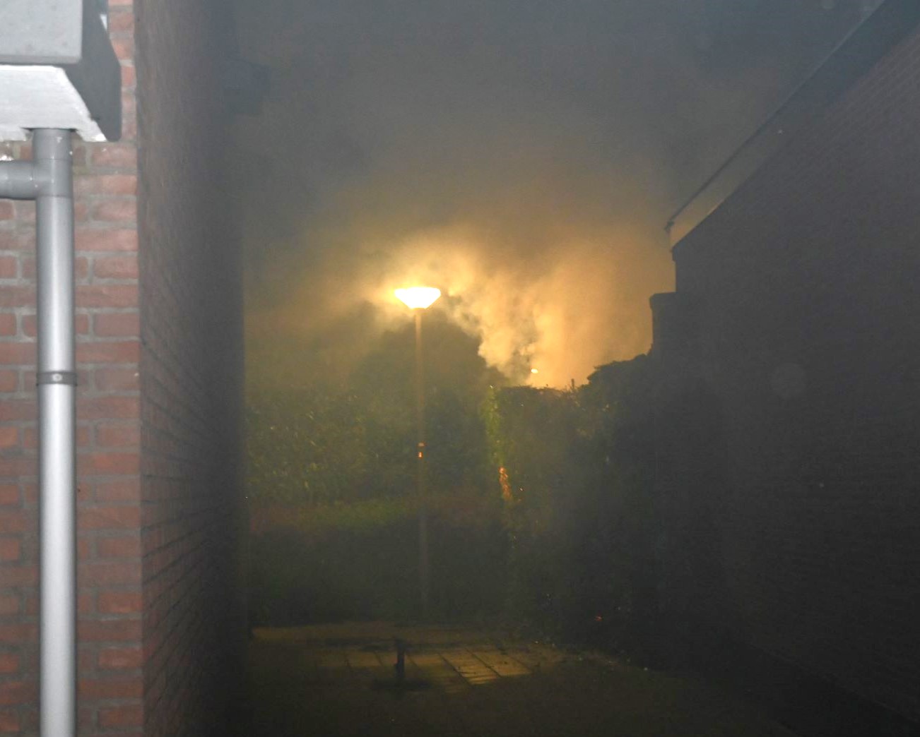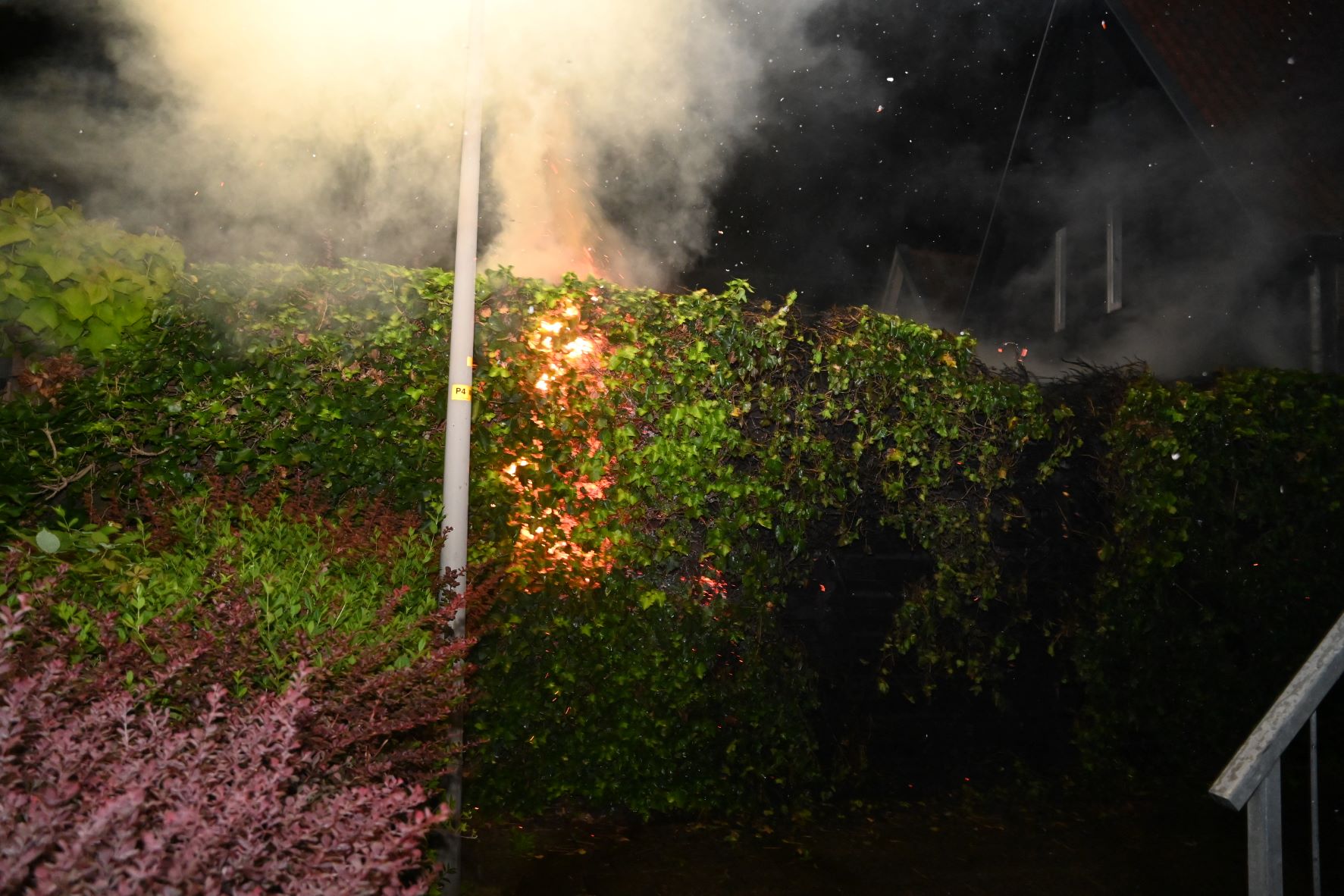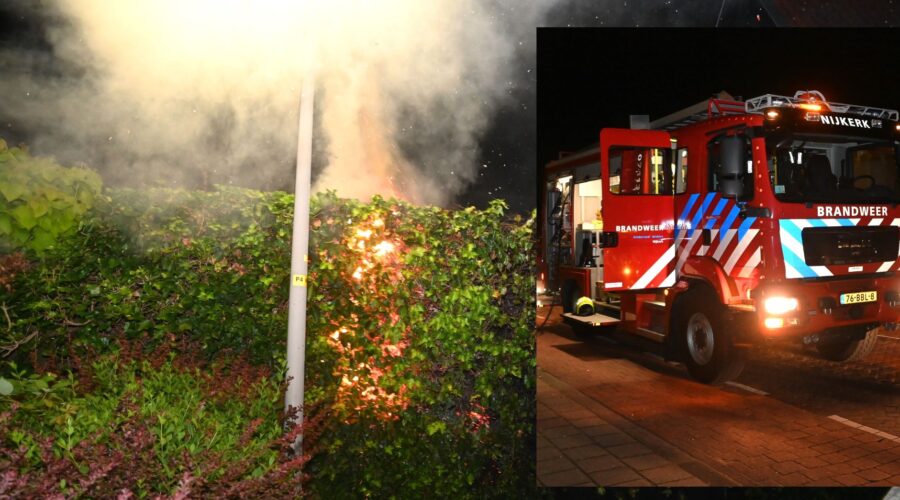 Door onbekende oorzaak is in de nacht van donderdag 17 op vrijdag 18 augustus een haag in de fik gegaan achter het woningenblok van De Ronde Zeven in Nijkerk. De brand brak circa 1.15 uur uit. Omwonenden hoorden voorafgaande aan de brand een enorme harde knal. De brandweer bestreed de brand via de Torenstraat, echter de brand zette ook door aan de zijde van de Ronde Zeven. De brandweer zette voorts een warmtebeeldcamera in. Het gebeuren werd aanschouwd door veel publiek dat afkomstig was van de Nacht van Nijkerk dat om de hoek werd gehouden. Foto Kees van den Heuvel