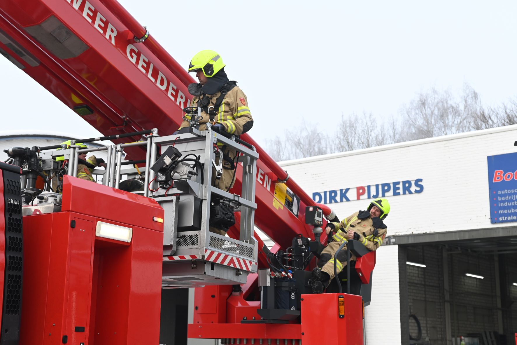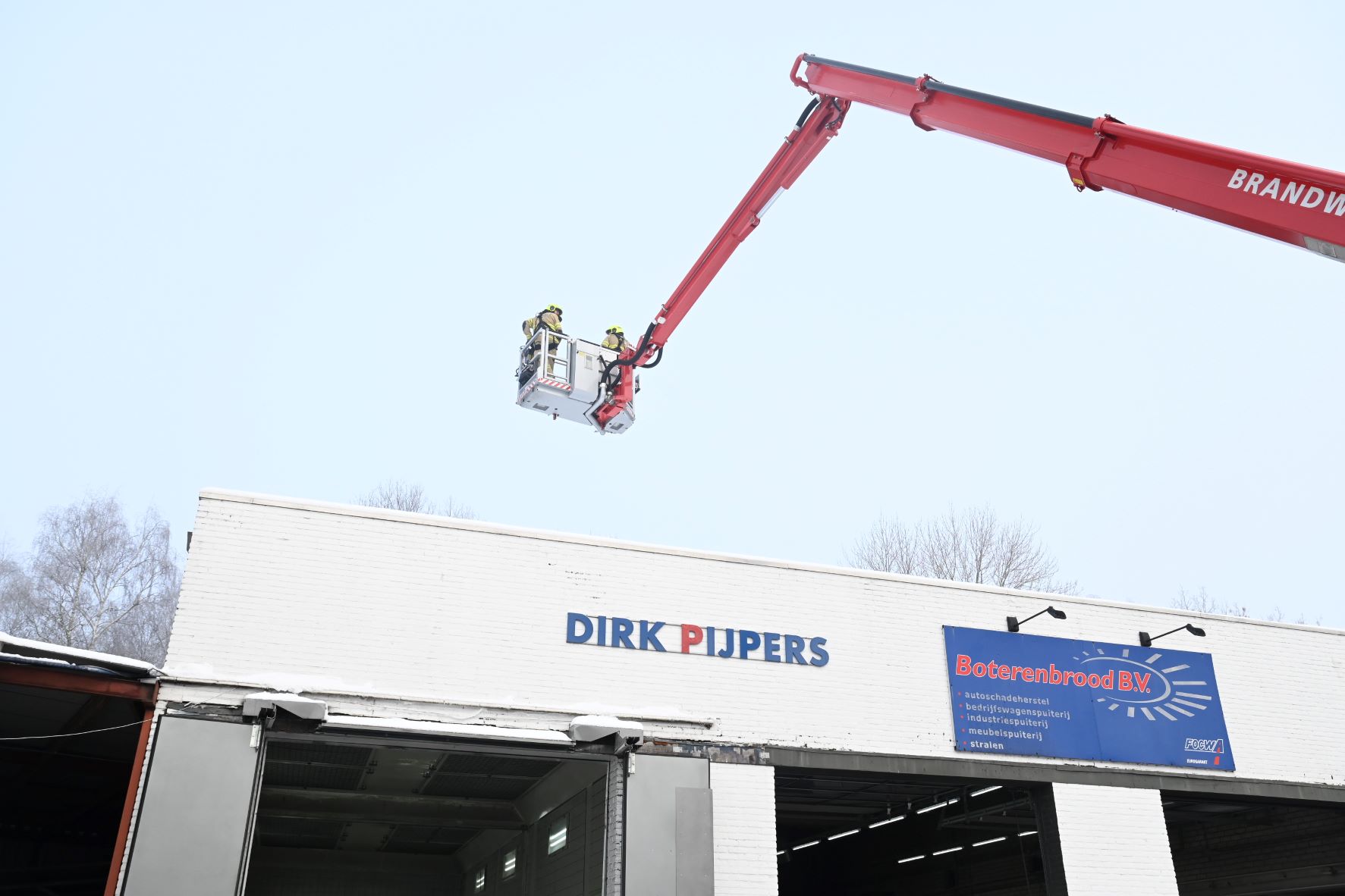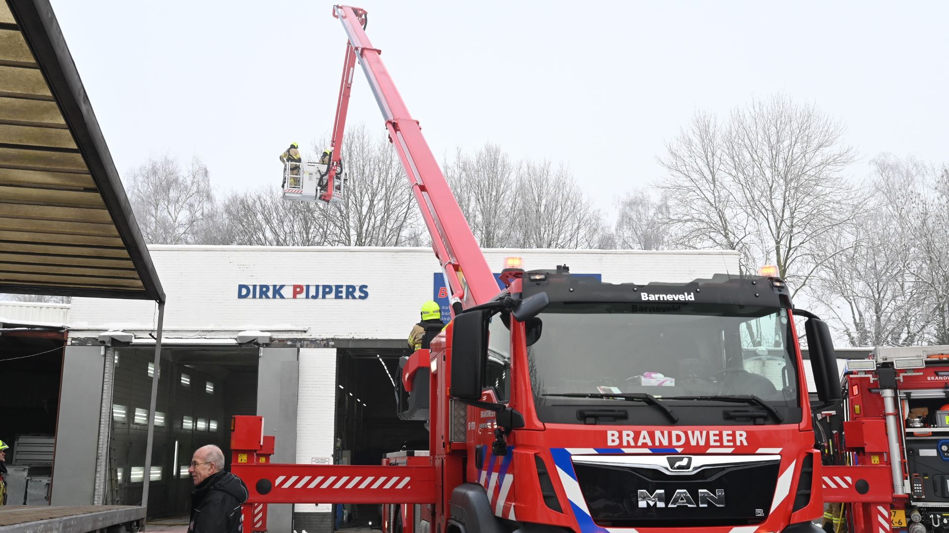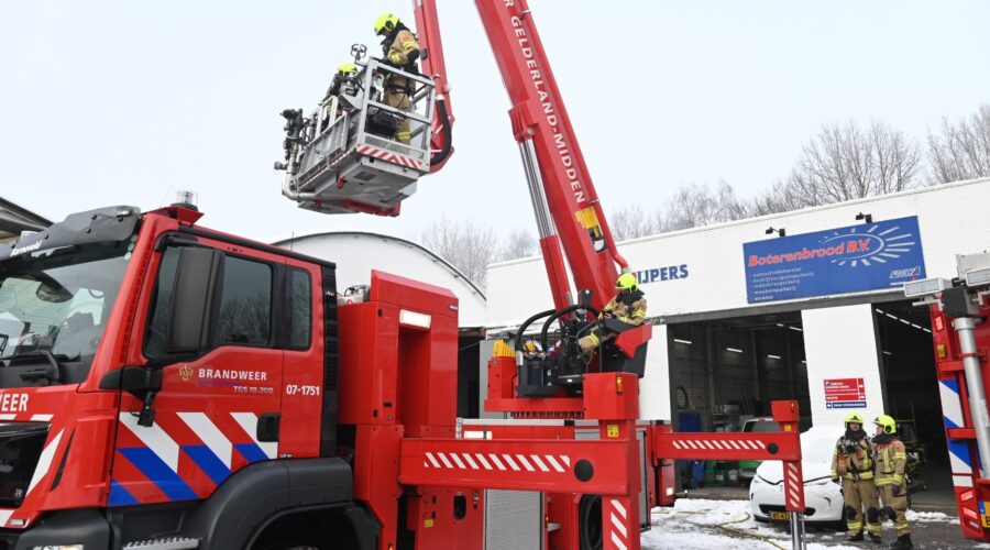 Aan de Bruins Slotlaan in Nijkerk is dinsdagochtend 6 januari een brandlucht bij een bedrijf gemeld. Het zou gaan om een verbrande filter. De brand brak ’s ochtends uit. De brandweer is gealarmeerd, waarbij onder meer één tankautospuit en als bijstand één hoogwerker uit Barneveld zijn opgeroepen. De hoogwerker heeft voor alle zekerheid het gehele dak onderzocht. Foto Kees van den Heuvel