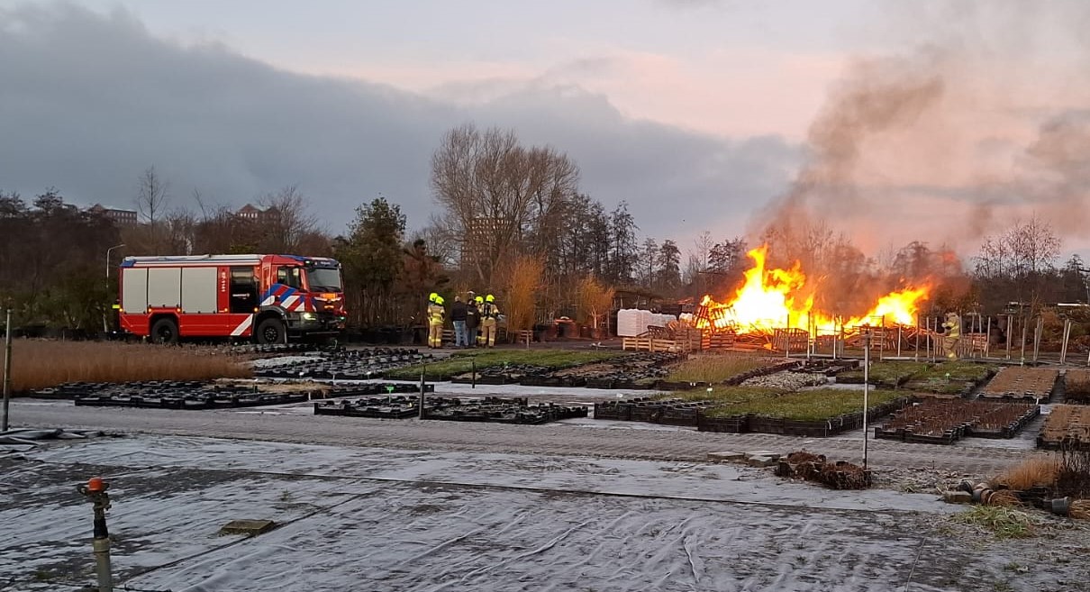 Woensdagmorgen 31 december omstreeks 8.12 is de brandweer van Nijkerk opgeroepen voor een brandgerucht aan het Dijkje in Holkerveen. Diverse meldingen van brand waren binnengekomen. Ter plaatse bleek er een enorme stapel pallets in brand te staan bij een tuincentrum, een vreugdevuur. De brandweer heeft het vuur gecontroleerd laten uitbranden. Over de oorzaak van de brand is niks bekend. Foto’s Marcel Bakker