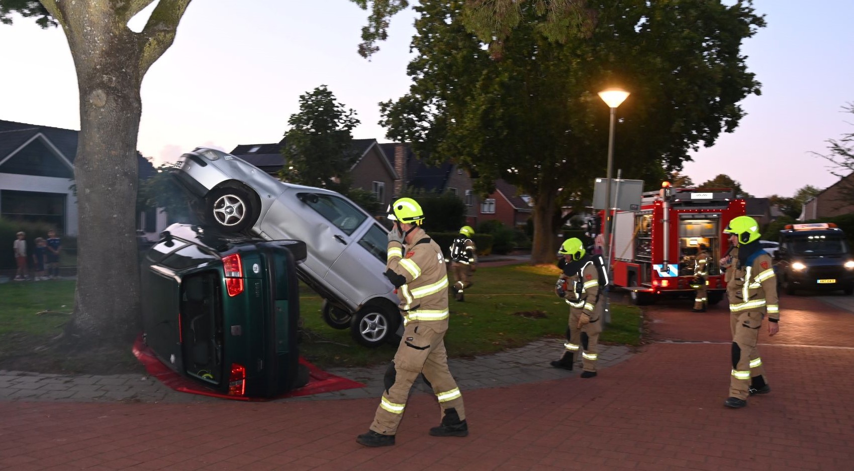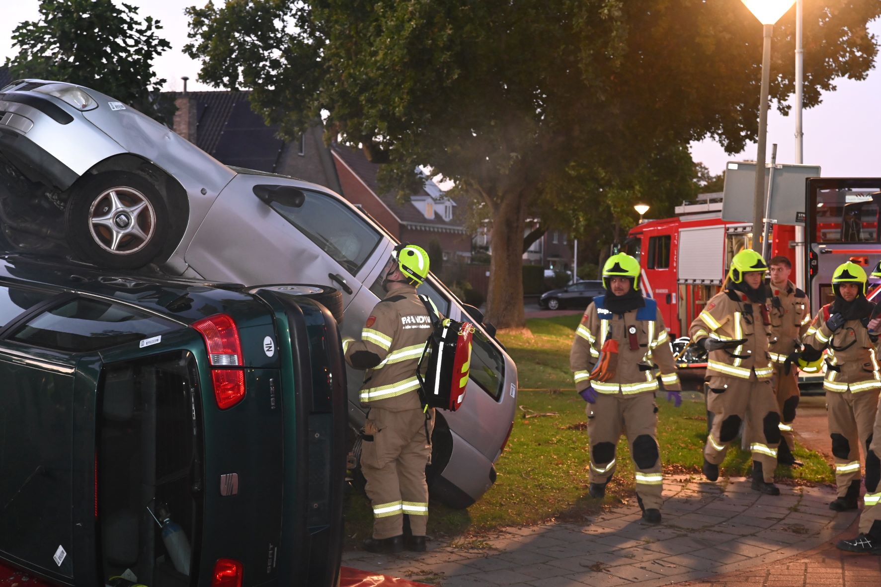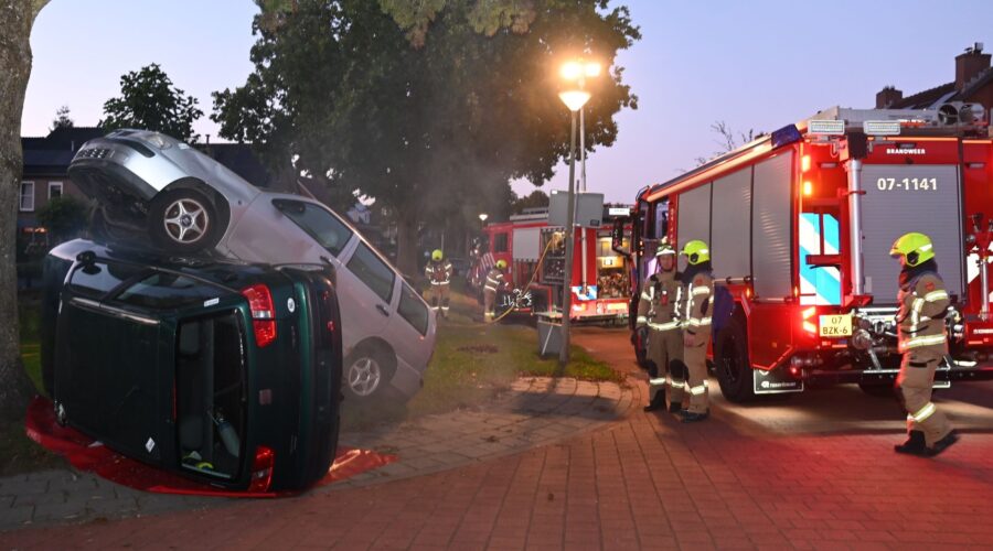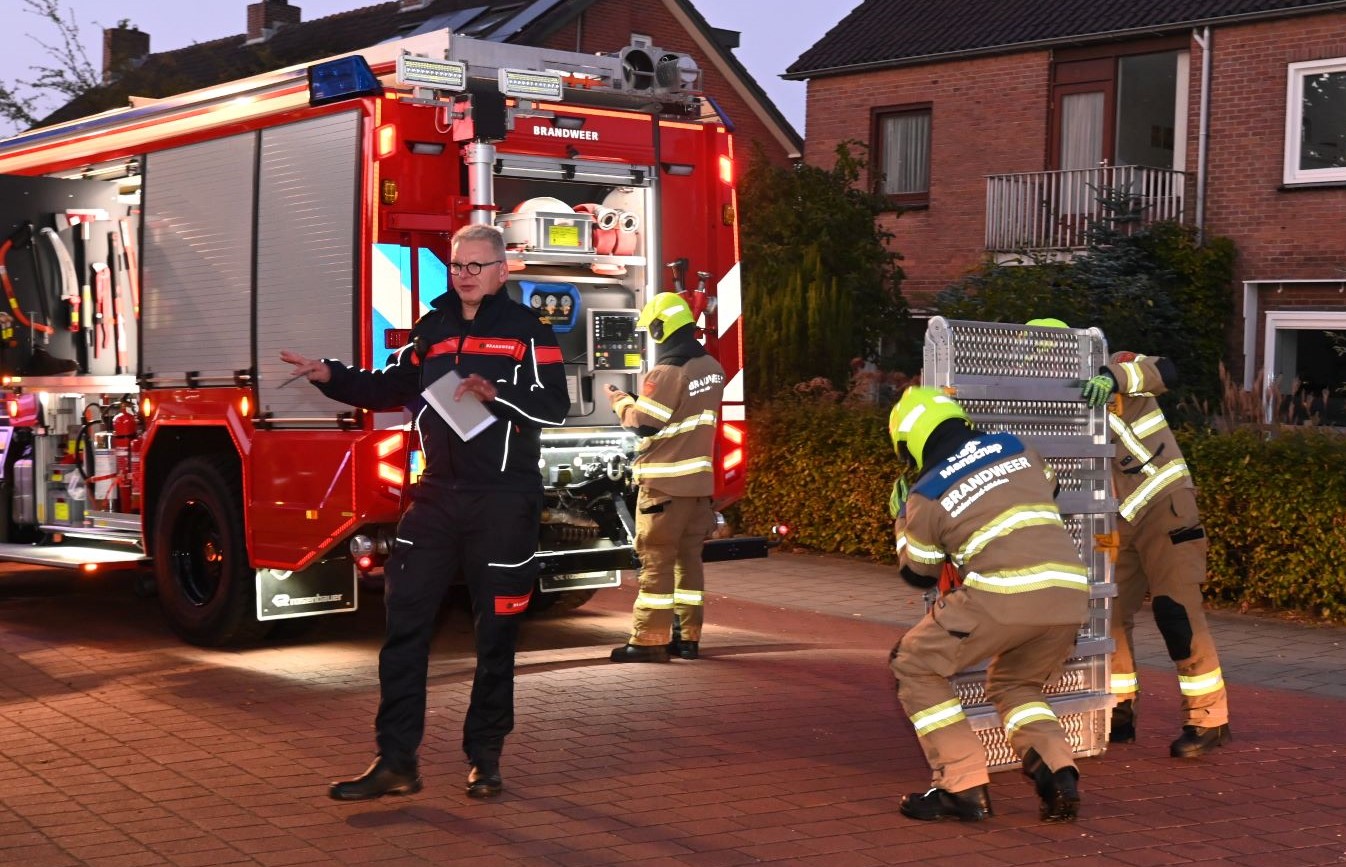 Maandagavond 22 september vond een grootschalige brandweeroefening plaats op de hoek van de Julianastraat met de Beatrixstraat. Daar waren twee auto’s frontaal op elkaar gebotst. Twee brandweervoertuigen kwamen eraan te pas om de passagiers te bevrijden uit hun benarde situatie. Foto Kees van den Heuvel