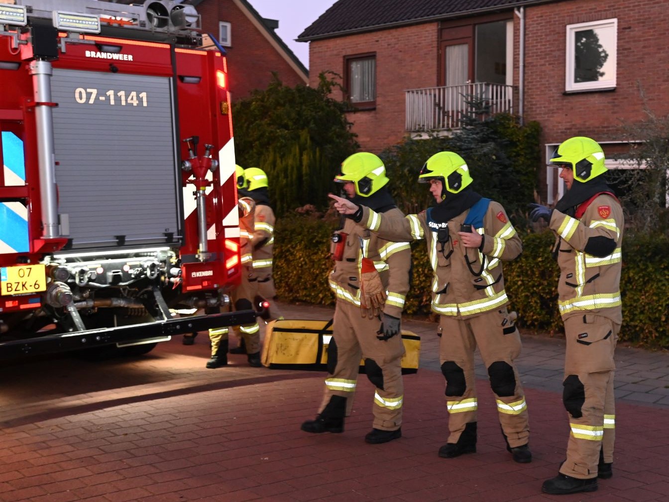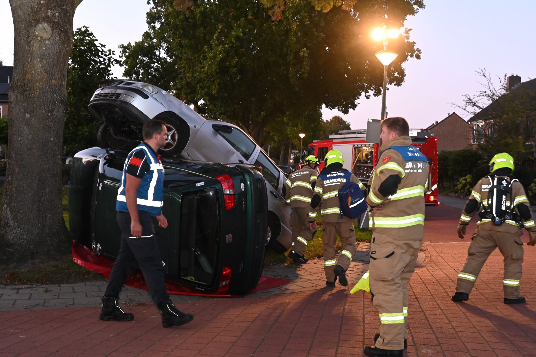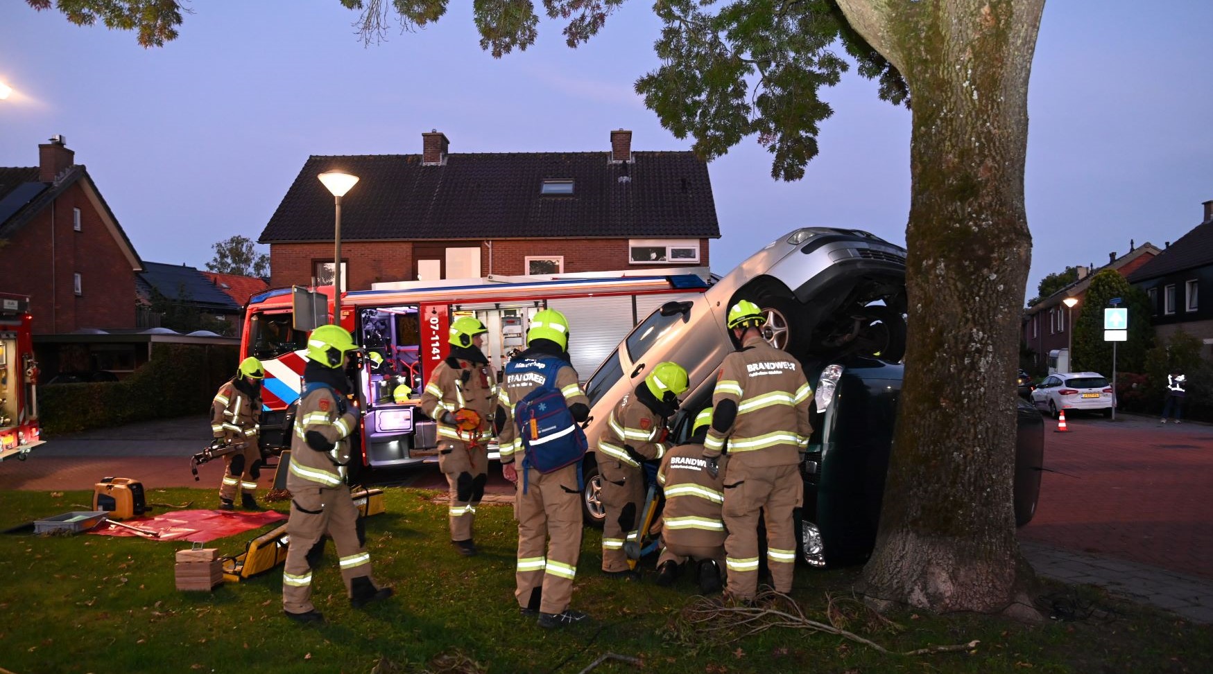 Maandagavond 22 september vond een grootschalige brandweeroefening plaats op de hoek van de Julianastraat met de Beatrixstraat. Daar waren twee auto’s frontaal op elkaar gebotst. Twee brandweervoertuigen kwamen eraan te pas om de passagiers te bevrijden uit hun benarde situatie. Foto Kees van den Heuvel