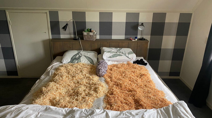 Een spandoek en trekker in de tuin.. Gelukkig hebben de vrienden met plaatsen wel om Mark zijn gras gedacht.. Verder was er een schutting gemaakt van hooibalen. En uiteraard zaten Mark en Alianne nog om zand verlegen voor het straatwerk en de vrienden zijn dan wel zo aardig om het bruidspaar daaraan te helpen. Voor de diverse dieren rondom huis zijn Mark en Alianne ook gek op het zaagsel van hout. Dit vonden zij in zakken in de badkamer. En ook een paar zakken in bed. Kortom het bruidspaar kan na een zeer geslaagde trouwdag, thuis verder met genieten.