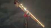 De enorme bouwkraan in het centrum van Nijkerk tegenover de Nijkerkse toren, zorgt tijdens de komende kerstdagen voor extra sfeerverlichting. De giek van de kraan is over de gehele lengte voorzien van lampjes, het geheel is van grote afstand goed te zien. Een gewaardeerde geste door het bouwbedrijf. Foto Henk Karelsen lees verder