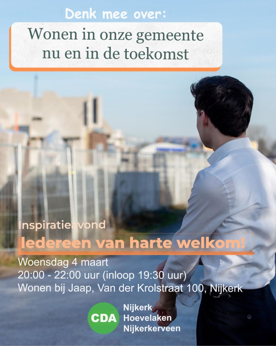 Het CDA organiseert op woensdag 4 maart 2026 een openbare bijeenkomst met als thema “Wonen in onze Gemeente, nu en in de Toekomst”. CDA-wethouder Esther Heutink-Wenderich laat ons zien welke plannen in de afgelopen jaren zijn gerealiseerd en schets ons een beeld van alle plannen die in voorbereiding zijn. Lijsttrekker Matthias Blankesteijn: “Het CDA zal ook de komende jaren inzetten op passende en betaalbare woningen voor onze inwoners, in het bijzonder voor starters, gezinnen en ouderen. Op deze avond gaan we het hebben over hoe we dat concreet willen realiseren.” Tijdens deze avond komen ook bewoners van “Wonen bij Jaap” aan het woord. Alle vragen rondom het thema wonen worden beantwoord door CDA-wethouder Esther Heutink en CDA-raadsleden Matthias Blankesteijn en Lukas Rakhorst. Na afloop is er tijdens de borrel volop ruimte om elkaar te ontmoeten en kennis te maken met de kandidaat-raadsleden van het CDA. De bijeenkomst wordt gehouden in het Paviljoen “Wonen bij Jaap”, Van der Krolstraat 100 in Nijkerk. Aanvang 20.00 uur. Inloop vanaf 19.30 uur. Aanmelden is niet nodig. Iedereen is welkom!