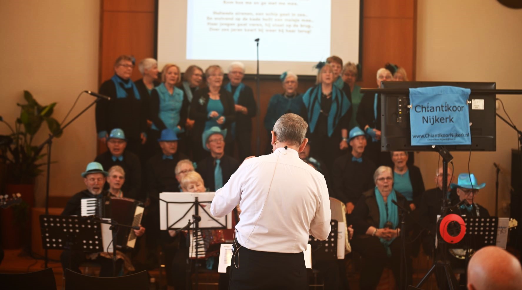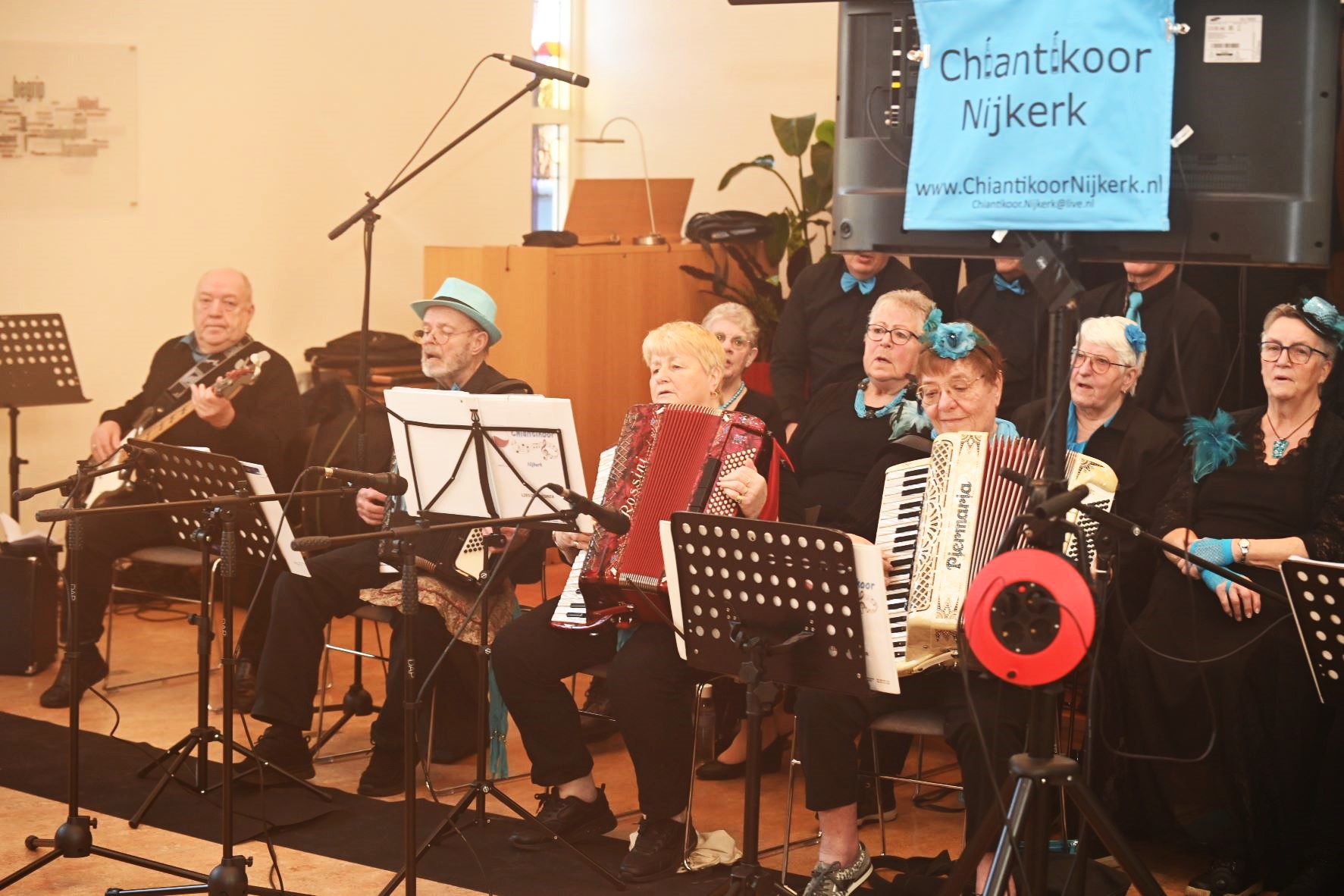 In Nijkerkerveen was het evenement Gluren bij de Buren zondag 2 februari karig bedeeld. Op slechts één locatie in het dorp kon opnieuw worden genoten van een muzikaal optreden. Dat speelde zich af in de Apostolische Kerk aan de Schoolstraat waar het Chiantikoor Nijkerk optrad. Het gezelschap portretteerde zichzelf als een gezelligheidskoor dat als motto heeft ‘met ons is het altijd feest’. Ze maakten er in de kerkruimte dan ook een feest van. Foto Kees van den Heuvel