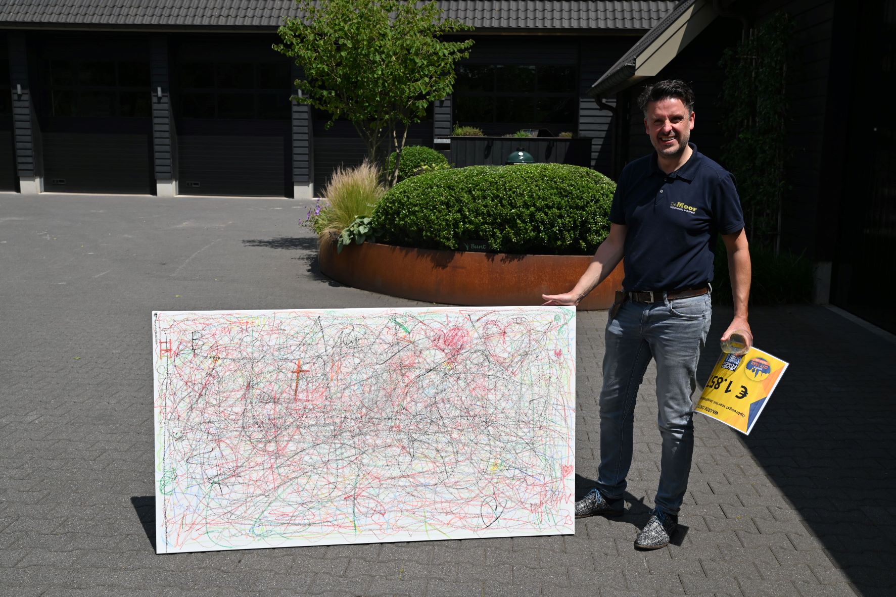 De City Trail Nijkerk, waarbij honderden atleten door winkels en bedrijven lopen, heeft onlangs veel geld opgeleverd. In totaal is een bedrag van 1.857 euro opgehaald. Dit is bestemd voor het Jeugdfonds Sport en Cultuur in Nijkerk. Hiermee kunnen enkele Nijkerkse kinderen gratis deelnemen op een sportclub naar keuze. De cheque is woensdagmiddag 25 juni overhandigd door de organisatie van de City Trail aan Gerwin Poolen van de Lions Club Nijkerk. Ook wordt nog een schilderij geveild die tijdens de City Trail loop door de atleten is gemaakt in het Kunstlokaal. Foto Kees van den Heuvel