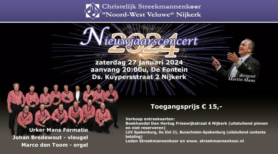 Op zaterdag 27 januari a.s. houdt het Christelijk Streekmannenkoor ‘Noord – West Veluwe Nijkerk’ haar jaarlijkse Nieuwjaarsconcert in De Fontein, Ds. Kuypersstraat2, Nijkerk. Aanvang: 20.00 uur. Mede gelet op de succesvolle concerten van de afgelopen jaren verleent de Urker Mans Formatie weer haar medewerking aan dit concert. Beide koeren staan onder leiding van Martin Mans. Johan Bredewout zit aan de vleugel en onze plaatsgenoot Marco den Toom bespeelt het orgel. Iedereen wordt hartelijk uitgenodigd om dit unieke concert bij te wonen!