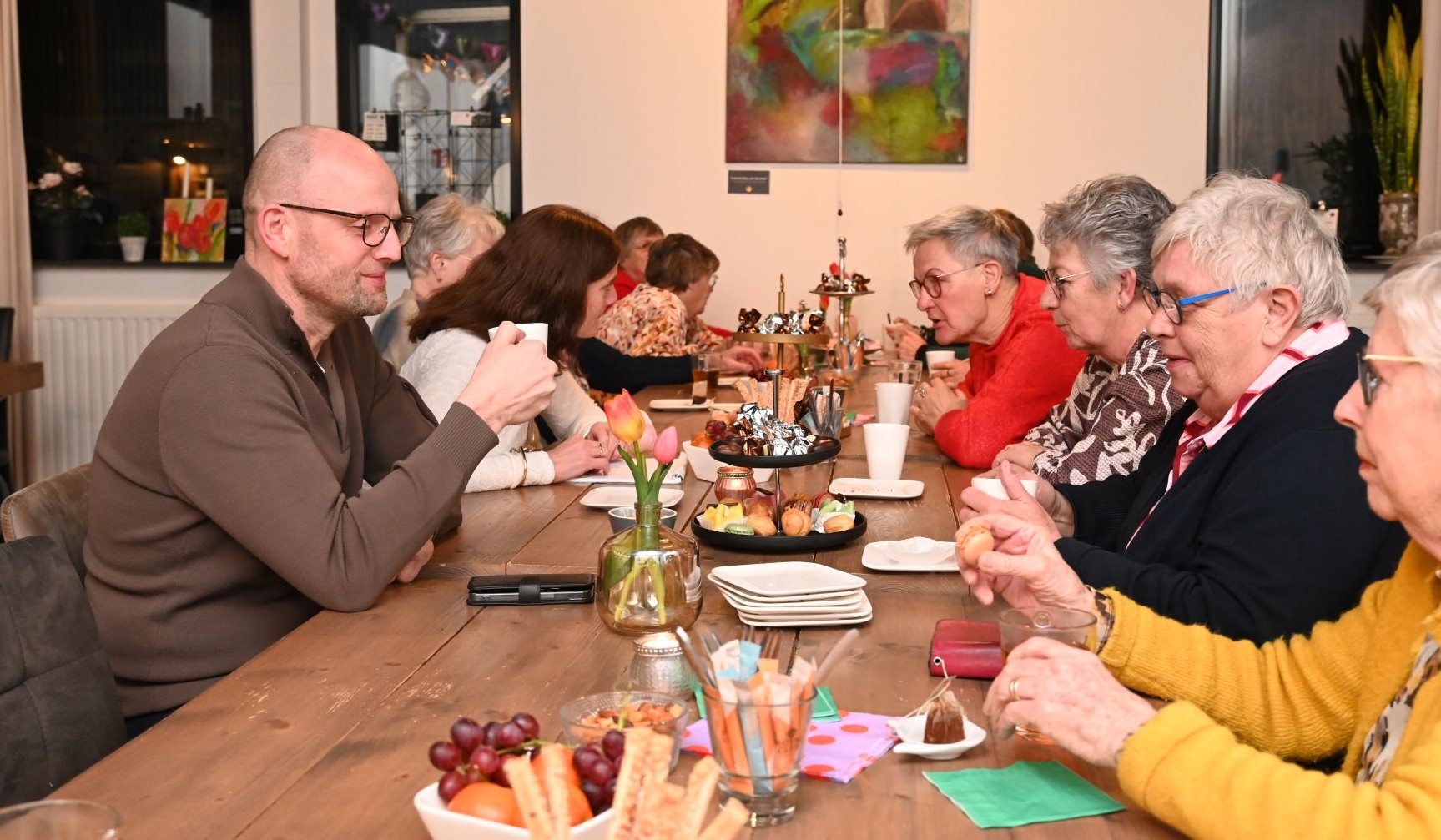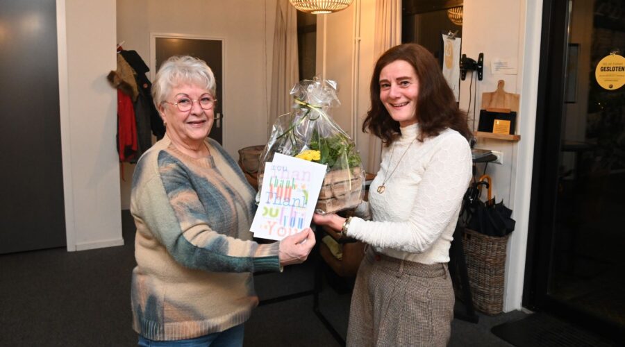 Els Blankesteijn heeft dinsdagavond 10 februari afscheid genomen als vrijwilliger bij het buurthuis Het Paashuis in Nijkerk. Ze vervulde er de rol van coördinator vrijwilligers en activiteiten. Wel blijft ze nog betrokken bij de maaltijden van het Paashuis. Els heeft een nieuwe betrekking en kreeg daardoor minder tijd voor het buurthuis. Namens Het Paashuis overhandigde Adri van Soeren haar tijdens het gastvrouwenoverleg een cadeau. Els: ,,Ik vind het mooi om mijn steentje te hebben mogen bijdragen aan mooie ontmoetingen tussen mensen. Ik merkte in de praktijk dat dit voor veel mensen echt een verschil maakte.” Foto Kees van den Heuvel