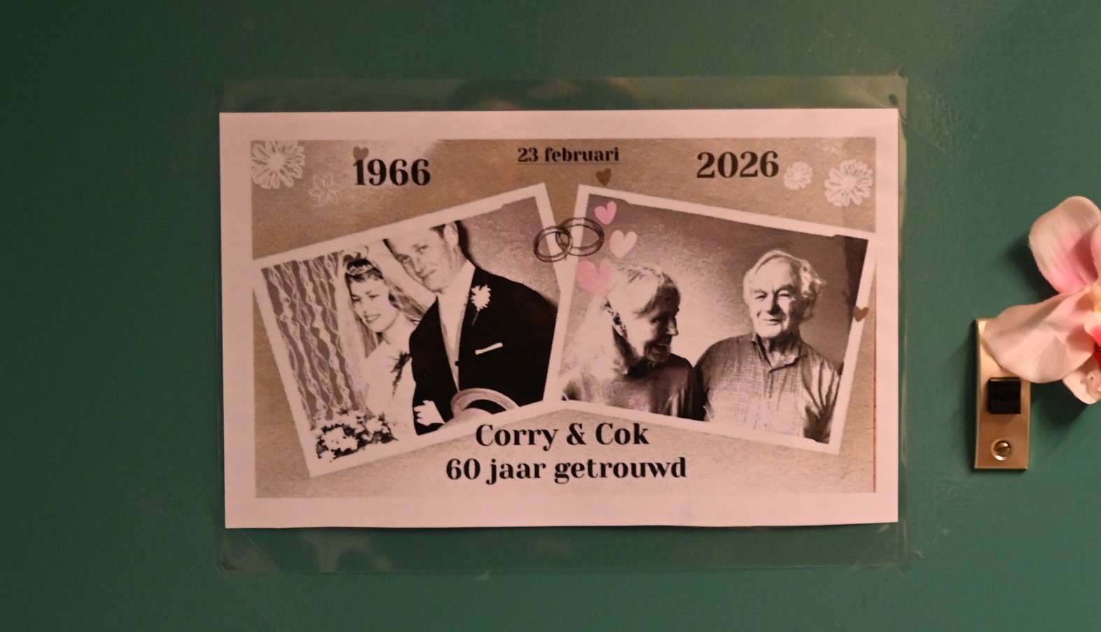 Burgemeester Tinet de Jonge heeft woensdag 25 februari een bezoek gebracht aan verzorgingscentrum Sint Jozef waar het echtpaar Cok en Corry den Breejen hun 60-jarige huwelijksjubileum vierde. De burgemeester bracht voor het bruidspaar een prachtige bos bloemen mee. Cok den Breejen leidde een aannemers/transportbedrijf in Hoofddorp. Vanwege de verhuizing van één van hun kinderen naar Amersfoort besloot het paar ook deze kant op te verhuizen, aanvankelijk in Amersfoort maar later hebben ze gekozen voor Nijkerk. Foto Kees van den Heuvel