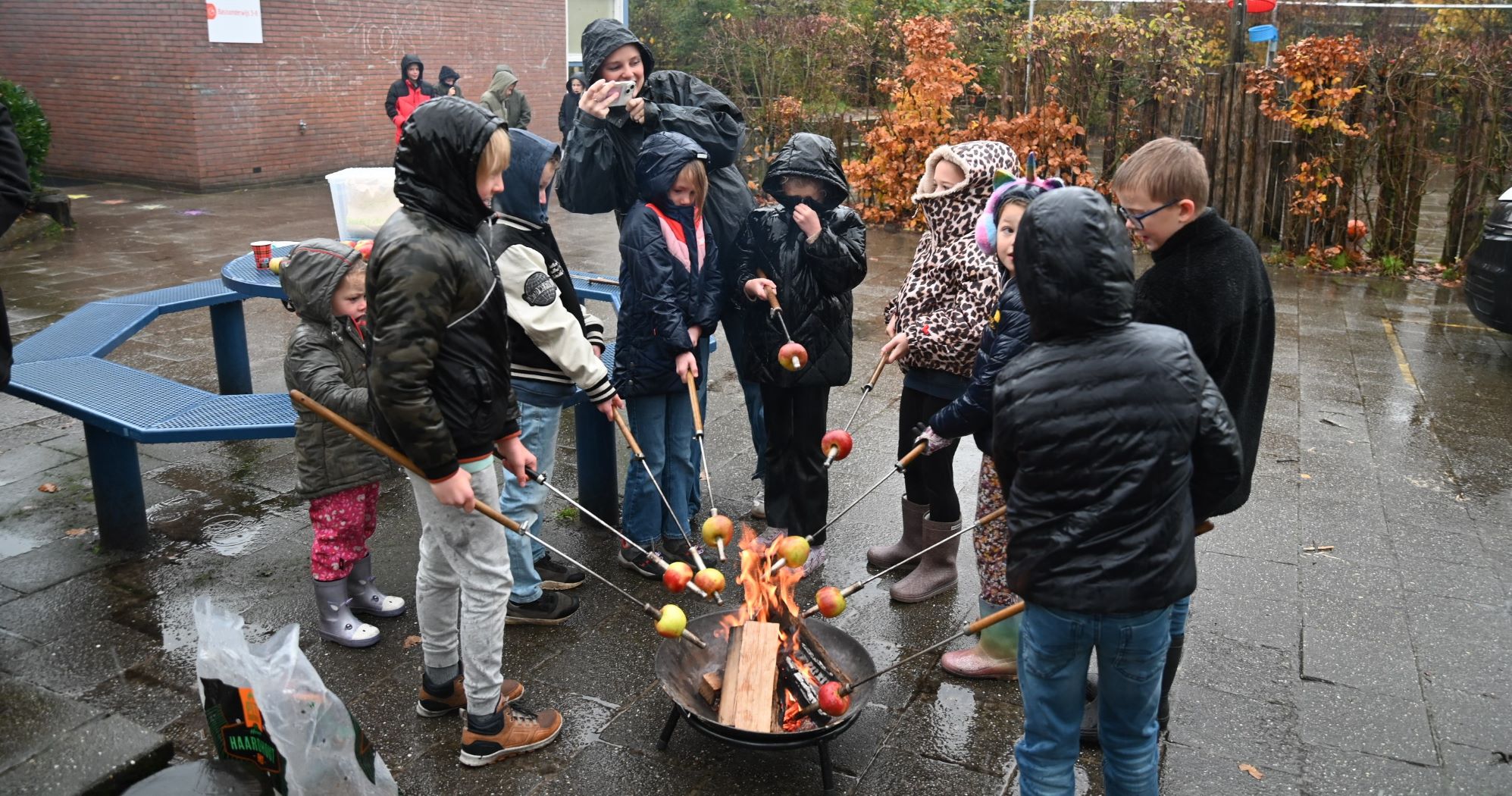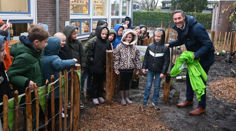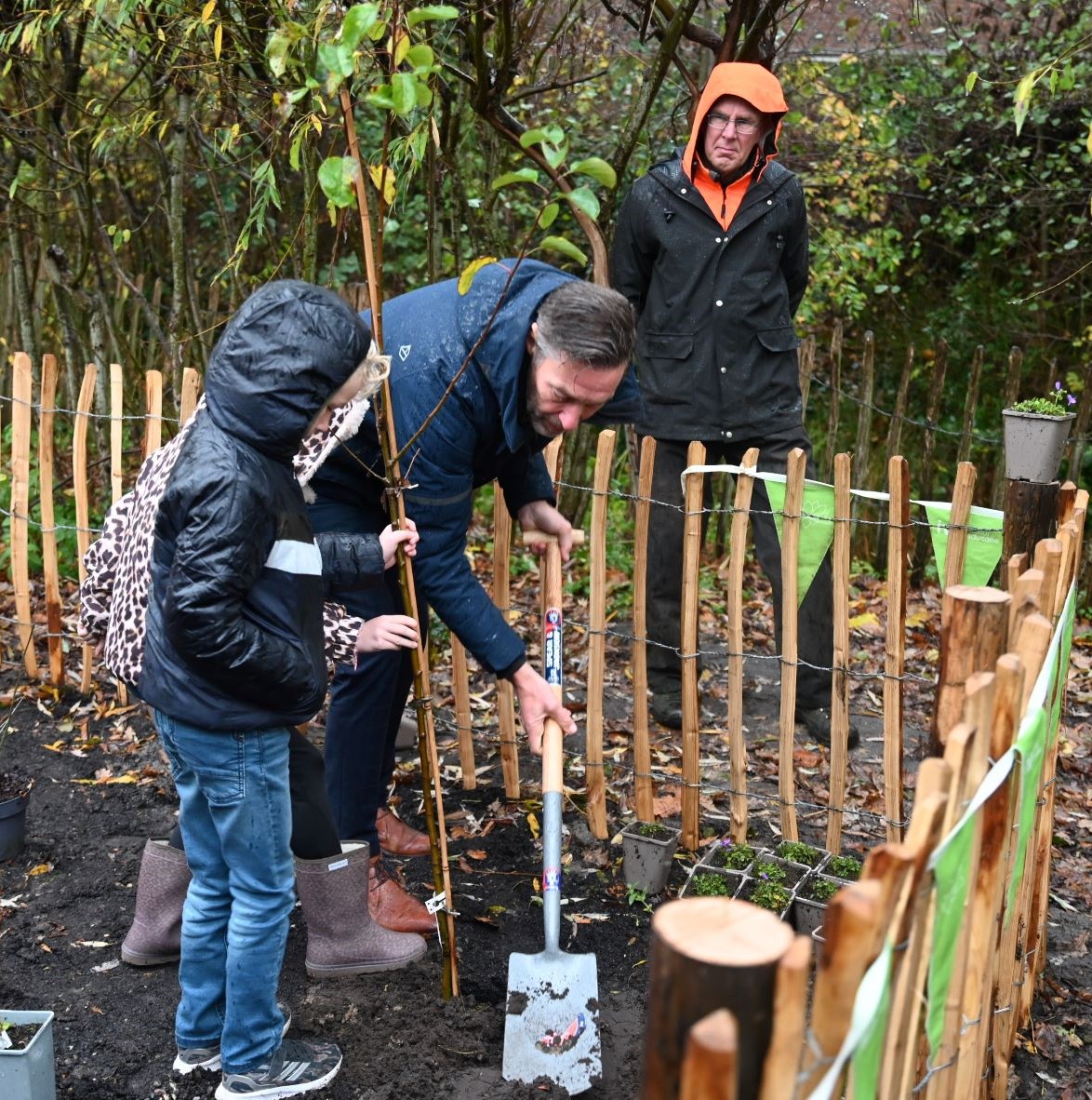 In de stromende regen is woensdagmorgen 19 november bij kindcentrum De Spreng in Hoevelaken een Smaaktuintje geopend. De opening werd verricht door wethouder Rene Windhouwer met twee scholieren van De Spreng. Ook werd een boompje geplaatst. Een smaaktuintje is een klein, aaneengesloten bosje, dat bestaat uit eetbare planten, struiken en bomen. Het bevat zowel bekende als minder bekende soorten, zoals amandel, braam, citroenmelisse en colakruid. Alle planten in het smaaktuintje zijn permanent: sommige sterven in de winter af om in het voorjaar weer uit te lopen. Van de verschillende planten, waaronder bladeren, bloemen, vruchten, stengels en noten, is alles gedeeltelijk of volledig eetbaar. Het smaaktuintje biedt kinderen de unieke kans om meer te leren over voedselproductie. Ze raken direct betrokken bij het aanplanten, onderhouden en oogsten van het voedsel. Op deze manier ervaren ze hoe voedsel wordt geproduceerd en leren ze tegelijkertijd over duurzaamheid. In de Smaaktuin werden meerdere bomen en struiken geplant, er werden appels geroosterd en binnen werden wormen opgemeten. Foto Kees van den Heuvel