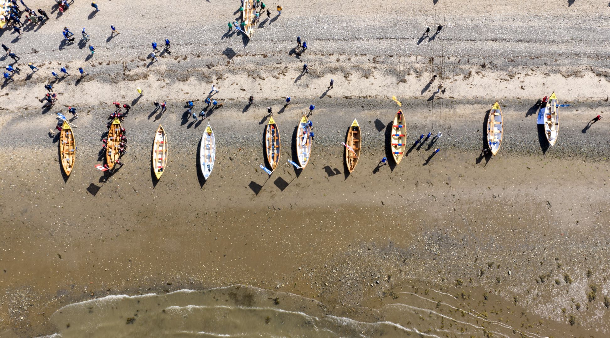 Op dinsdag werd er om die reden héél vroeg gestart want de organisatie moest wel het schema inhalen. De wind was nog vrij fors en de eerste heats werden gestart. De Zuidwal teams deden het uitstekend, ondanks het feit dat dit soort ‘coastal rowing’ toch écht anders is dan in de golf van Bunschoten. In de klasse 40+ haalden de teams de niet onverdienstelijk de middenmoot, en in de 50+mixed zelfs een vijfde plek in de heat. Dat was echter niet genoeg voor een plek in de finale.Maar: het superteam van de Zuidwal moest nog aan de bak; het 280+ heren team. En dat ging helemaal geweldig. Vanaf de kant zijn de race heel lastig te volgen, dus de organisatie stuurt drones de lucht in, en de skiffs zijn voorzien van een tracker. Naast aan van de schermen had zich een grote groep verzameld om de team te volgen en aan te moedingen. De baan bestaat uit een afstand van 1 km naar de keerboei, aldaar zet men de sprint in voor de laatste kilometer. Bij de keerboei komt het erop aan, want snel keren is winst. De Zuidwal keerde heel snel en efficiënt. Snel bleek dat er een grote voorsprong ontstond voor de Nijkerkers. Ze wonnen de heat met grote overmacht. Er waren echter drie heats, waarin zo ongeveer 45 teams aan meededen. In de opvolgende heat bleken de Ieren nét een paar seconden snellen dan de Zuidwallers.