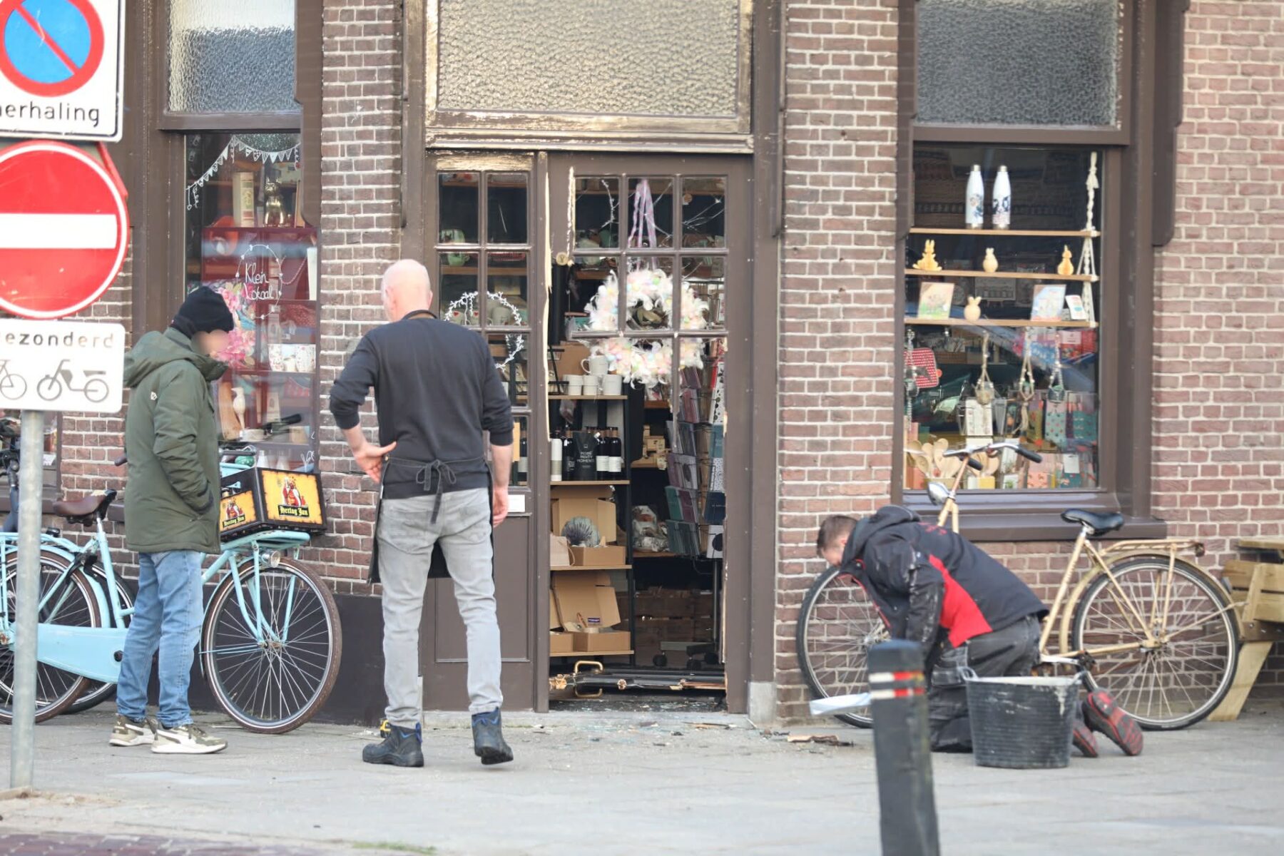 Bij een winkelpand op de hoek van de Torenstraat met de Brink in Nijkerk ligt de voordeur er helemaal uit. Maandagmorgen 9 maart is het pand provisorisch hersteld. Inmiddels is bevestigd dat het om een inbraak gaat. De politie doet onderzoek en de camerabeelden zijn al overgedragen aan de politie. Wat de schade is, is nog niet bekend. De cadeauwinkel was pas sinds kort nieuw geopend. Heel triest allemaal voor de initiatiefnemers. Foto WH Fotografie tekst Kees van den Heuvel