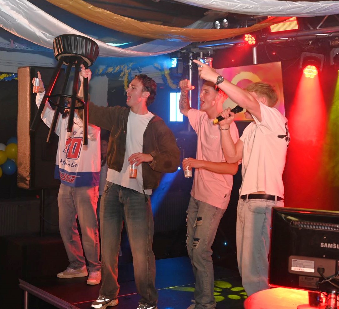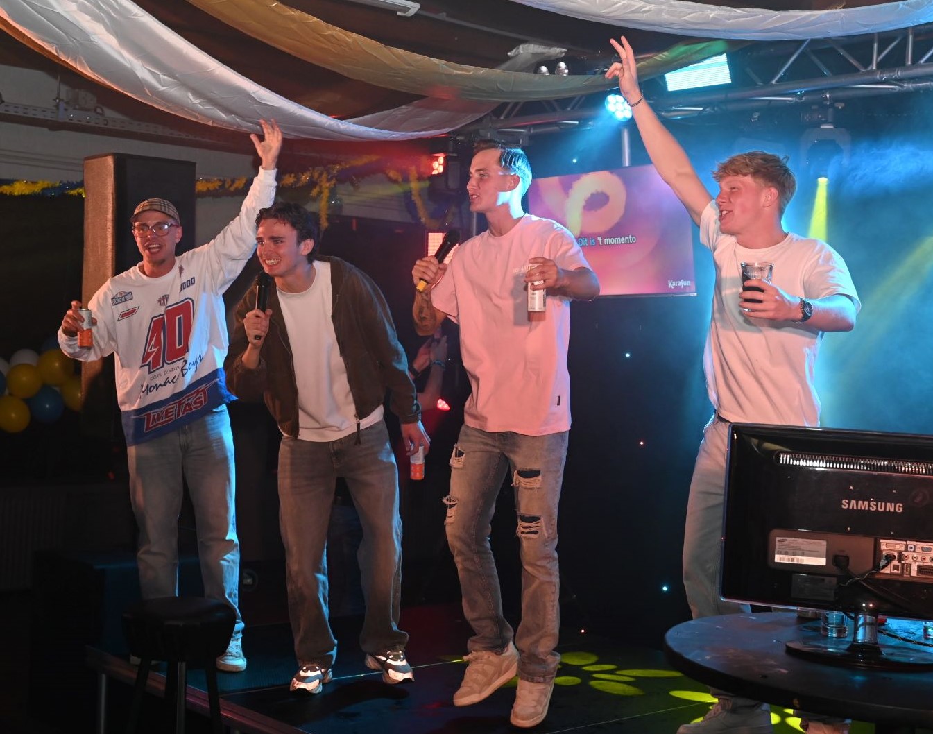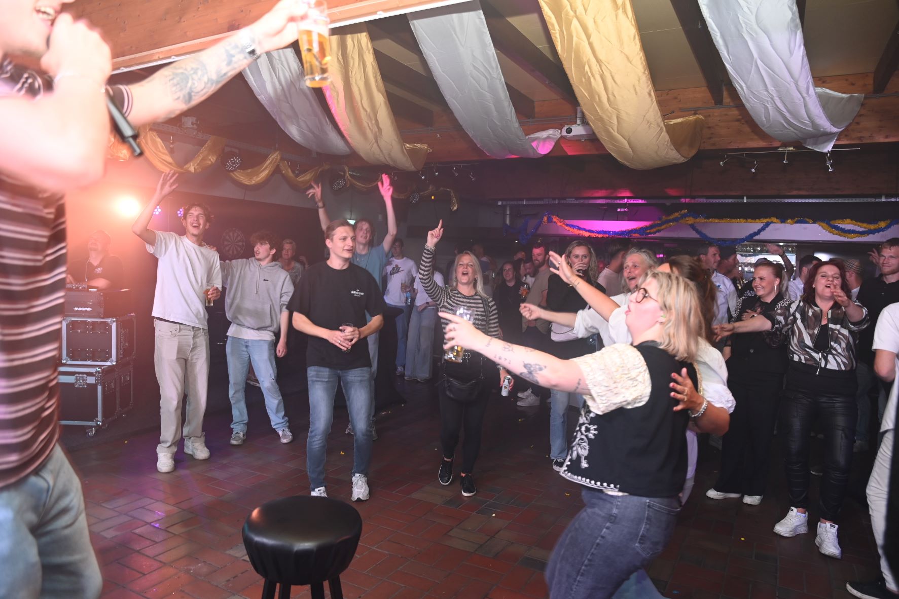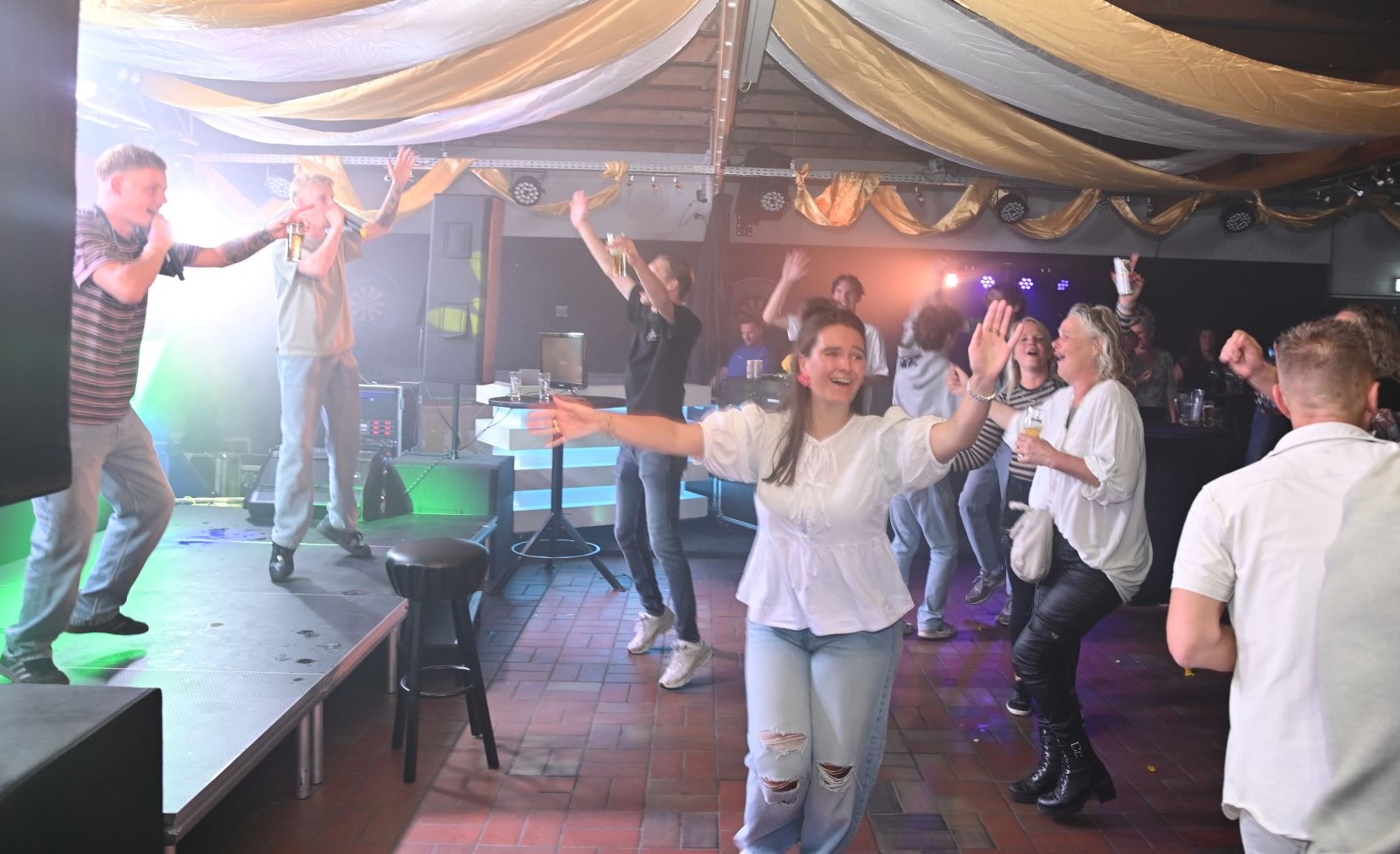 Je moet erbij zijn geweest om het te kunnen navertellen. Zaterdagavond 24 mei werd het sportieve seizoen bij voetbalvereniging NSC Nijkerk voorlopig afgesloten met een grote feestavond. Er was een karaokefeest, met onder meer een Dries Roelvink in gele zwembroek, maar ook het vertrekkende trainersduo Stephan Nuesink en Jari Vedder betraden het podium om het behoud van het eerste team in de tweede klasse te vieren. Het duo zong het lied van Twee motten. Foto Kees van den Heuvel