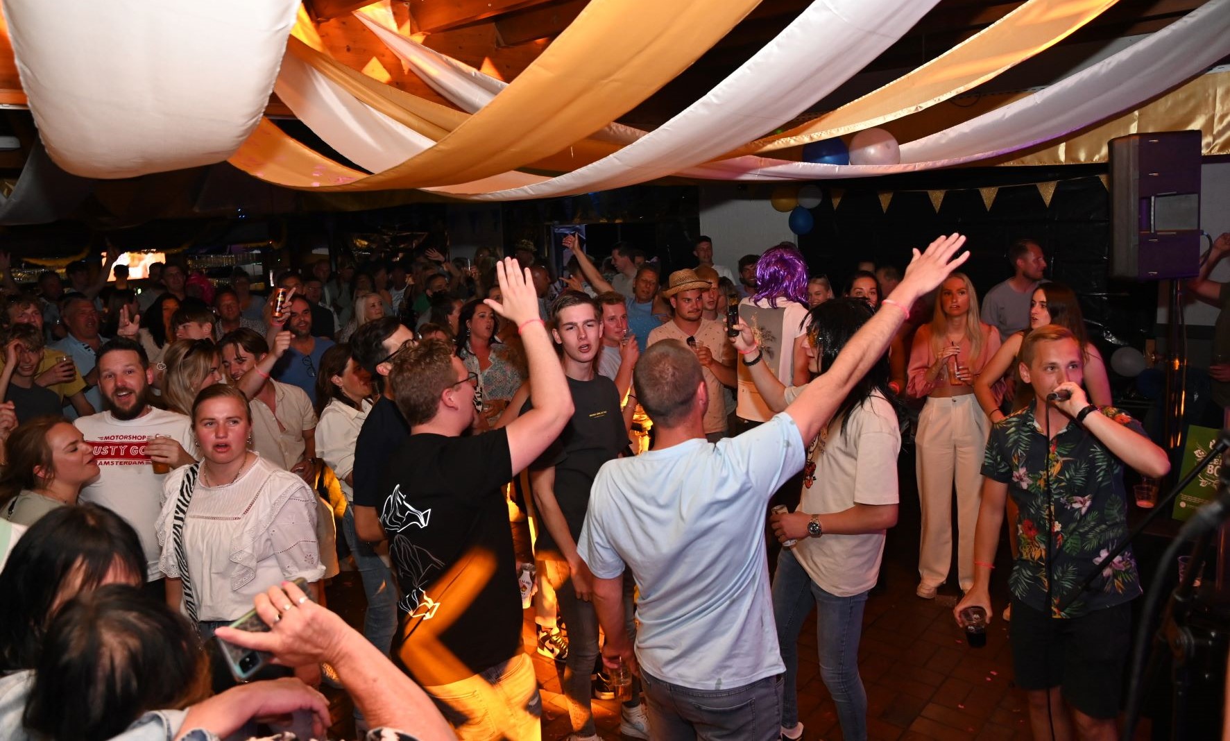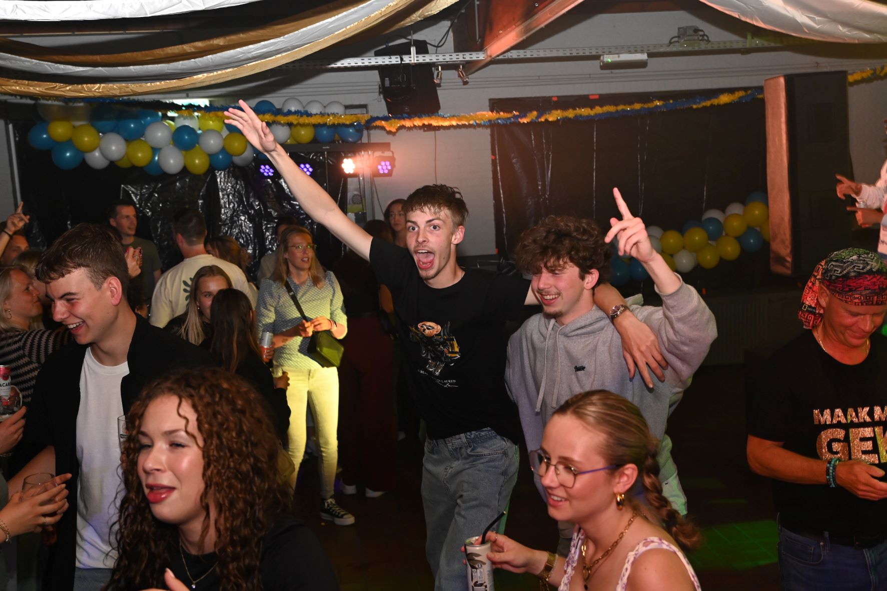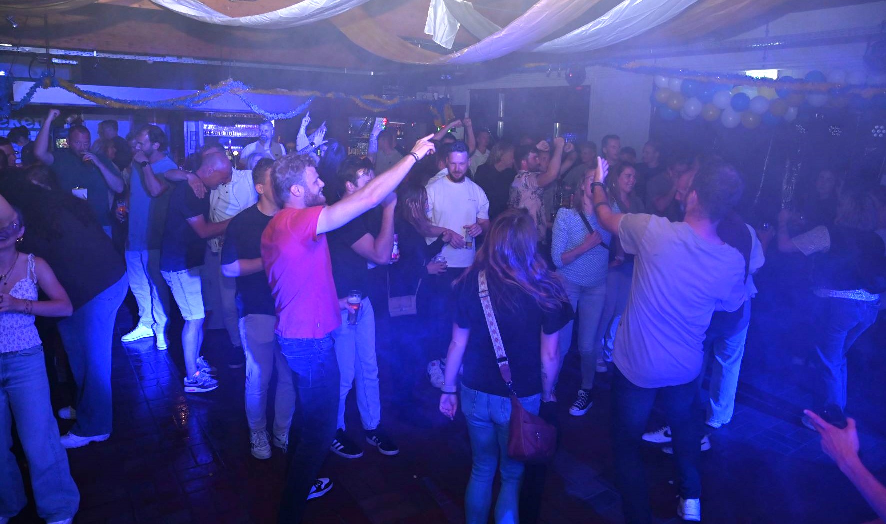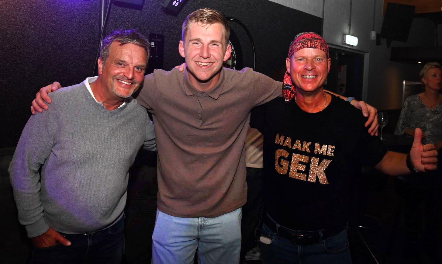 Je moet erbij zijn geweest om het te kunnen navertellen. Zaterdagavond 24 mei werd het sportieve seizoen bij voetbalvereniging NSC Nijkerk voorlopig afgesloten met een grote feestavond. Er was een karaokefeest, met onder meer een Dries Roelvink in gele zwembroek, maar ook het vertrekkende trainersduo Stephan Nuesink en Jari Vedder betraden het podium om het behoud van het eerste team in de tweede klasse te vieren. Het duo zong het lied van Twee motten. Foto Kees van den Heuvel