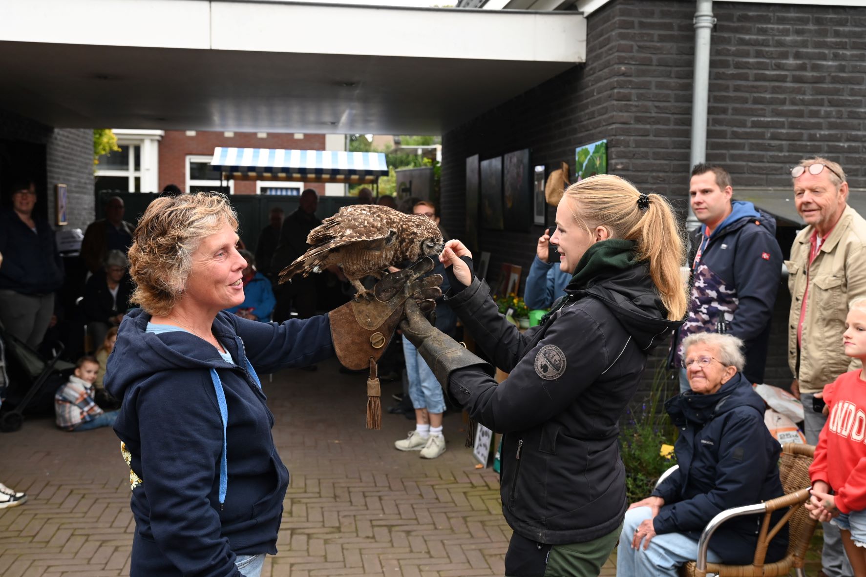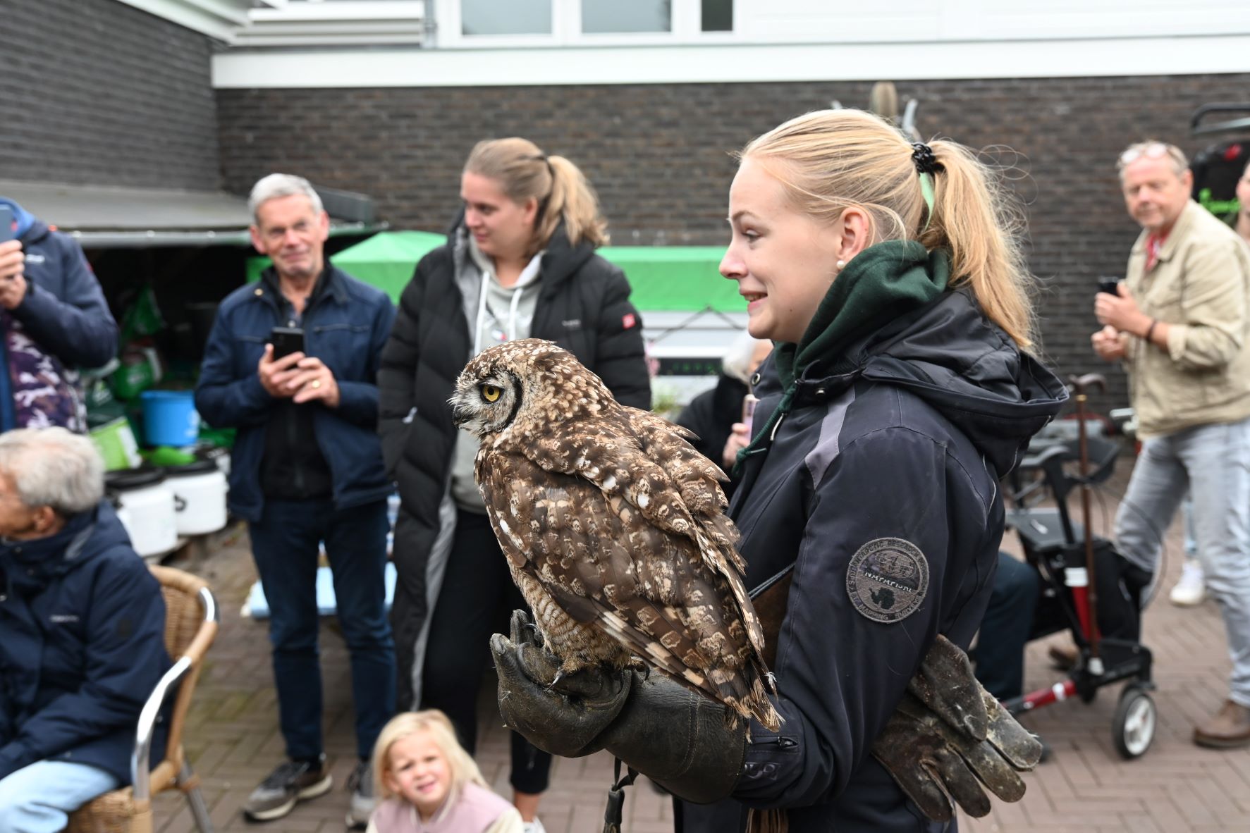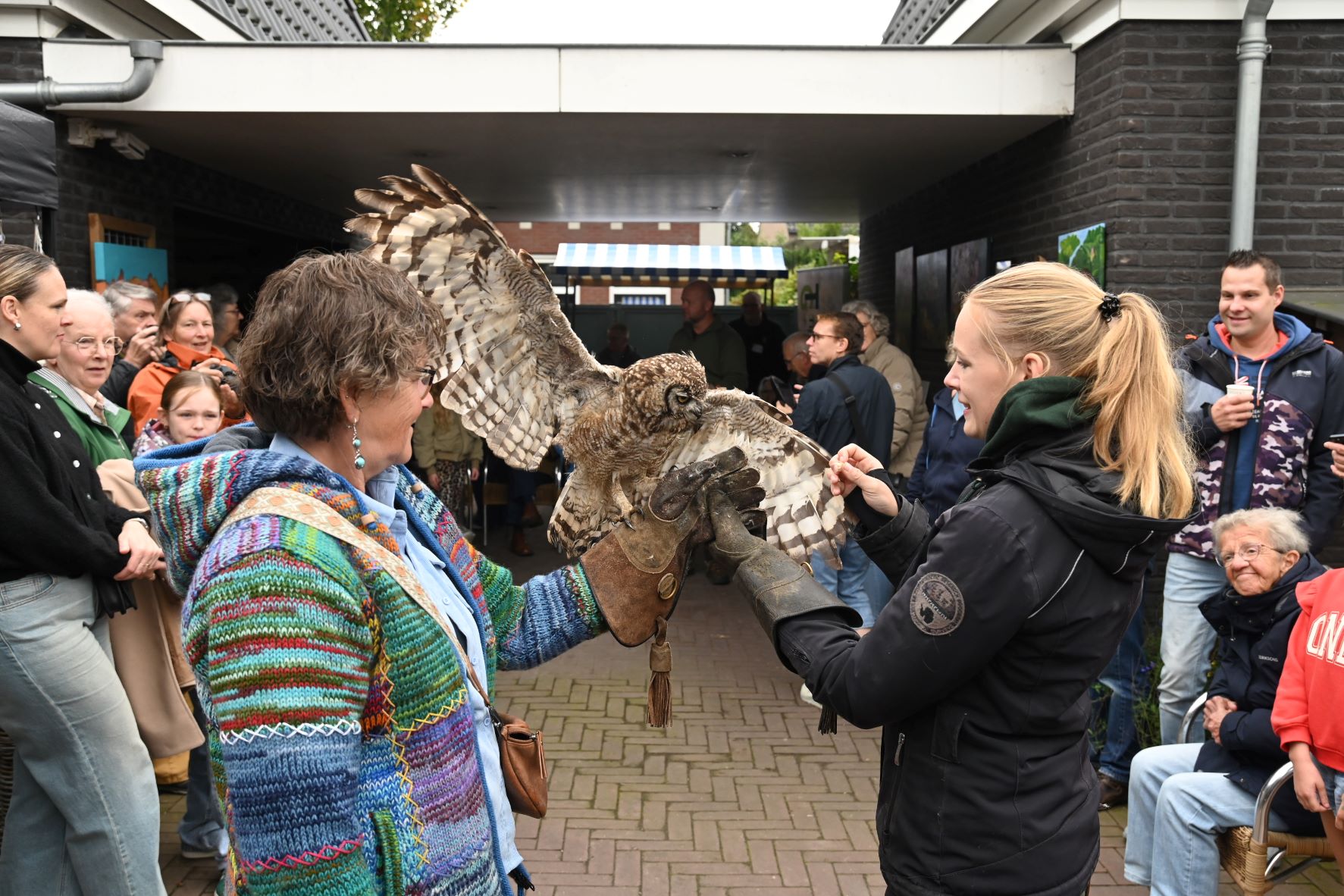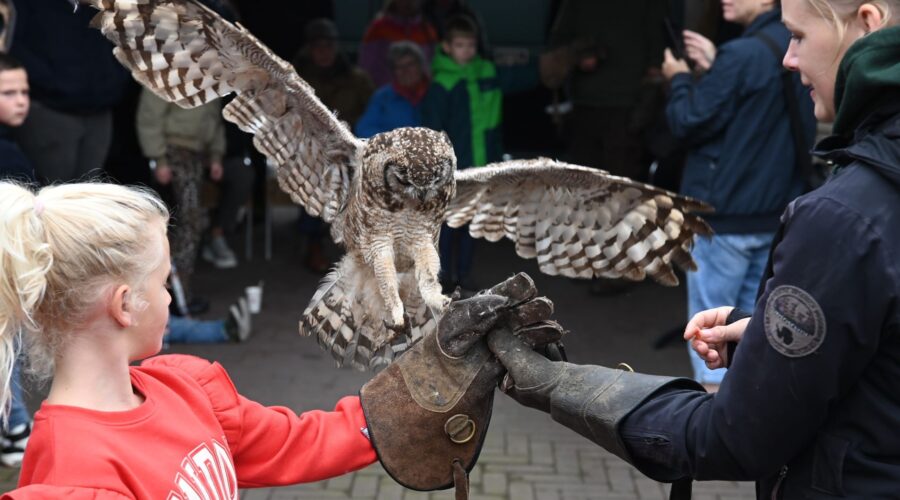 Als u er niet bij bent geweest, dan heeft u wat gemist. Tijdens de Open Dag van Tiggelaven Groenbeheer op de Oosterdorpsstraat in Hoevelaken was er wederom de roofvogelshow van Jeroen Settels. Beroepsvalkenier Settels gaf eerst een uitleg over roofvogels en uilen. Uitgerust met camera’s mochten de bezoekers vervolgens een roofvogel op de arm nemen. Daarnaast stonden Raymon en Karin Tiggelaven, samen met hun zoon Anthonie, klaar om de mensen te ontvangen op hun bedrijf. Ze vertelden wat er allemaal komt kijken bij het goed onderhouden van een mooie tuin. Raymon Tiggelaven: “Laat u vrijblijvend adviseren over onderhoud en renovatie van uw tuin. Stel al uw vragen over planten, tuinen en tuinieren en ontdek de laatste tuintrends! Kijk gezellig rond en laat u inspireren.” Verder was MarYane vanwege de Kunstroute aanwezig is met haar schilderijen. Zij schildert graag met olieverf, acrylverf en zal een demonstratie schilderen geven. Angela van Iersel laat ook haar schilderijen zien, evenals Rianne de Graaf van SeaCeramics die handgemaakt tuinkeramiek laat zien zoals insectenhuisjes, mezenbolhuisjes en vogelschalen. De Groei en Bloei afdeling Nijkerk was eveneens present om alle belangstellenden te voorzien van groene informatie, evenals een imker namens de afd. Nijkerk van de Nederlandse Bijen Vereniging, www.bijenhouders.nl. Er was echte Hoevelakense honing te koop. Foto Kees van den Heuvel