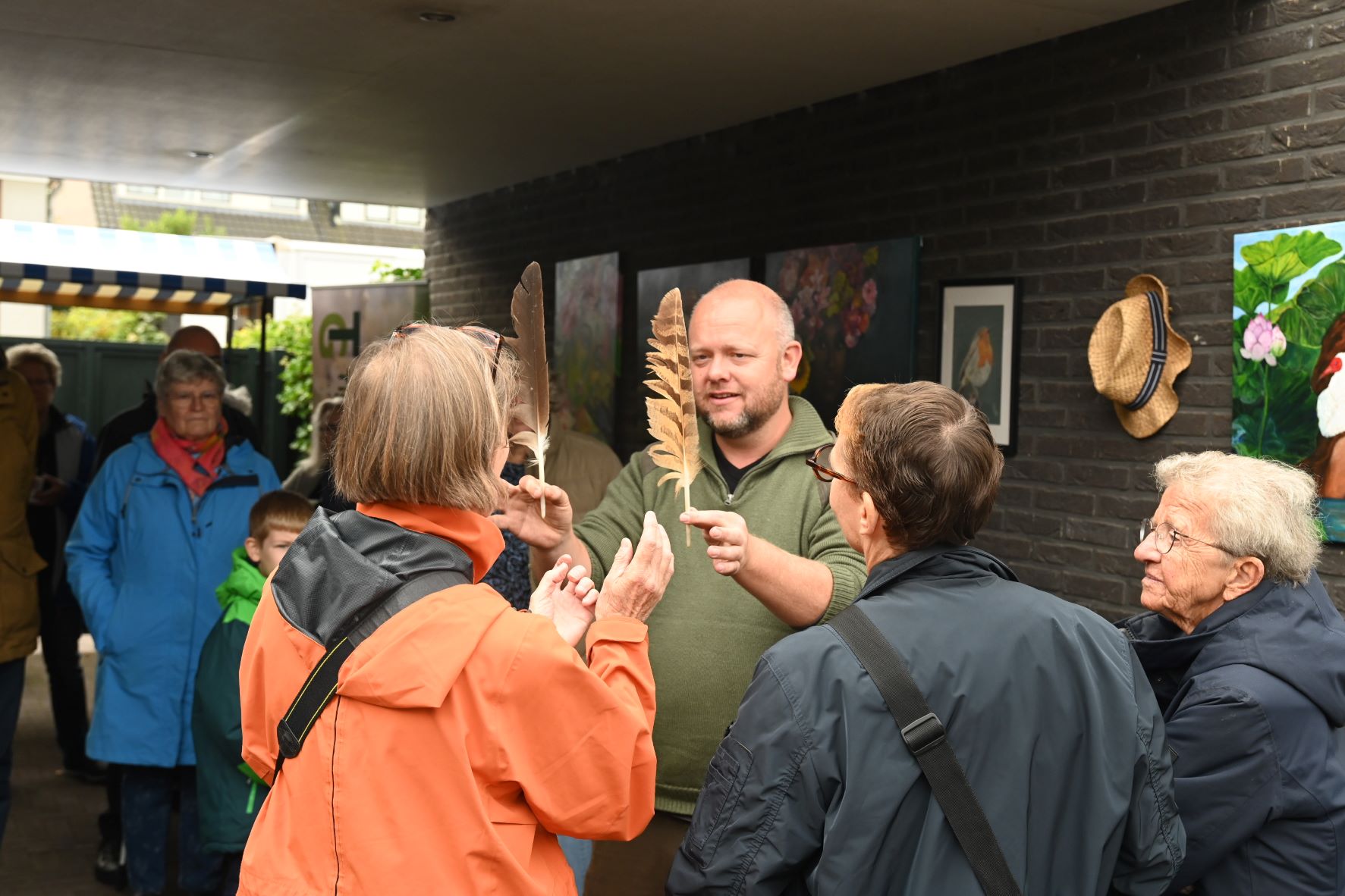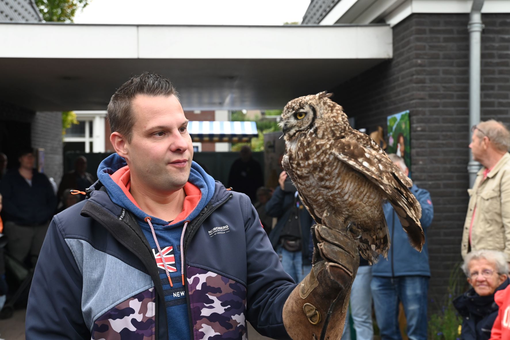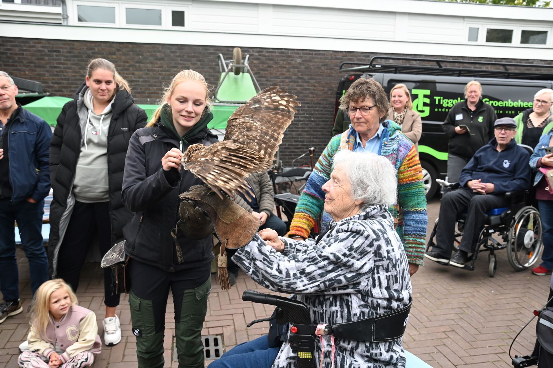 Als u er niet bij bent geweest, dan heeft u wat gemist. Tijdens de Open Dag van Tiggelaven Groenbeheer op de Oosterdorpsstraat in Hoevelaken was er wederom de roofvogelshow van Jeroen Settels. Beroepsvalkenier Settels gaf eerst een uitleg over roofvogels en uilen. Uitgerust met camera’s mochten de bezoekers vervolgens een roofvogel op de arm nemen. Daarnaast stonden Raymon en Karin Tiggelaven, samen met hun zoon Anthonie, klaar om de mensen te ontvangen op hun bedrijf. Ze vertelden wat er allemaal komt kijken bij het goed onderhouden van een mooie tuin. Raymon Tiggelaven: “Laat u vrijblijvend adviseren over onderhoud en renovatie van uw tuin. Stel al uw vragen over planten, tuinen en tuinieren en ontdek de laatste tuintrends! Kijk gezellig rond en laat u inspireren.” Verder was MarYane vanwege de Kunstroute aanwezig is met haar schilderijen. Zij schildert graag met olieverf, acrylverf en zal een demonstratie schilderen geven. Angela van Iersel laat ook haar schilderijen zien, evenals Rianne de Graaf van SeaCeramics die handgemaakt tuinkeramiek laat zien zoals insectenhuisjes, mezenbolhuisjes en vogelschalen. De Groei en Bloei afdeling Nijkerk was eveneens present om alle belangstellenden te voorzien van groene informatie, evenals een imker namens de afd. Nijkerk van de Nederlandse Bijen Vereniging, www.bijenhouders.nl. Er was echte Hoevelakense honing te koop. Foto Kees van den Heuvel
