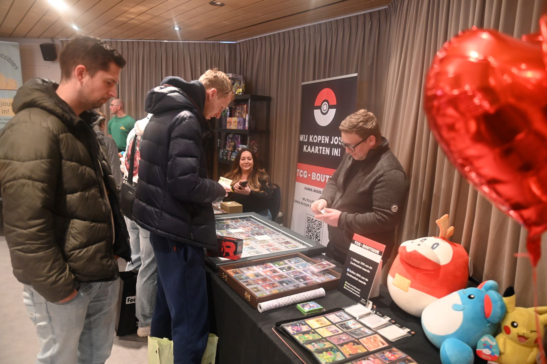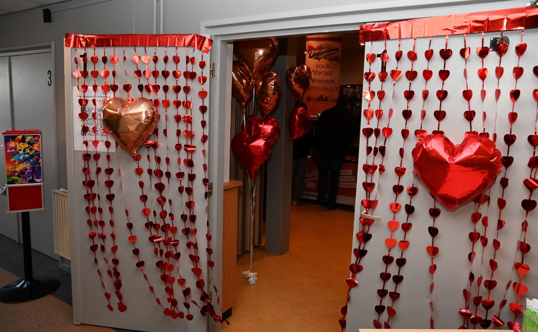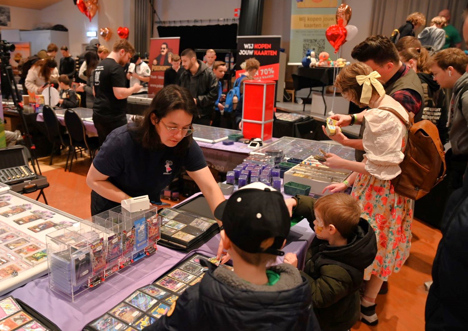 In De Stuw in Hoevelaken werd zaterdag 14 februari een Pokemon-beurs georganiseerd. En net zoals in Nijkerk twee weken geleden, was het ook in Hoevelaken bijzonder druk. Speciaal vanwege Valentijnsdag was De Stuw veranderd in een paradijs vol TCG-liefde. Iedereen kon langs standhouders struinen in een setting waar cupido’s pijlen vol TCG-passie rondvlogen. Foto Kees van den Heuvel