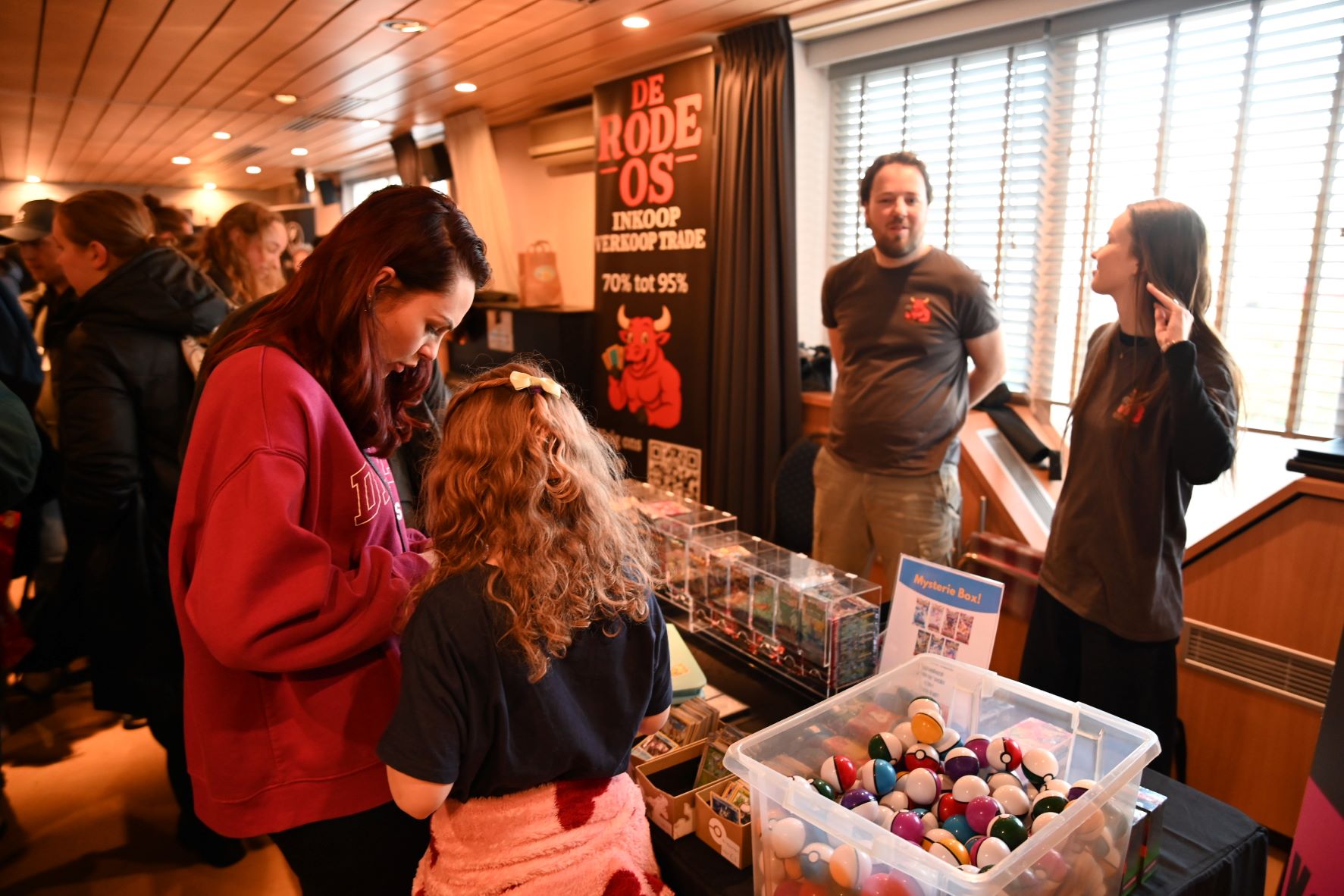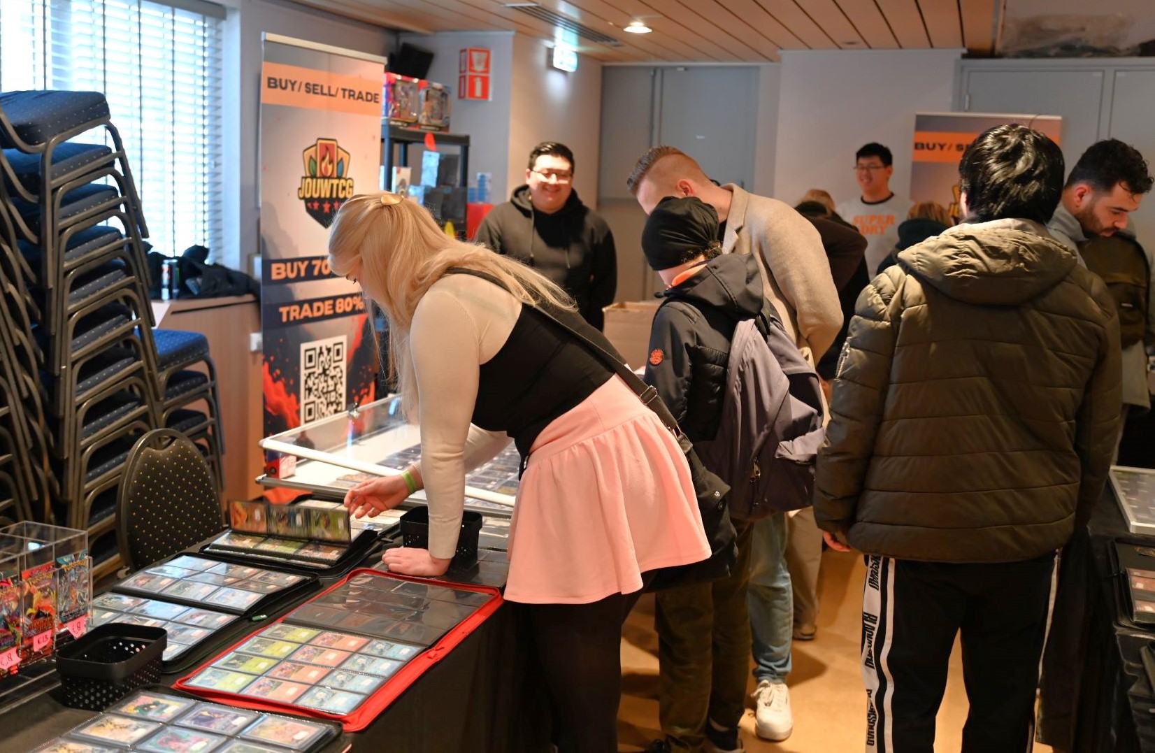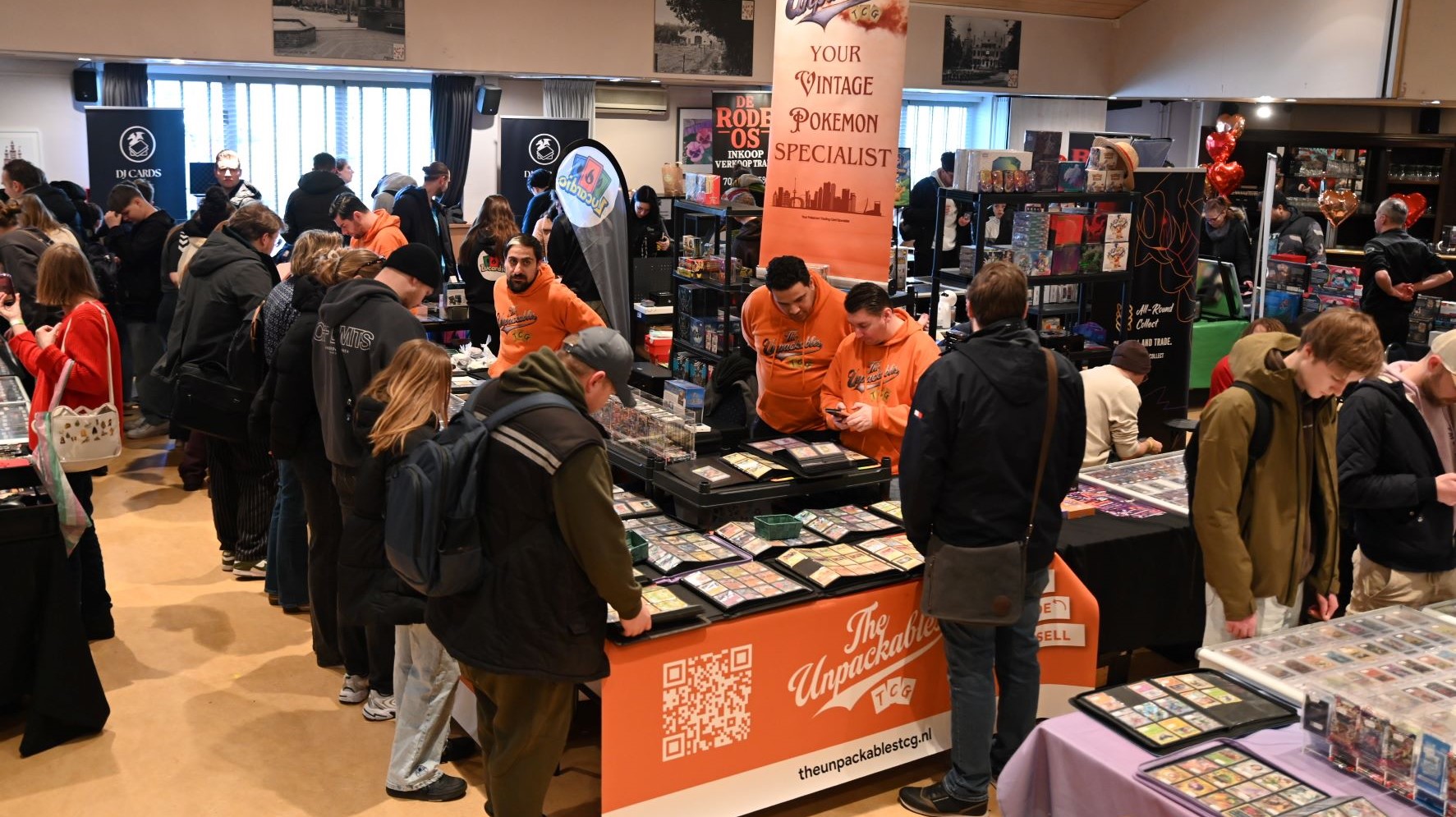 In De Stuw in Hoevelaken werd zaterdag 14 februari een Pokemon-beurs georganiseerd. En net zoals in Nijkerk twee weken geleden, was het ook in Hoevelaken bijzonder druk. Speciaal vanwege Valentijnsdag was De Stuw veranderd in een paradijs vol TCG-liefde. Iedereen kon langs standhouders struinen in een setting waar cupido’s pijlen vol TCG-passie rondvlogen. Foto Kees van den Heuvel