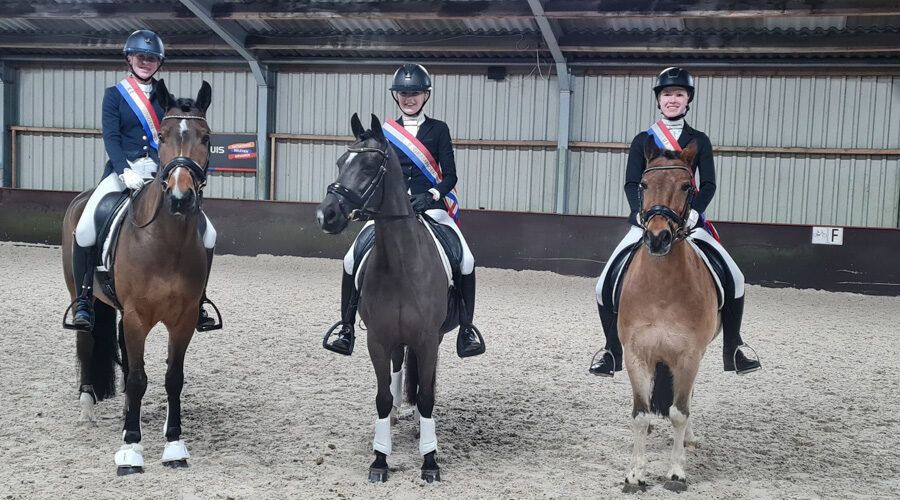 Ook Robine Smink kan als reservekampioen tevreden terugkijken op de dressuurselecties met Lady Star en clubgenote Mijke Helmons werd met haar pony Chanuh kringkampioen met super hoge punten in de B D/E. In dezelfde klasse plaatste Lynn van Amerongen zich als 5e voor het kampioenschap. Een super succesvol selectieweekend voor Ponyclub de Waaghalsjes.