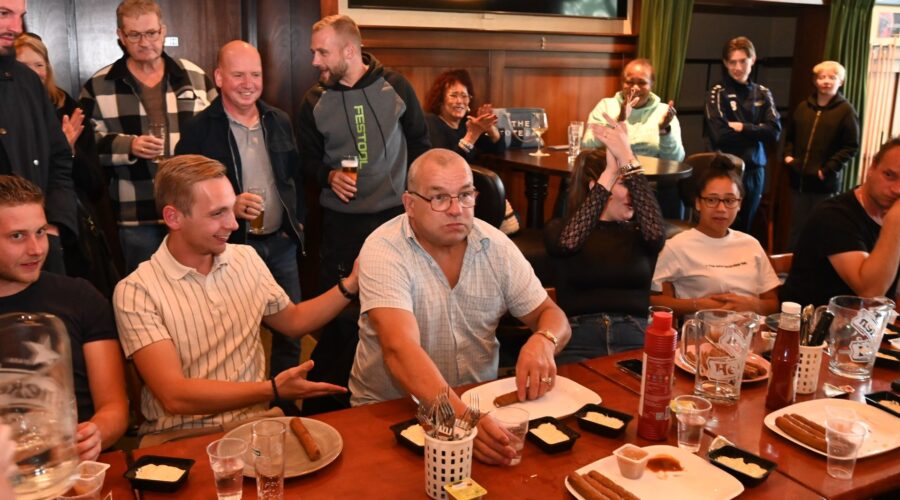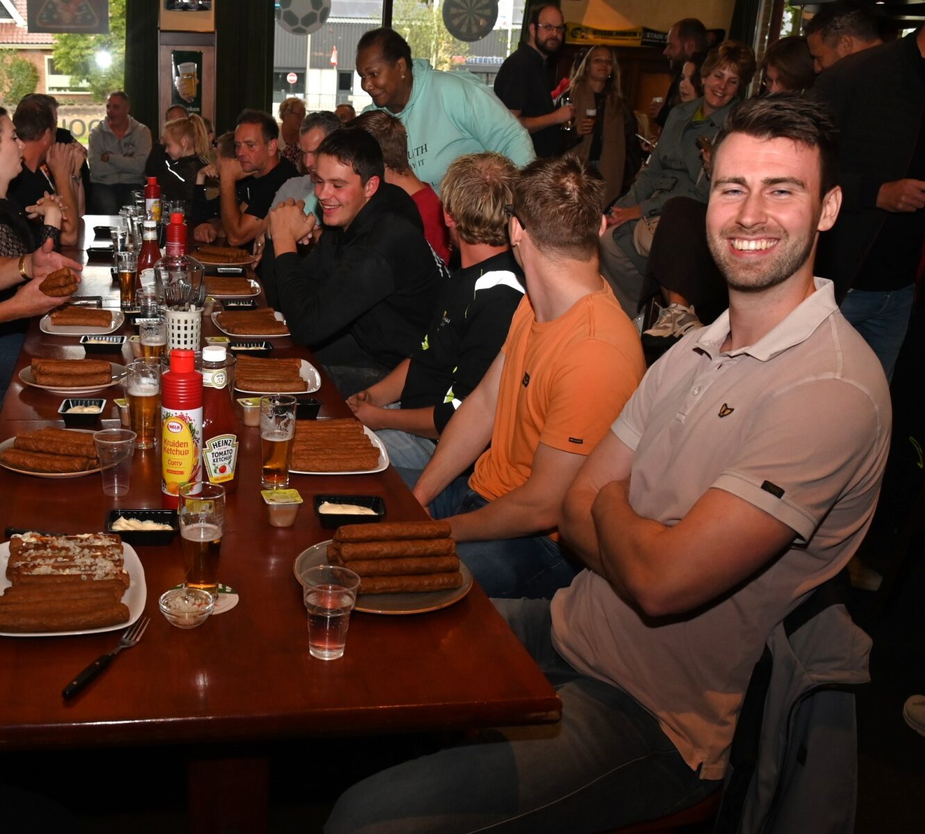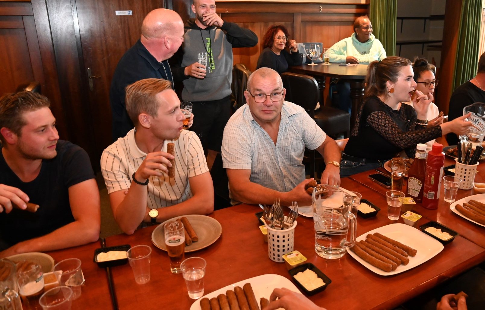 Eddy van de Beek is vrijdagavond 26 september uitgeroepen tot Nijkerks kampioen frikandellen eten. Dat kampioenschap vond plaats in sportcafé Watergoor. Er waren liefst zestien deelnemers. De tactiek van Eddy was om vier frikandellen tegelijk te eten. Uiteindelijk wist hij 17 frikandellen te verorberen. Dat is overigens nog geen record. Nummer 2 werd Teuno en het brons was voor Colin Blom. Uit handen van Marc van de Akker ontvingen de prijswinnaars een beker en voor de winnaar was er een tegoedbon van het sportcafé. Foto Kees van den Heuvel