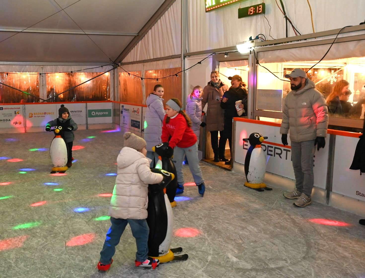 De Nijkerkse ijsbaan is nu bijna een week gaande op het Plein in Nijkerk en gezien de enorme belangstelling (er kan een maximum aantal schaatsers op de baan) kan nu al worden gesteld dat het een groot succes is. Vrijdagavond 12 december kon er voor het eerst worden deelgenomen aan het discodansen, met een lichtshow en veelal discoknallers uit de jaren zeventig en tachtig. Hiervoor dienen dan wel aparte kaarten te worden besteld (met een rode kleur voor een shift van twee uur). Foto Kees van den Heuvel