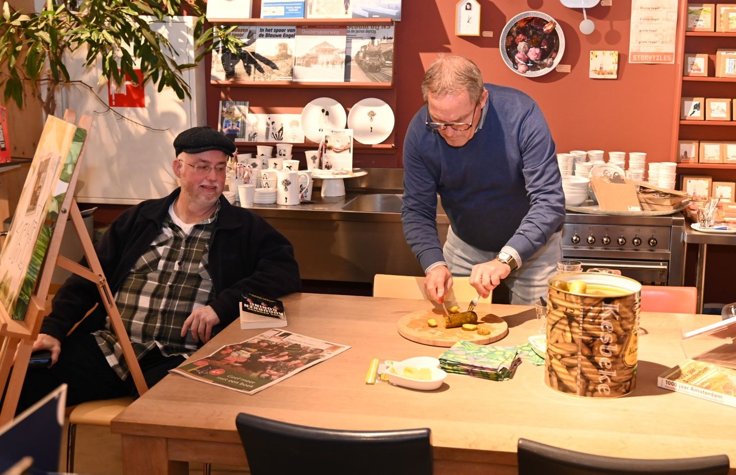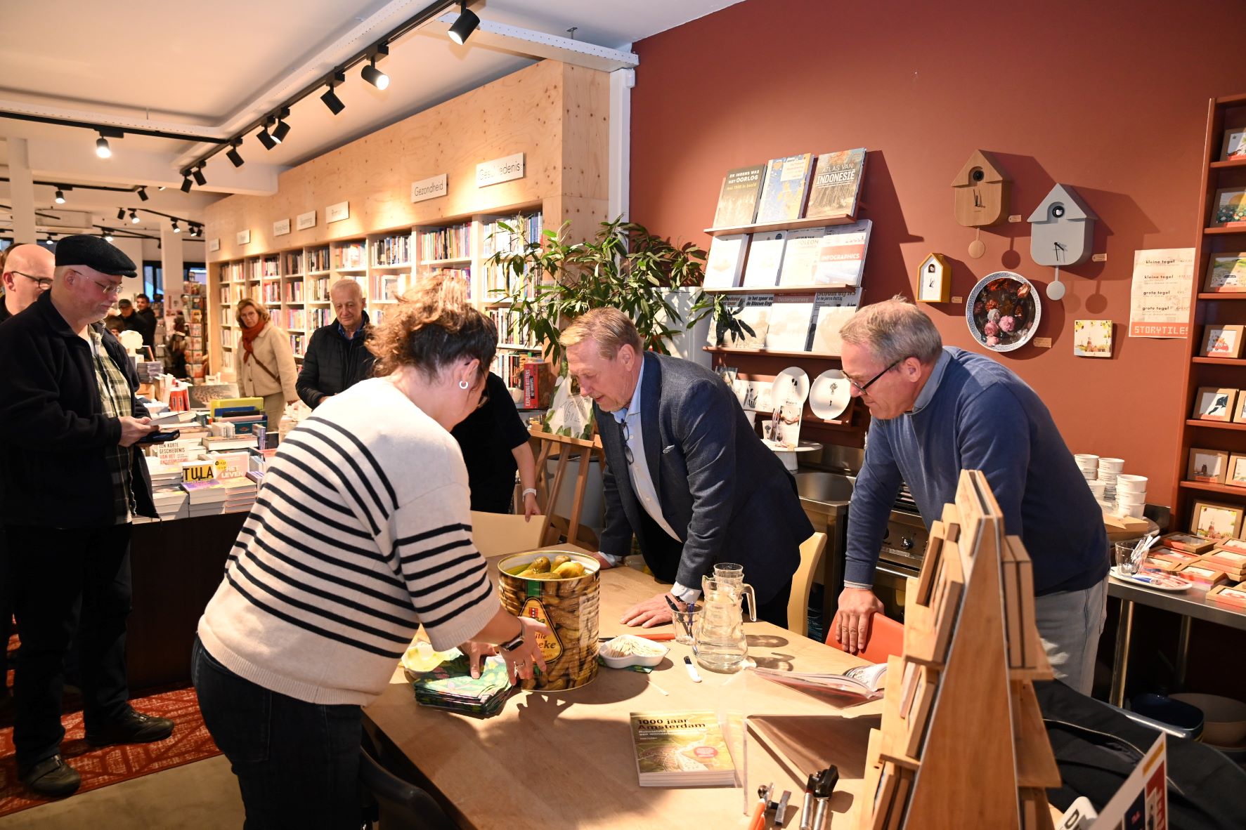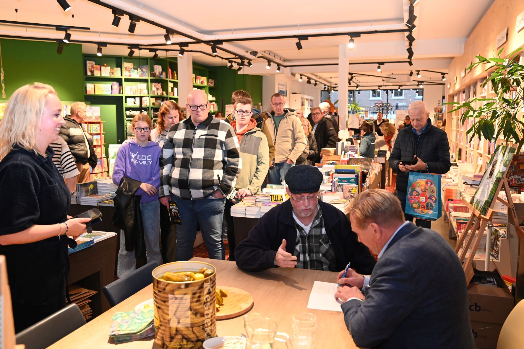 De rij stond tot twintig meter buiten de deur van boekhandel Roodbeen in Nijkerk. Zo groot was de belangstelling vrijdagmiddag 31 oktober voor de signeersessie met augurkenkoning Oos Kesbeke. Oos is bekend van het Amsterdamse familiebedrijf Kesbeke Fijne Tafelzuren. Hij was een kwartier te laat in Nijkerk maar daarna kregen alle fans de volle aandacht. Er was door Jan Lanting van Roodbeen zelfs een vat met echte Kesbeke augurken aangerukt die hij vlak voor de signeersessie nog in plakjes sneed. Oos Kesbeke is door de realityserie De Augurkenkoning een echte BN’er geworden. In het programma wordt het dagelijkse reilen en zeilen van de beroemde Amsterdamse tafelzurenfabriek gevolgd, die hij samen met zijn zoons Camiel en Silvian leidt. Foto Kees van den Heuvel