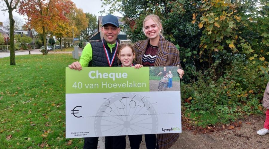Kirsten Drost was namens Lymph&Co bij de finish aanwezig en bedankte Martijn en Yara voor hun inzet. Daarna was het moment gekomen om de cheque in ontvangst te nemen. Martijn noteerde daarop het geweldige bedrag van 3.565 euro. De actie blijft echter nog een aantal weken open staan, zodat eventuele latere donaties nog aan het bedrag toegevoegd kunnen worden.