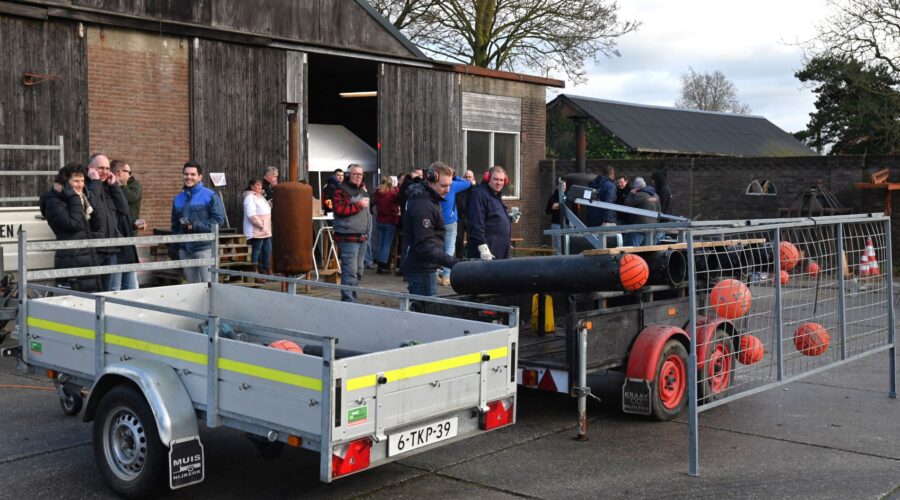 Niet alleen het Carbidteam Nijkerkerveen is actief met de feestelijke afsluiting van het jaar. Her en der in Nijkerkerveen staan groepjes feestvierders de laatste dag van het jaar 2025 onder de aandacht te brengen met carbidschieten. Zo wordt er ook flink geknald op de Vrouwenweg bij de familie Van den Brink. Daar is een arsenaal aan kanonnen geplaatst en zijn de meest gruwelijke klappen te horen. Een rooster houdt de weggeschoten ballen tegen. foto Kees van den Heuvel