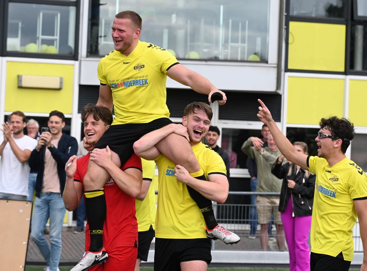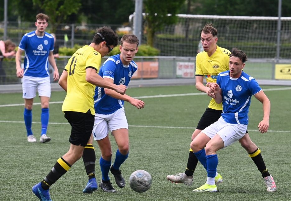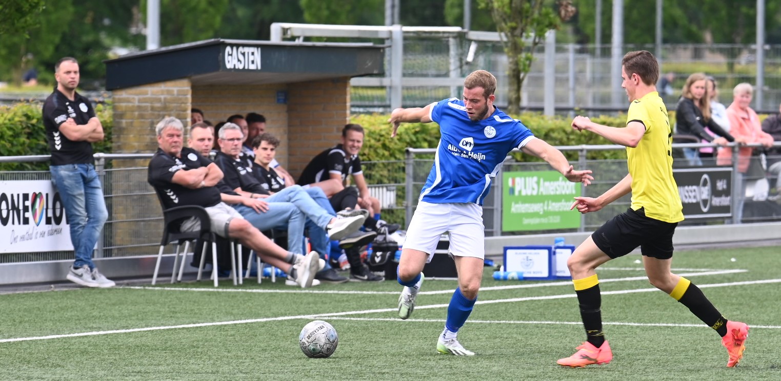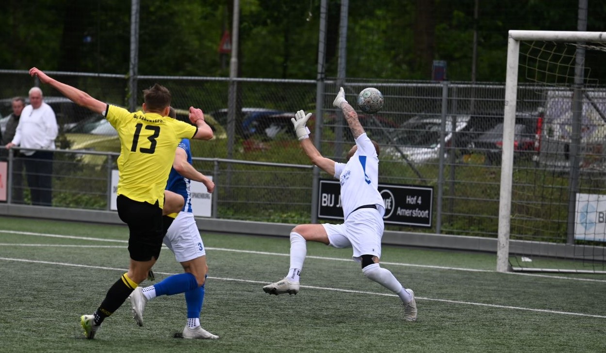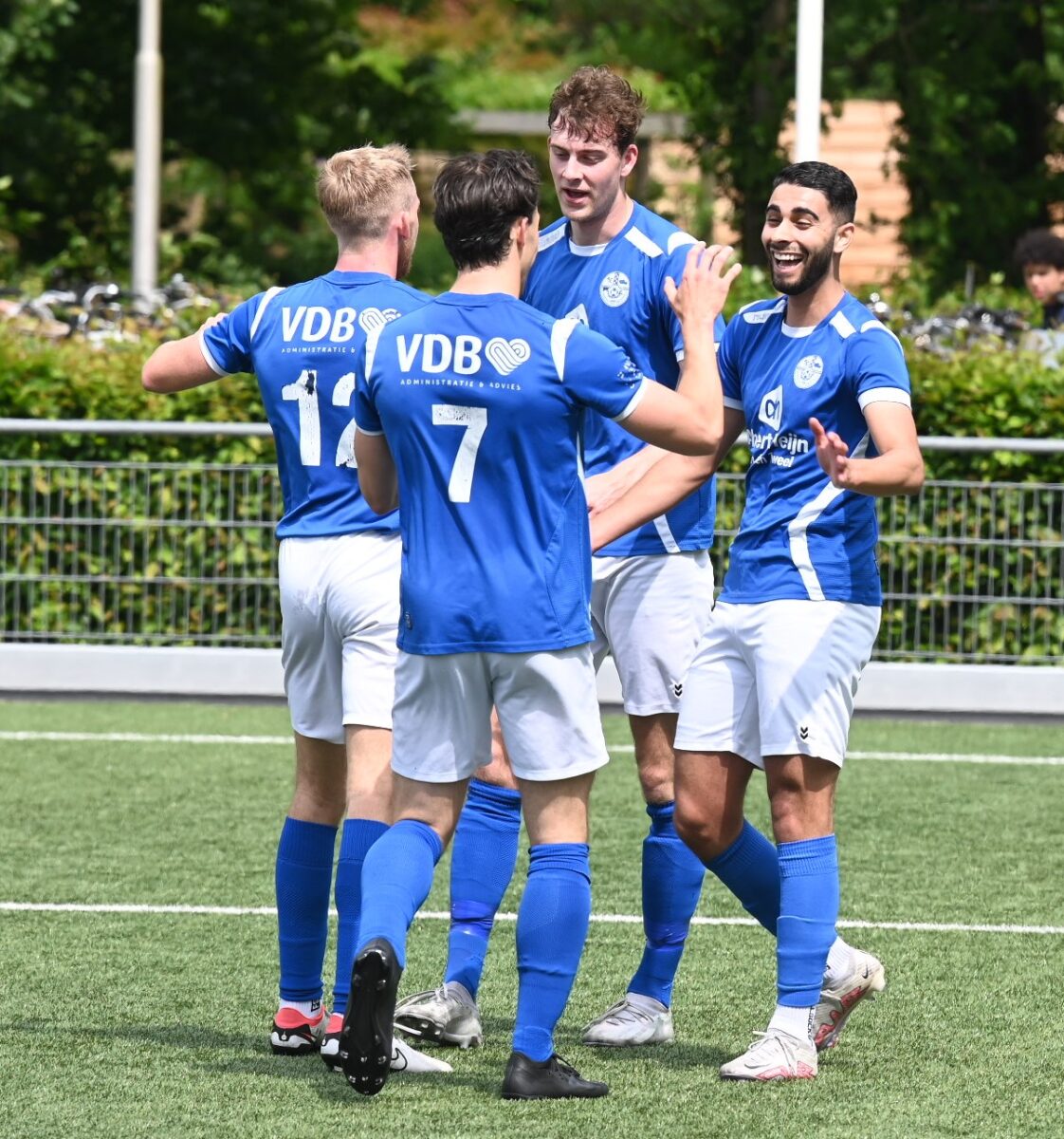Het laatste competitieduel van Veensche Boys tegen het Amersfoortse CJVV ging eigenlijk helemaal nergens meer over, omdat Veensche Boys reeds kampioen is en CJVV zich veilig heeft gespeeld. Toch werd het een verrassend levendige wedstrijd, waarin Veensche Boys vooral leek te werken aan het doelpuntensaldo. Het werd in Amersfoort liefst 5-7 in het voordeel van de club uit Nijkerkerveen. Na afloop was er uit respect voor de kampioen van de Tweede Klasse B een erehaag van de Amersfoorters. De goals namens Veensche Boys werden gemaakt door Corné Parol (4x), Nassim Barkoki (2x) en Julian Buitenhuis. Foto Kees van den Heuvel