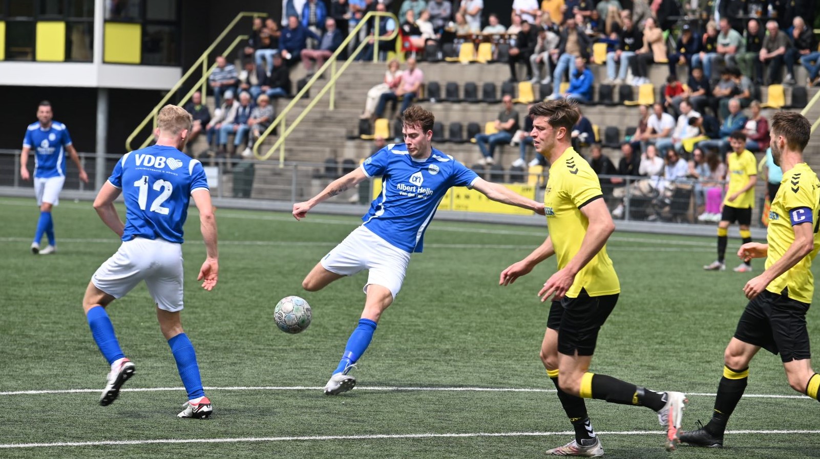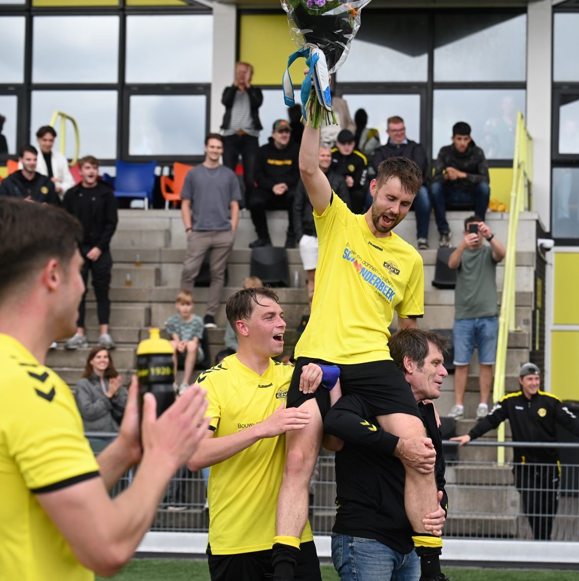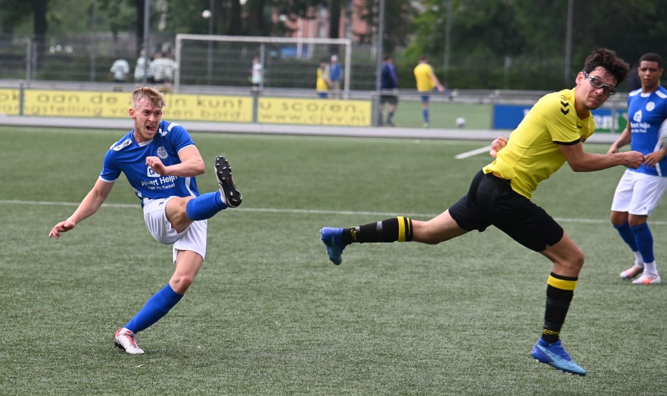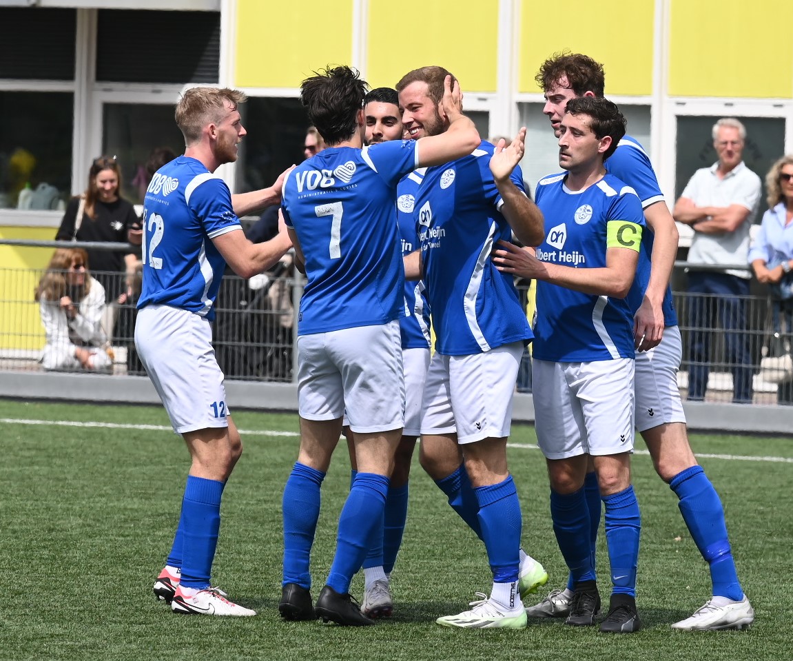Het laatste competitieduel van Veensche Boys tegen het Amersfoortse CJVV ging eigenlijk helemaal nergens meer over, omdat Veensche Boys reeds kampioen is en CJVV zich veilig heeft gespeeld. Toch werd het een verrassend levendige wedstrijd, waarin Veensche Boys vooral leek te werken aan het doelpuntensaldo. Het werd in Amersfoort liefst 5-7 in het voordeel van de club uit Nijkerkerveen. Na afloop was er uit respect voor de kampioen van de Tweede Klasse B een erehaag van de Amersfoorters. De goals namens Veensche Boys werden gemaakt door Corné Parol (4x), Nassim Barkoki (2x) en Julian Buitenhuis. Foto Kees van den Heuvel