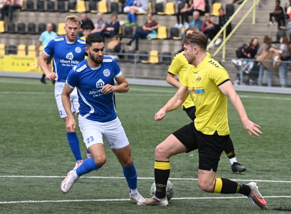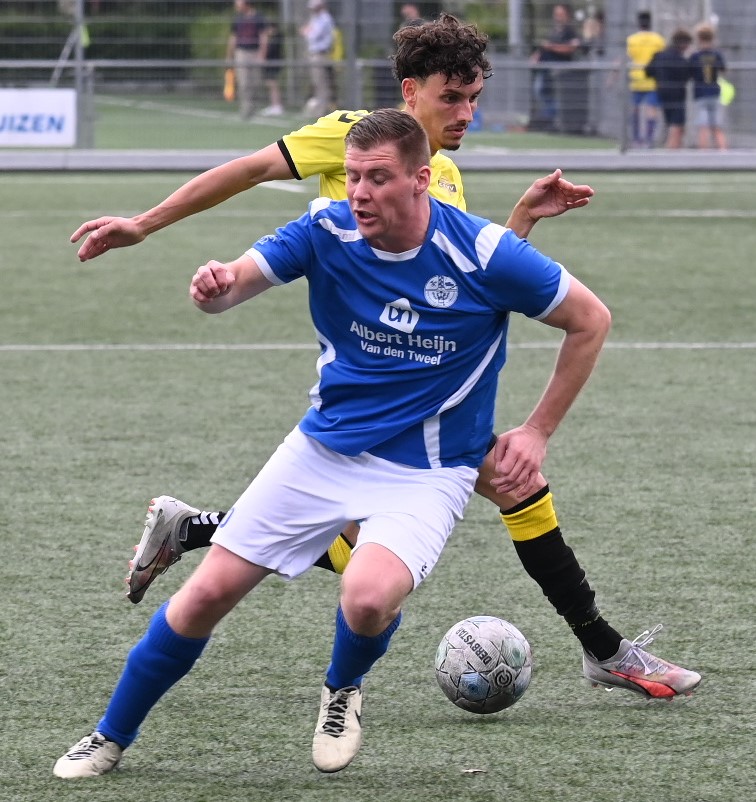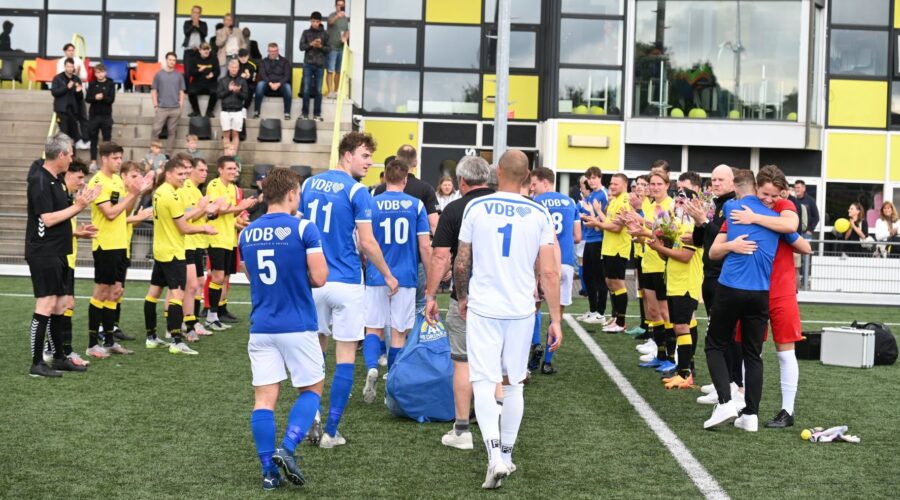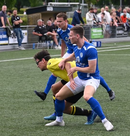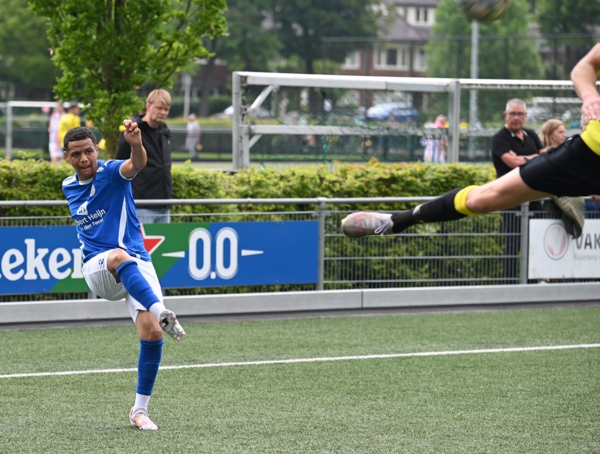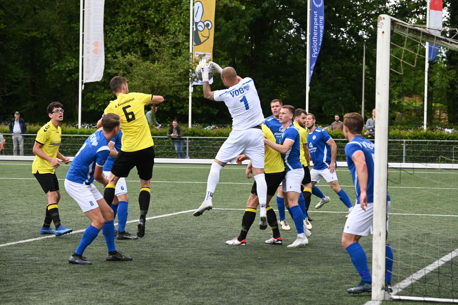Het laatste competitieduel van Veensche Boys tegen het Amersfoortse CJVV ging eigenlijk helemaal nergens meer over, omdat Veensche Boys reeds kampioen is en CJVV zich veilig heeft gespeeld. Toch werd het een verrassend levendige wedstrijd, waarin Veensche Boys vooral leek te werken aan het doelpuntensaldo. Het werd in Amersfoort liefst 5-7 in het voordeel van de club uit Nijkerkerveen. Na afloop was er uit respect voor de kampioen van de Tweede Klasse B een erehaag van de Amersfoorters. De goals namens Veensche Boys werden gemaakt door Corné Parol (4x), Nassim Barkoki (2x) en Julian Buitenhuis. Foto Kees van den Heuvel
