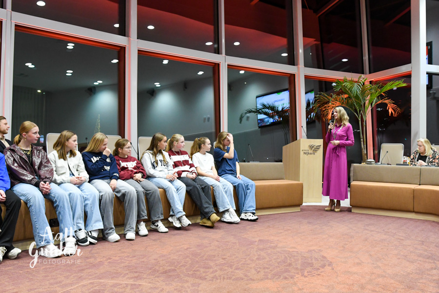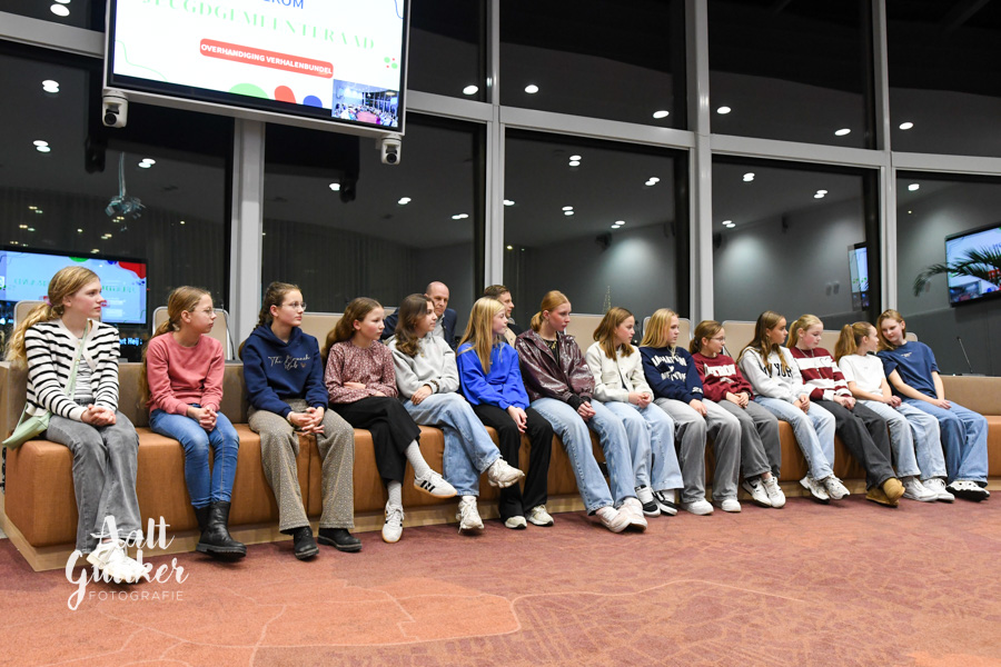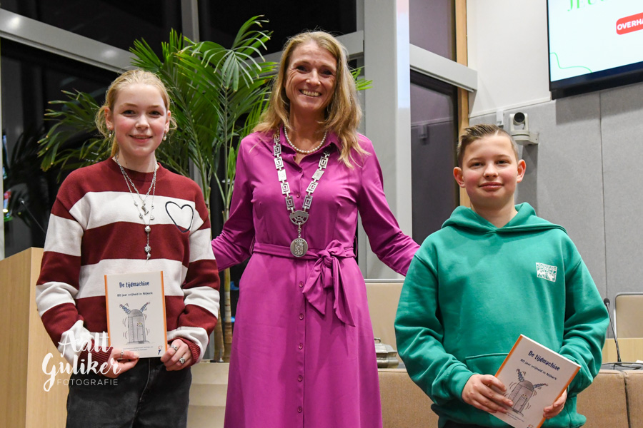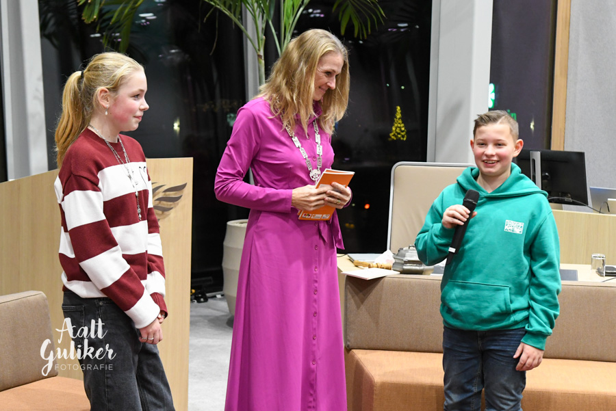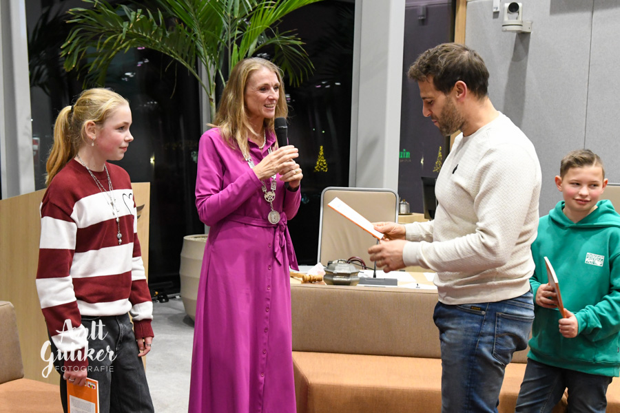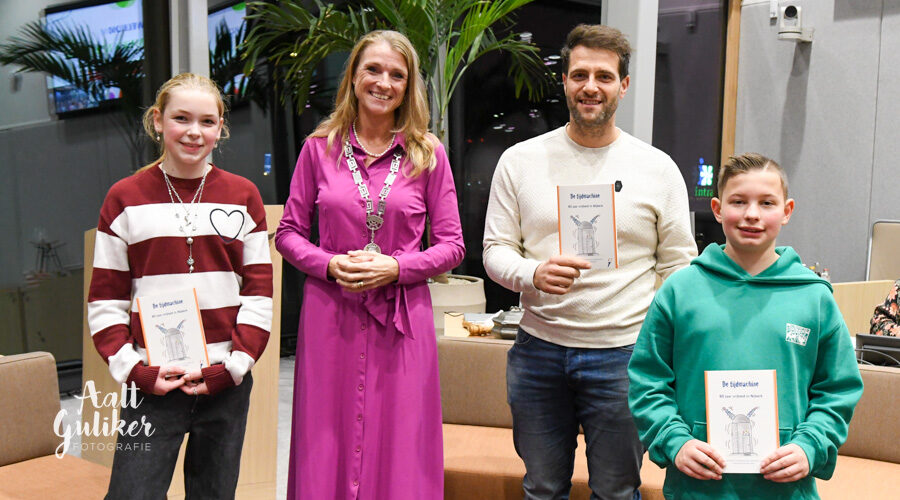 In de raadszaal van het Nijkerkse Stadhuis vond afgelopen donderdagavond de feestelijke uitreiking plaats van het verhalenboekje dat is gemaakt binnen het winnende plan van basisschool De Hoeksteen. De leerlingen Aidan en Tess kregen het eerste exemplaar uitgereikt door Burgemeester Tinet de Jonge.