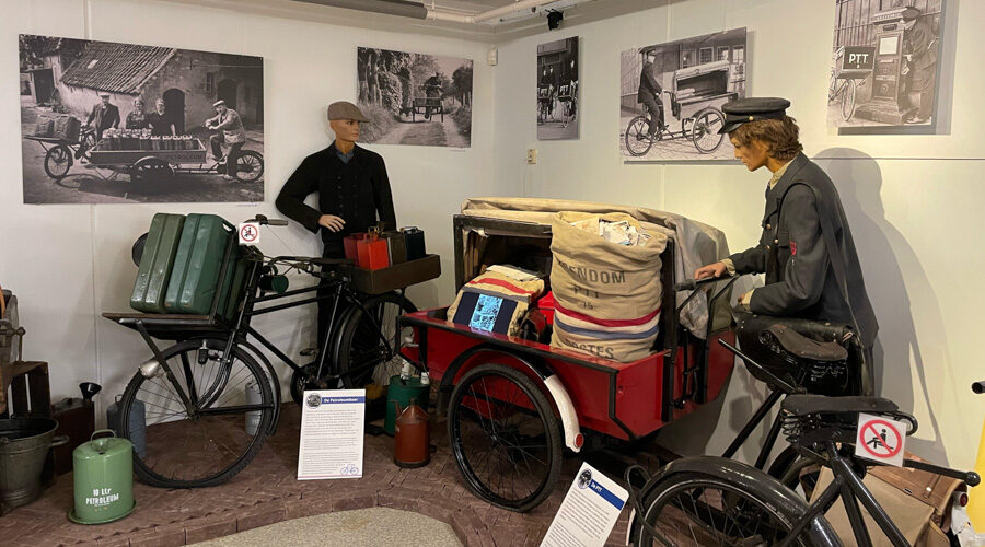 De expositie ‘100 jaar Fietsend Nederland’ neemt de museumbezoekers mee terug in de tijd en toont de rijke geschiedenis van de fiets in Nederland. De fiets had vroeger vele vormen en uitvoeringen; de hoge bi, de transportfiets, de bakfiets, de loopfiets, de driewielfiets en nog veel meer. Ook ‘vergeten’ beroepen, zoals de voddeboer, ketellapper, lantaarnopsteker en veldwachter worden niet overgeslagen tijdens deze oer-Nederlandse expositie. Al deze beroepen werden voornamelijk uitgevoerd per fiets en kwamen in de oude tijd dan ook veel voor. Een groot aantal zijn zelfs niet eens bekend bij de jongere generaties onder ons. Zo staat ook de ‘Porder’ bij de expositie uitgebeeld; deze beste man ging voor dag en dauw de straten langs om iedereen die aan de arbeid moest ‘wakker te porren’. Of de Dorpsomroeper, die per fiets en met een grote bel aan het stuur en de toeter of hoorn in de hand door de dorpsstraten reed voor nieuwsberichten. Naast deze officiële berichten bracht hij ook (betaalde) commerciële boodschappen voor bedrijven rond. Wie kent deze verhalen nog…?!