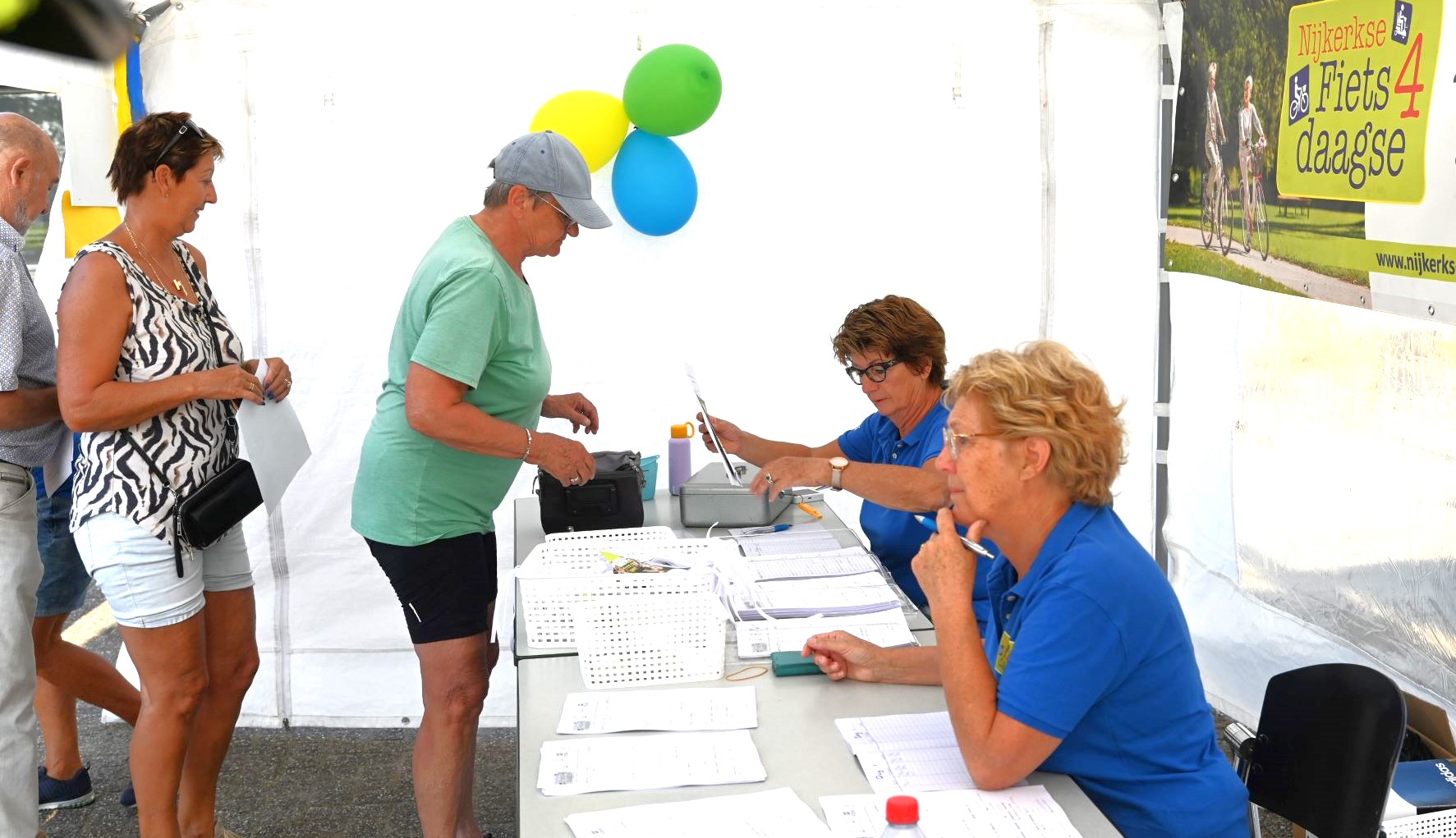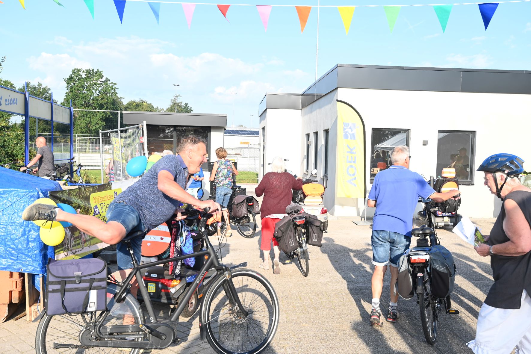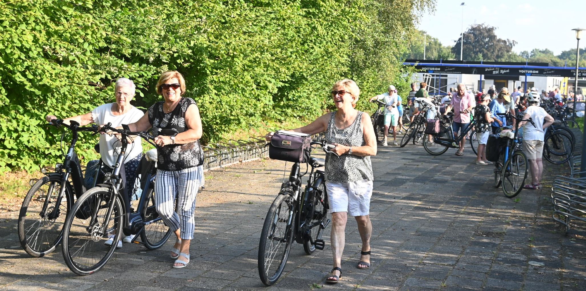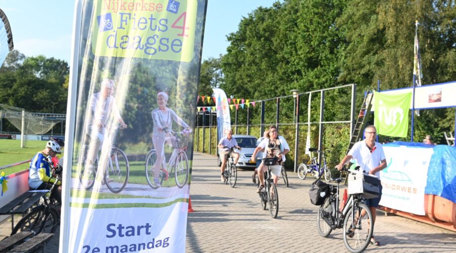 Geholpen door de zonnige weersomstandigheden zijn maandagmorgen 11 september circa 800 deelnemers op pad gegaan voor de eerste dag van de UVV fietsvierdaagse in Nijkerk. Omstreeks 600 deelnemers meldden zich digitaal aan en er sloten naar verwachting nog ruim 200 deelnemers spontaan aan. Het startpunt was de NSC Burcht in Nijkerk. De mensen kregen een appel mee voor onderweg en daarna deed Jan Verweij van de UVV uitgeleide. Ook een delegatie van de ScootAngels, de scootmobielclub, nam deel. De opkomst van de Fietsvierdaagse in Nijkerk was boven verwachting, zo concludeerde de organisatie. De deelnemers kwamen overigens niet alleen uit Nijkerk. Uit alle provincies waren de fietsers afkomstig en er waren zelfs zes deelnemers uit Belgie. Foto Kees van den Heuvel