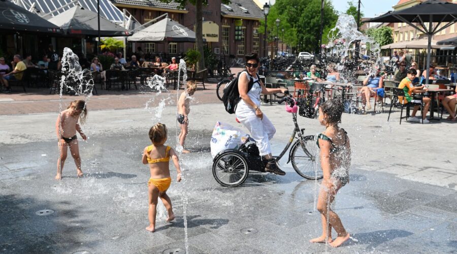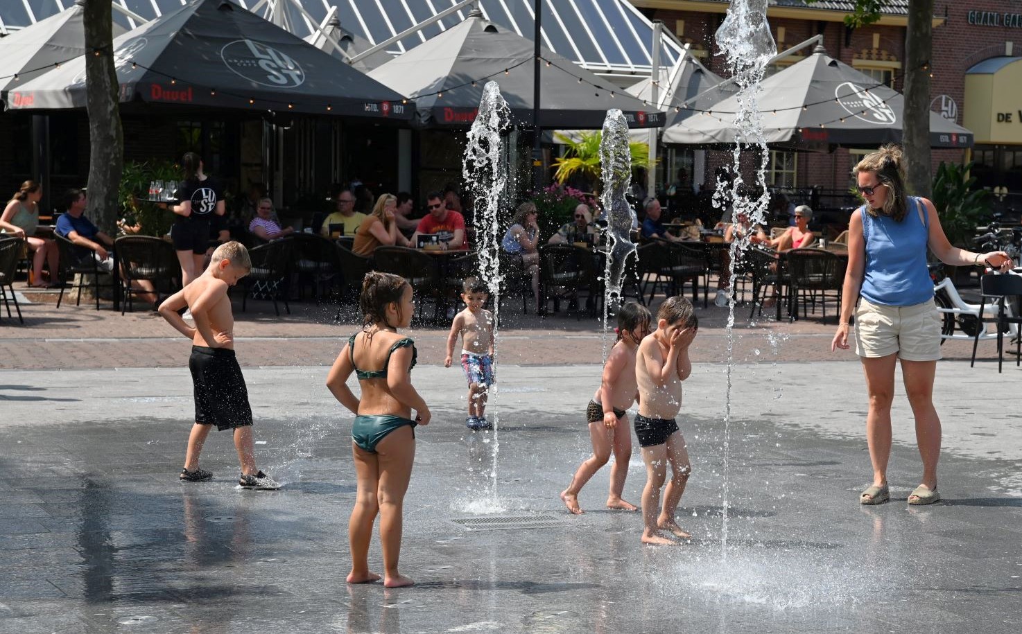 De fonteintjes op het Plein in Nijkerk zijn niet altijd in werking, maar als ze eenmaal spuiten, dan is het ook een ware attractie. Het is immers onder deze warme weersomstandigheden een koele afleiding. En niet alleen jonge kinderen genieten ervan, ook ouderen lopen of rijden door de waterstralen heen, zoals Maud die er intens van genoot om met haar fiets een fris bad te halen. Foto Kees van den Heuvel