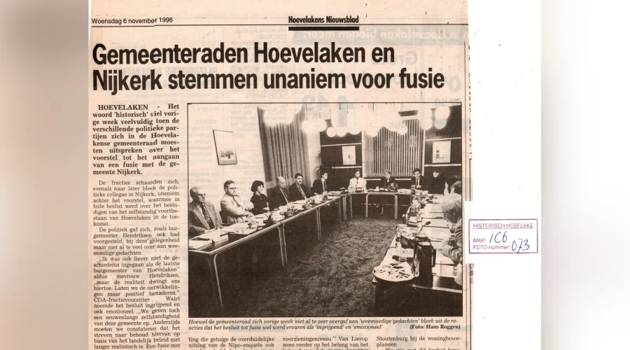 Er volgde een periode van voorbereiding. Beleid werd bevroren, ambtenaren werkten aan de fusie, en politieke partijen zochten samenwerking. In 1998 werd een deel van Hoevelaken rond het klaverblad afgestaan aan Amersfoort. De naam van de nieuwe gemeente werd Nijkerk, tot teleurstelling van veel Hoevelakers, al kreeg het nieuwe wapen ook symboliek uit Hoevelaken mee. Eind 1999 werd het afscheid van het zelfstandige Hoevelaken groots gevierd. Er kwam een tentoonstelling, een boek, een kunstwerk, herdenkingsbekers voor kinderen en een vuurwerkshow bij Huis Hoevelaken. Op 3 januari 2000 ontvingen alle inwoners een brief van burgemeester Bartele Vries, met de belofte dat Hoevelaken zijn eigen karakter zou behouden. Nu, 25 jaar later, wordt teruggeblikt op een fusie die, ondanks zorgen en teleurstellingen, goed heeft uitgepakt. Hoevelaken bleef een herkenbare dorpskern binnen de gemeente Nijkerk.