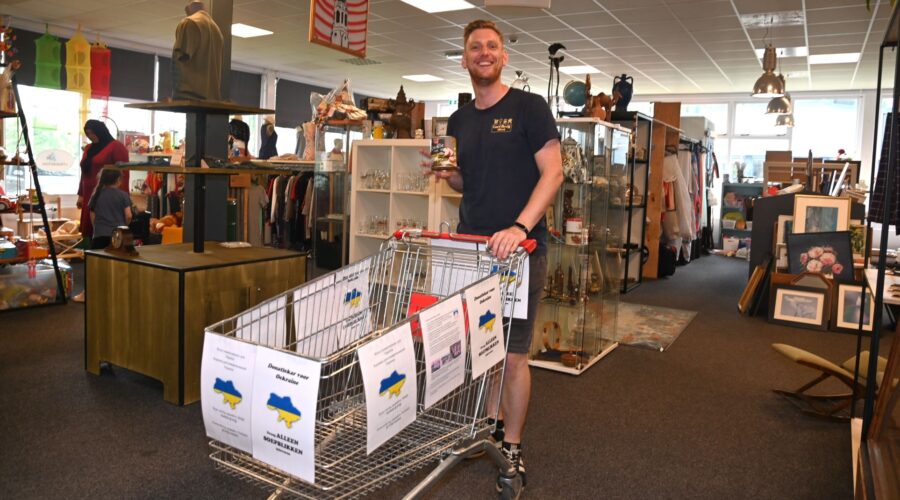 Kringloopwinkel Goed Bezig in Nijkerk is donderdag 10 augustus gestart met een soepblikkenactie voor Oekraïne. Iedereen kan een blik soep (of groente) doneren in een grote boodschappenkar die staat in de kringloopwinkel aan de Nijverheidsstraat 7. Ook de Nijkerkse kerken De Fontein en de Kruiskerk doen hieraan mee. De blikken soep worden na verloop van tijd verzameld en getransporteerd naar de gebieden waar de nood het hoogst is in Oekraïne. Foto Kees van den Heuvel